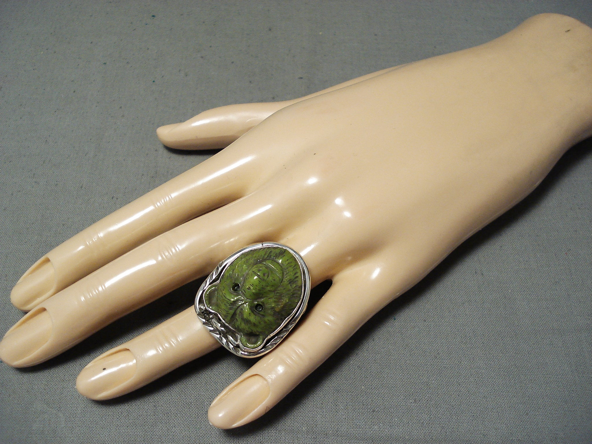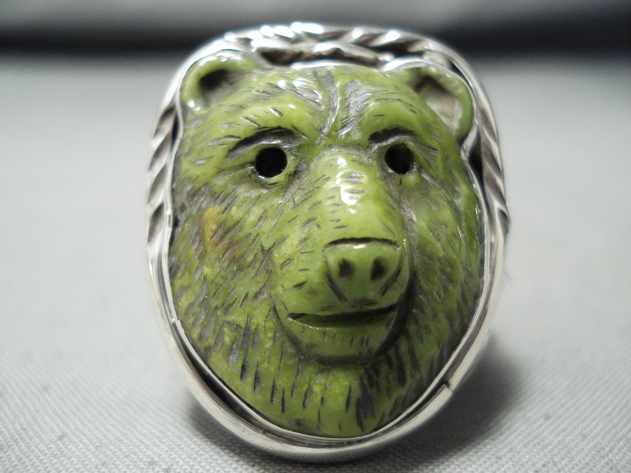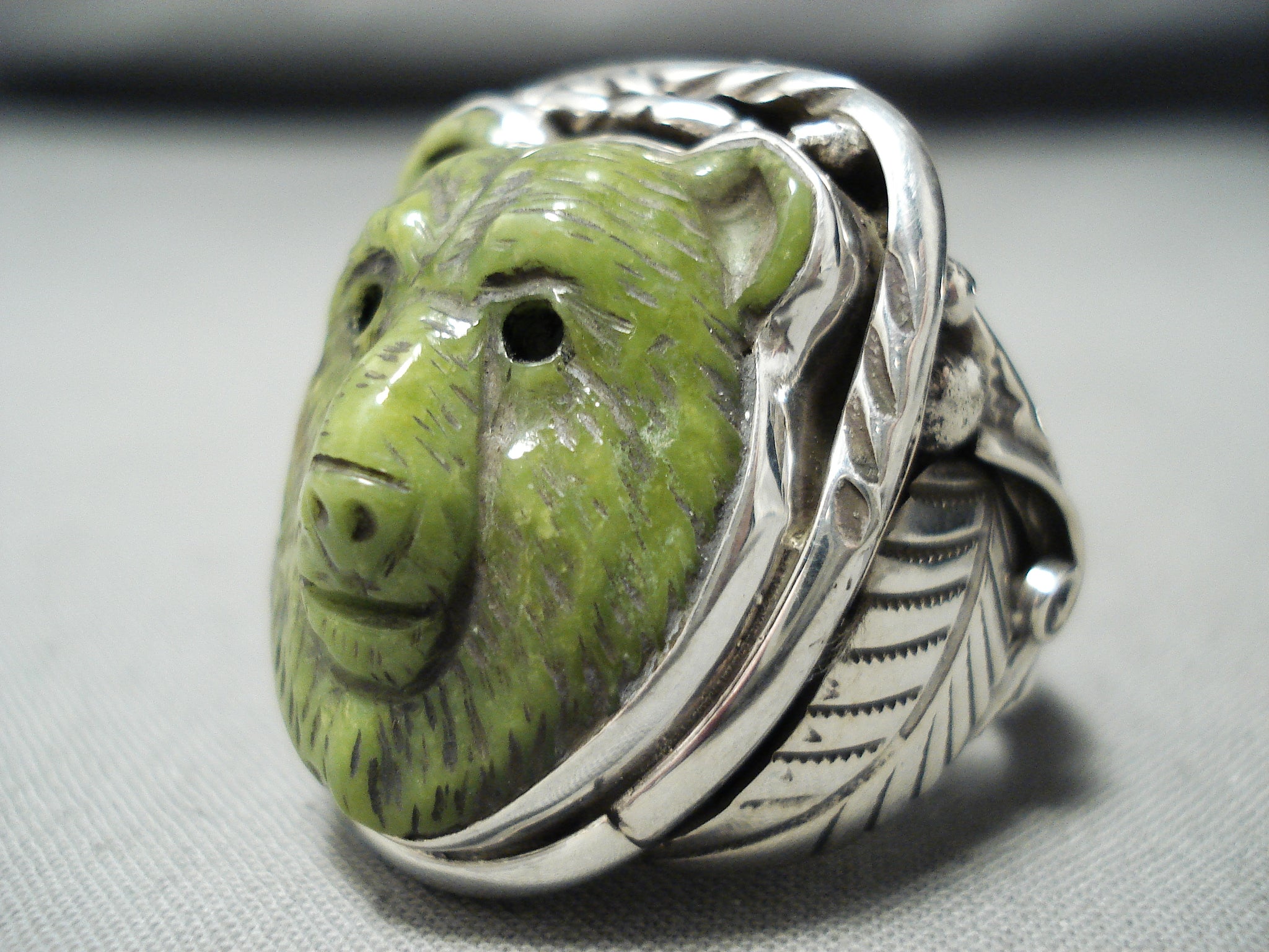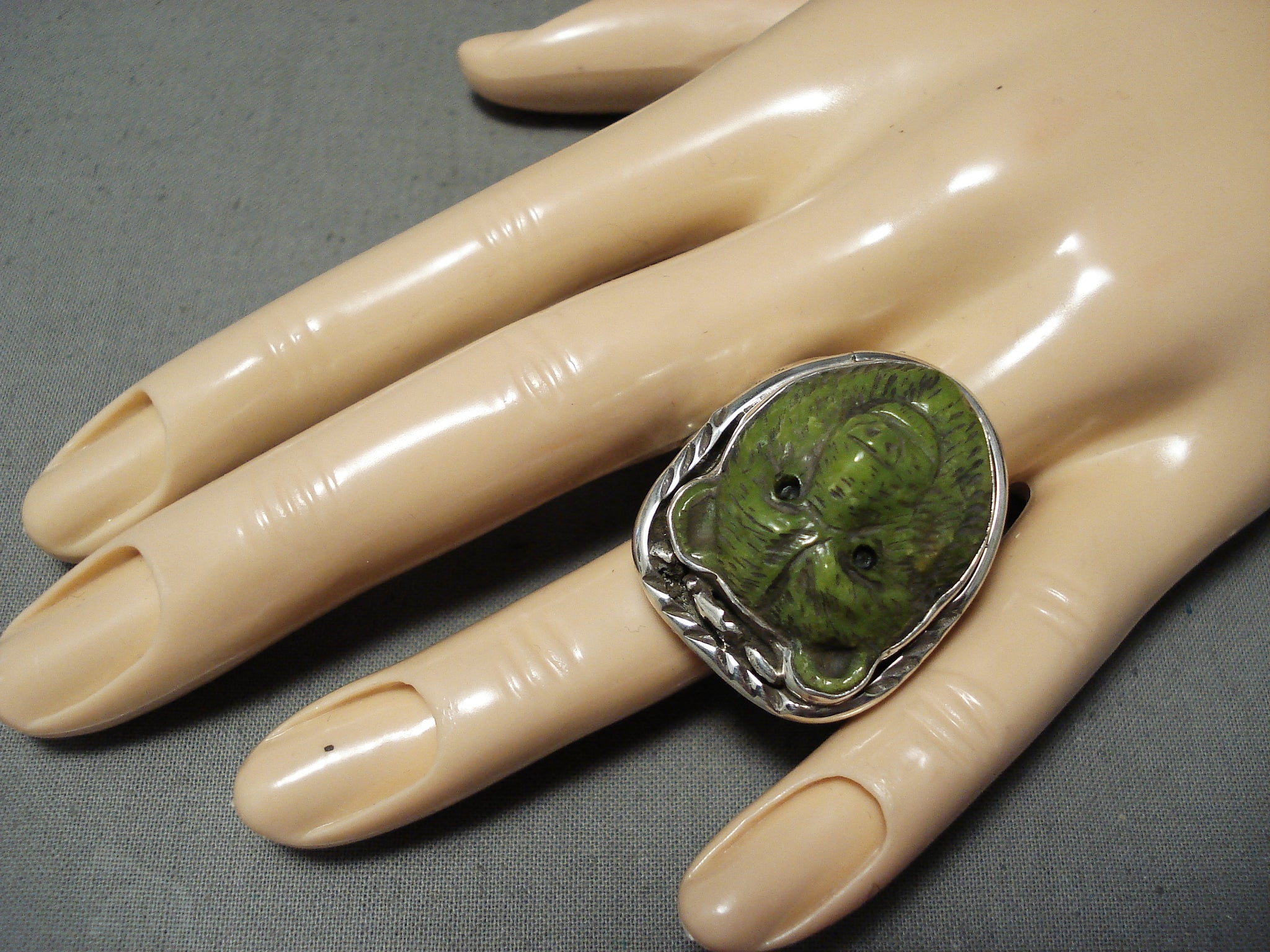 Native American Important Intricate Hand Carved Bear Jade Sterling Silver Ring