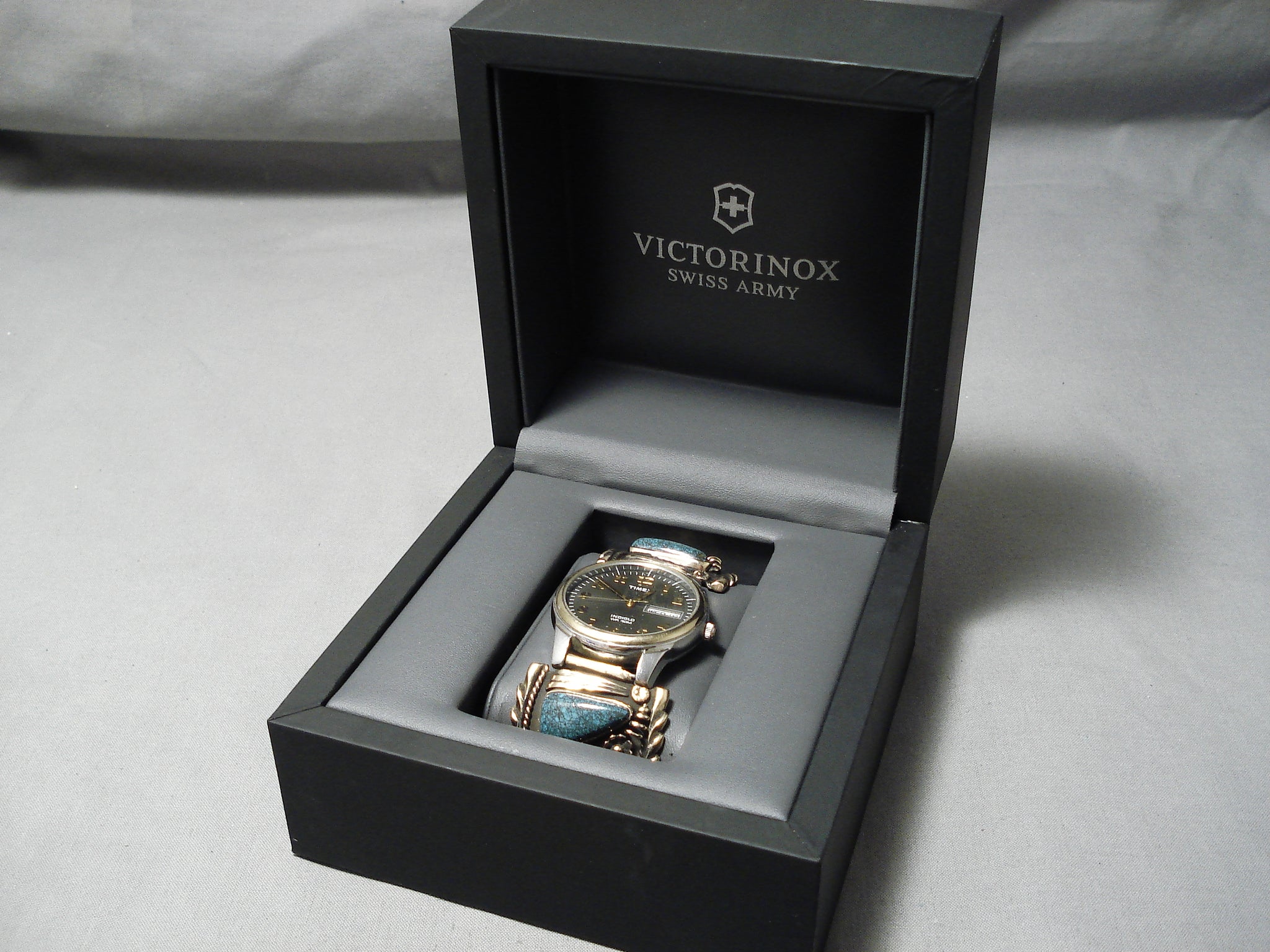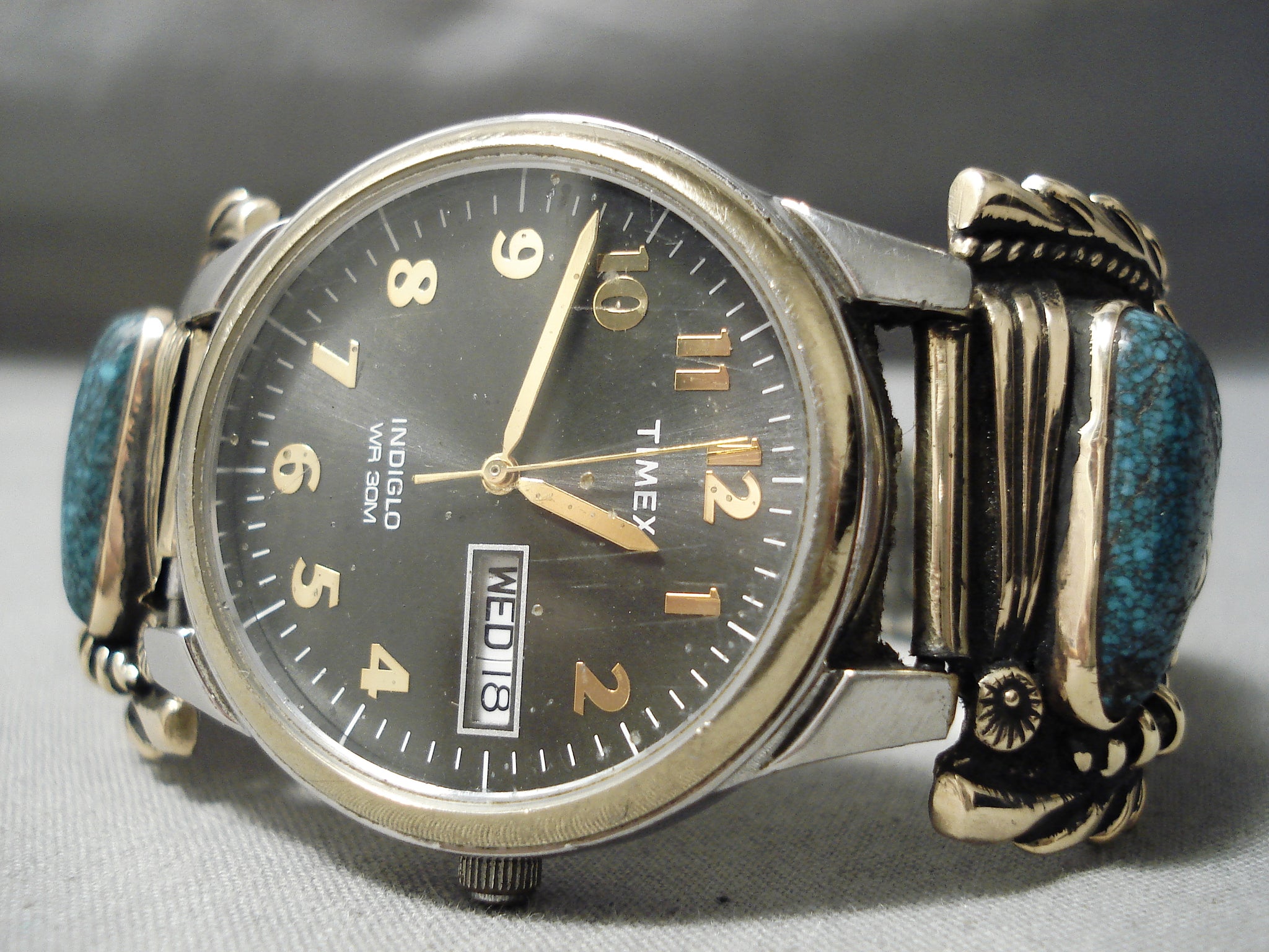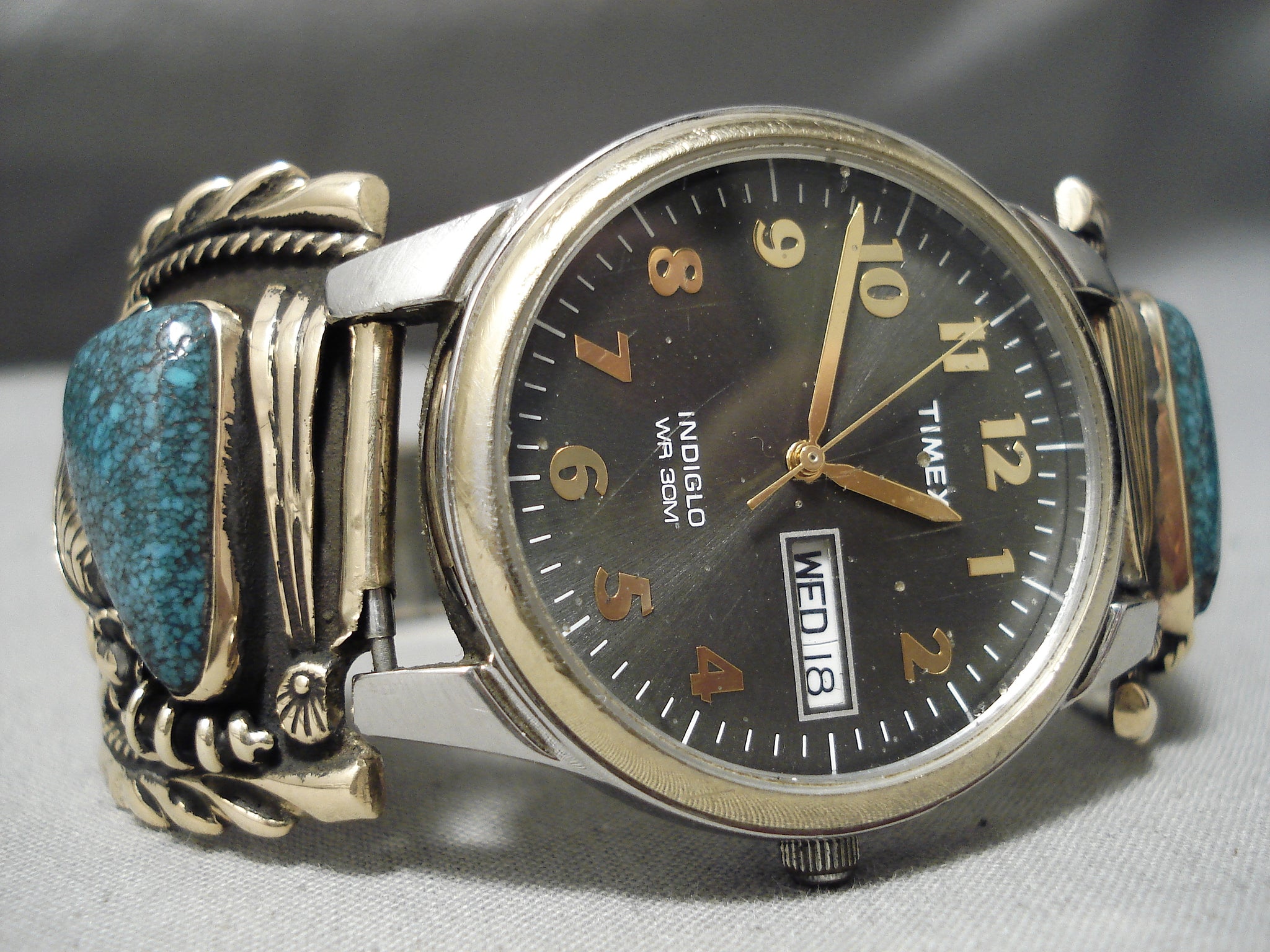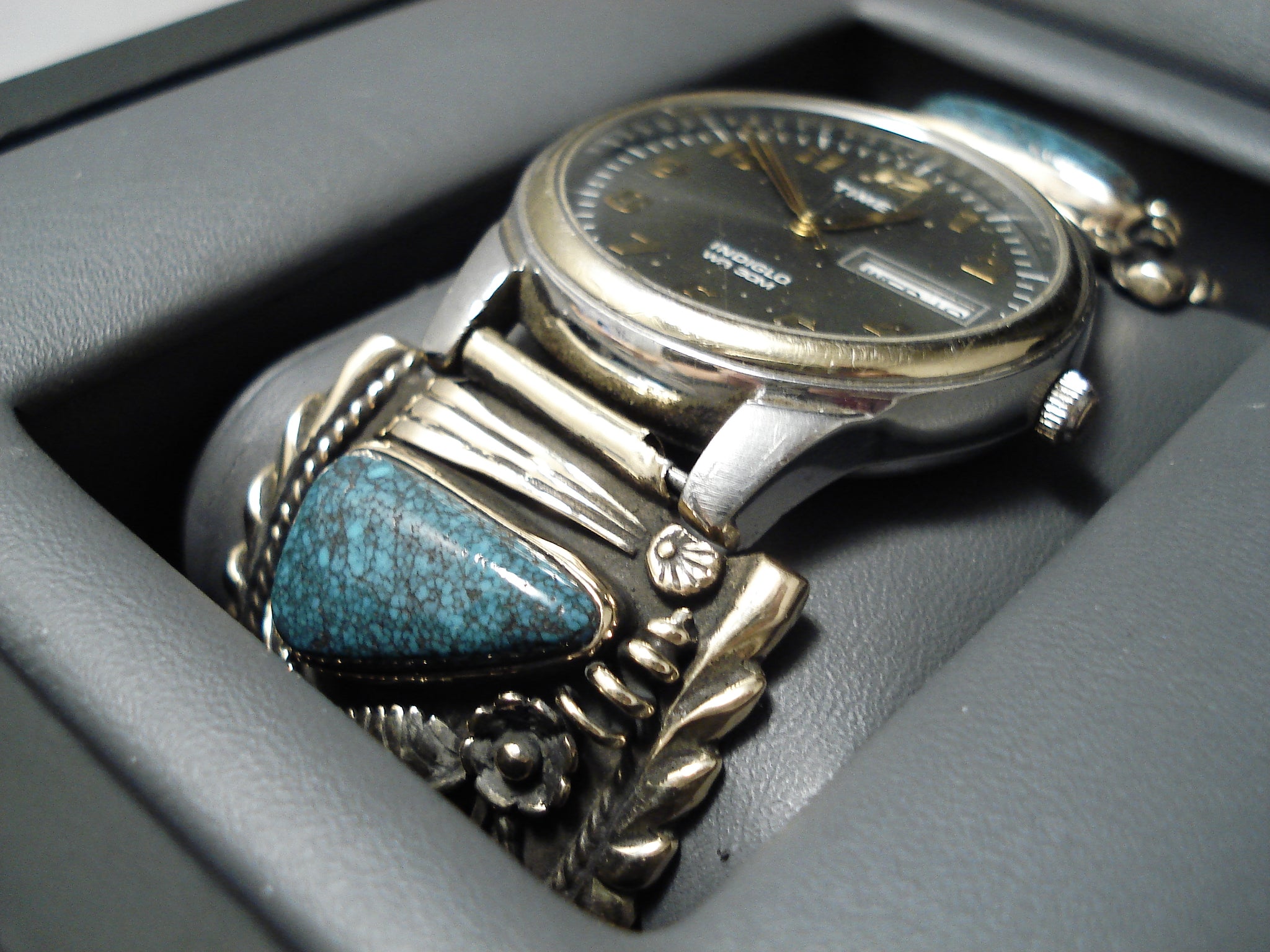 Native American Important Lander Blue Turquoise Gold Sterling Silver Watch Bracelet
