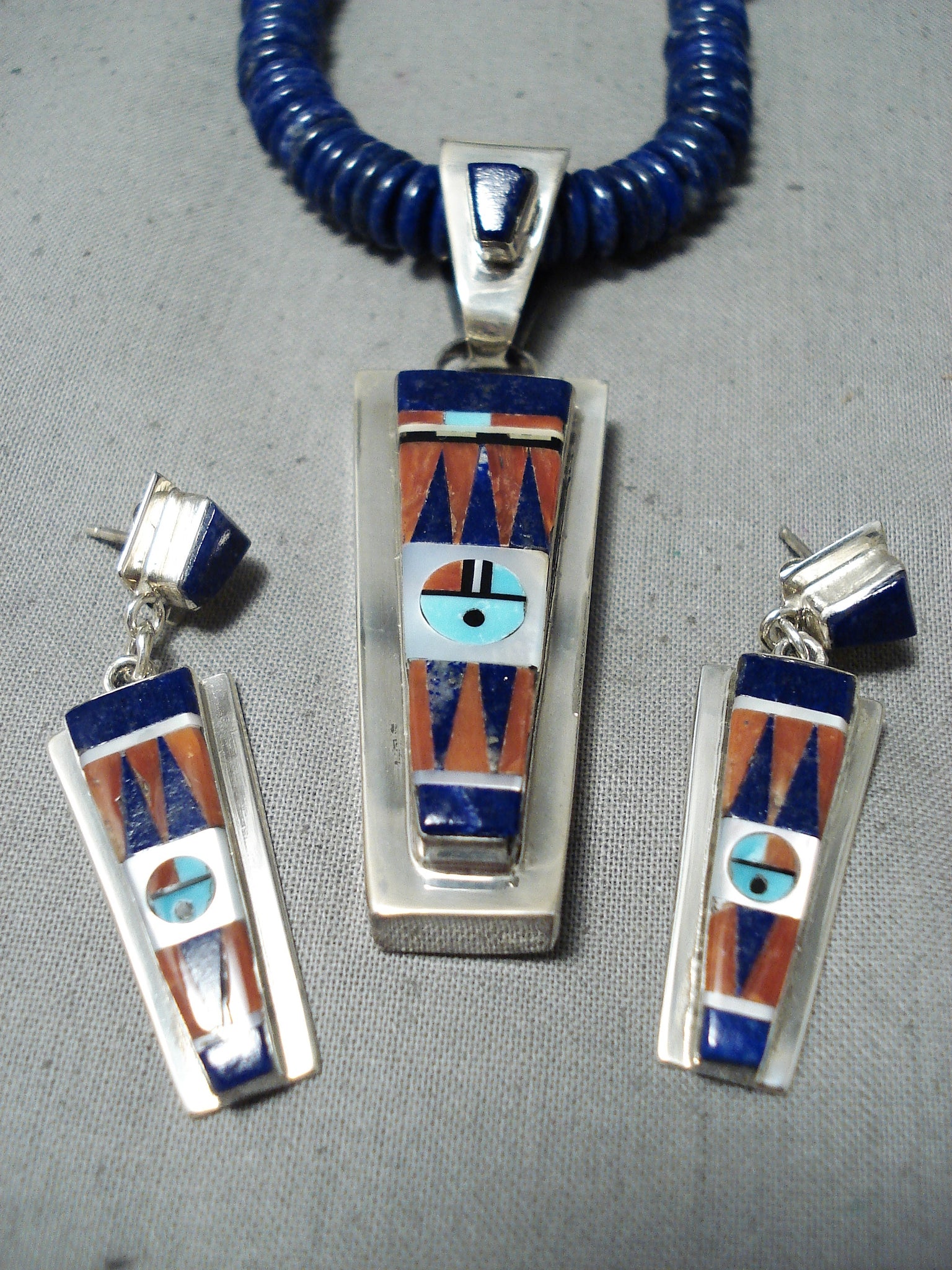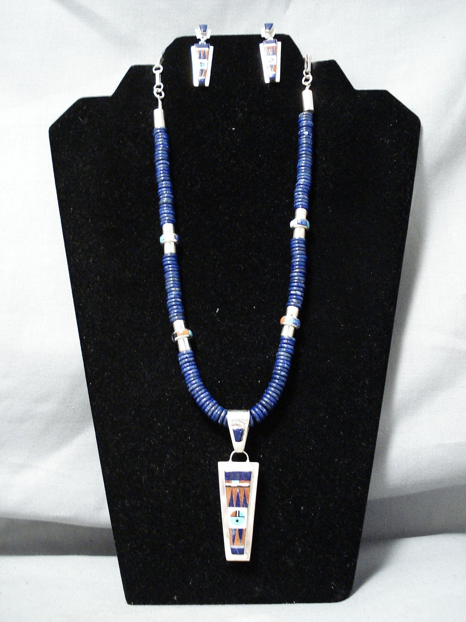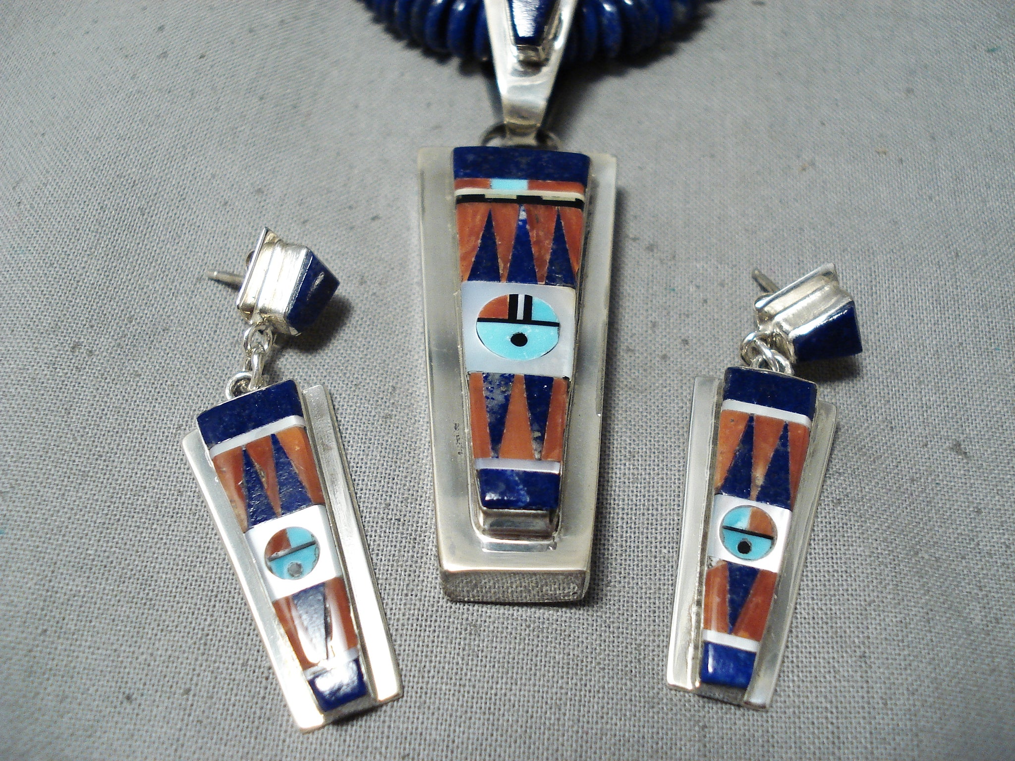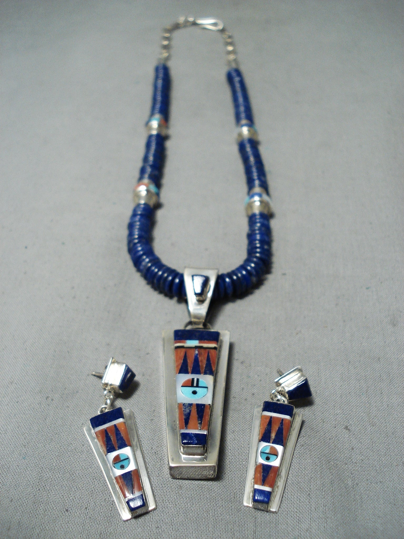 This is an astonishing vintage Zuni inlaid lapis and silver necklace being one of the best Zuni lapis inlaid necklaces we have recently collected. This wonderful piece contains a remarkable inlaid silver pendant that consists of lapis, coral, mother of pearl, and onyx. The wonderful pendant measures around 2-3/8" X 7/8". Resting throughout the necklace are impeccable rounded inlaid silver beads that are just amazing. The majority of the necklace consists of intricately hand carved thick disc shaped lapis stones. This impeccable necklace can be adjustable in length as the shortest it measures is around 23*-1/2" while the long length measures around 25". What I absolutely love about this necklace is that it comes with a beautiful matching pair of inlaid silver earrings. Each earring matches the pendant and measures around 1-1/2" X 1/2". Sterling silver, marked. Cir. 1970's+. Signed by Zuni artist, Ray Edaaki. Sturdy 78 grams.