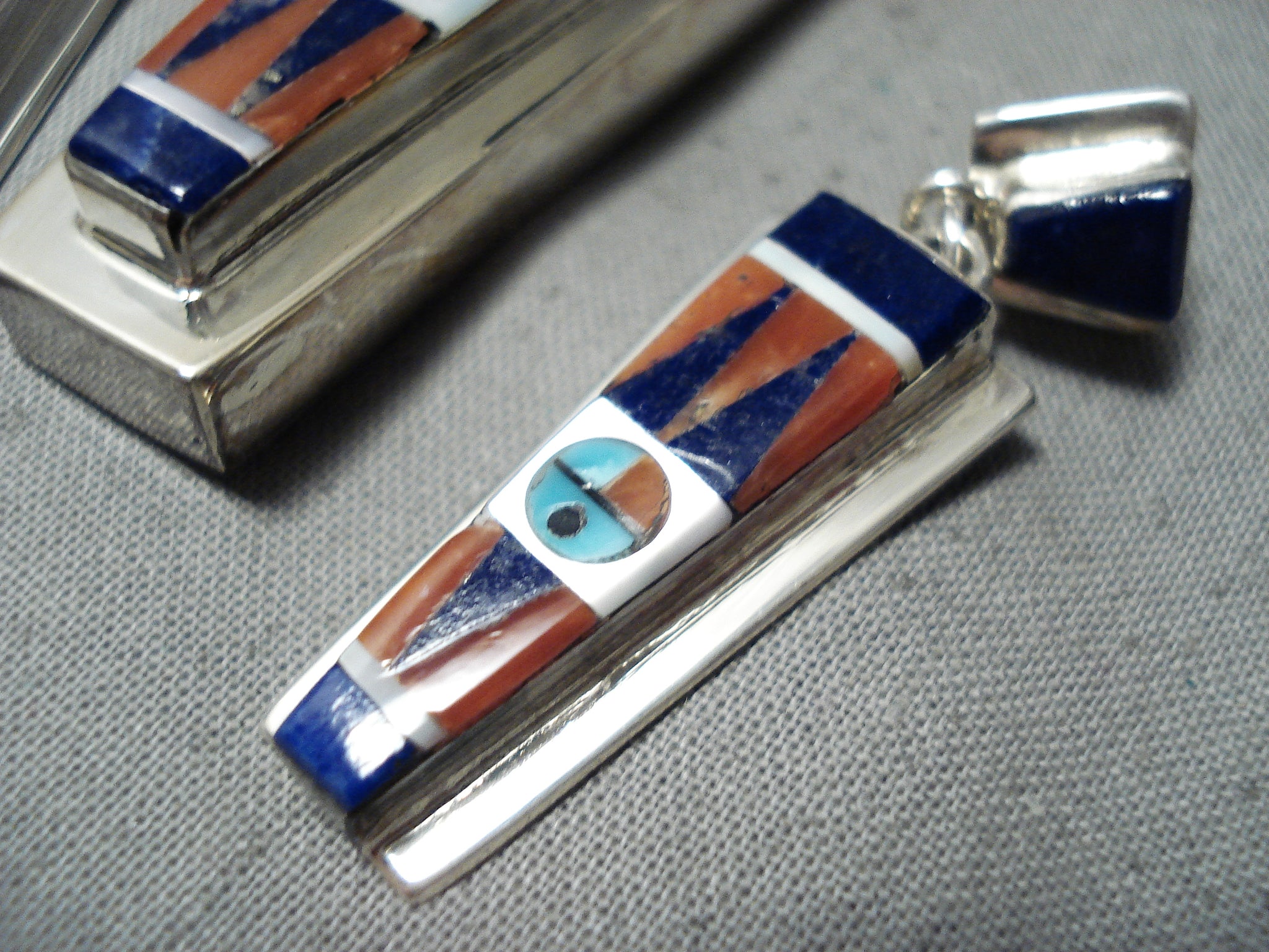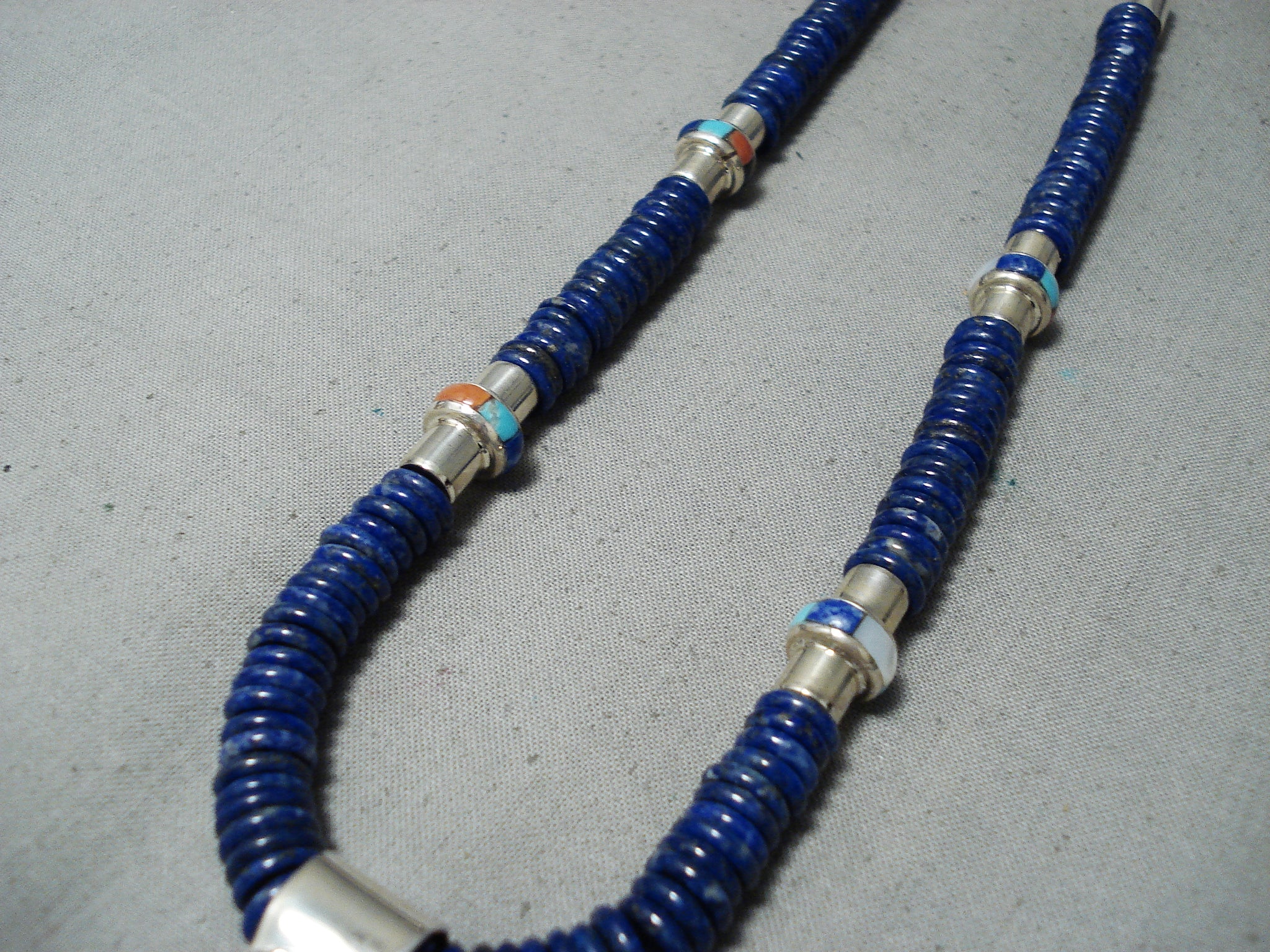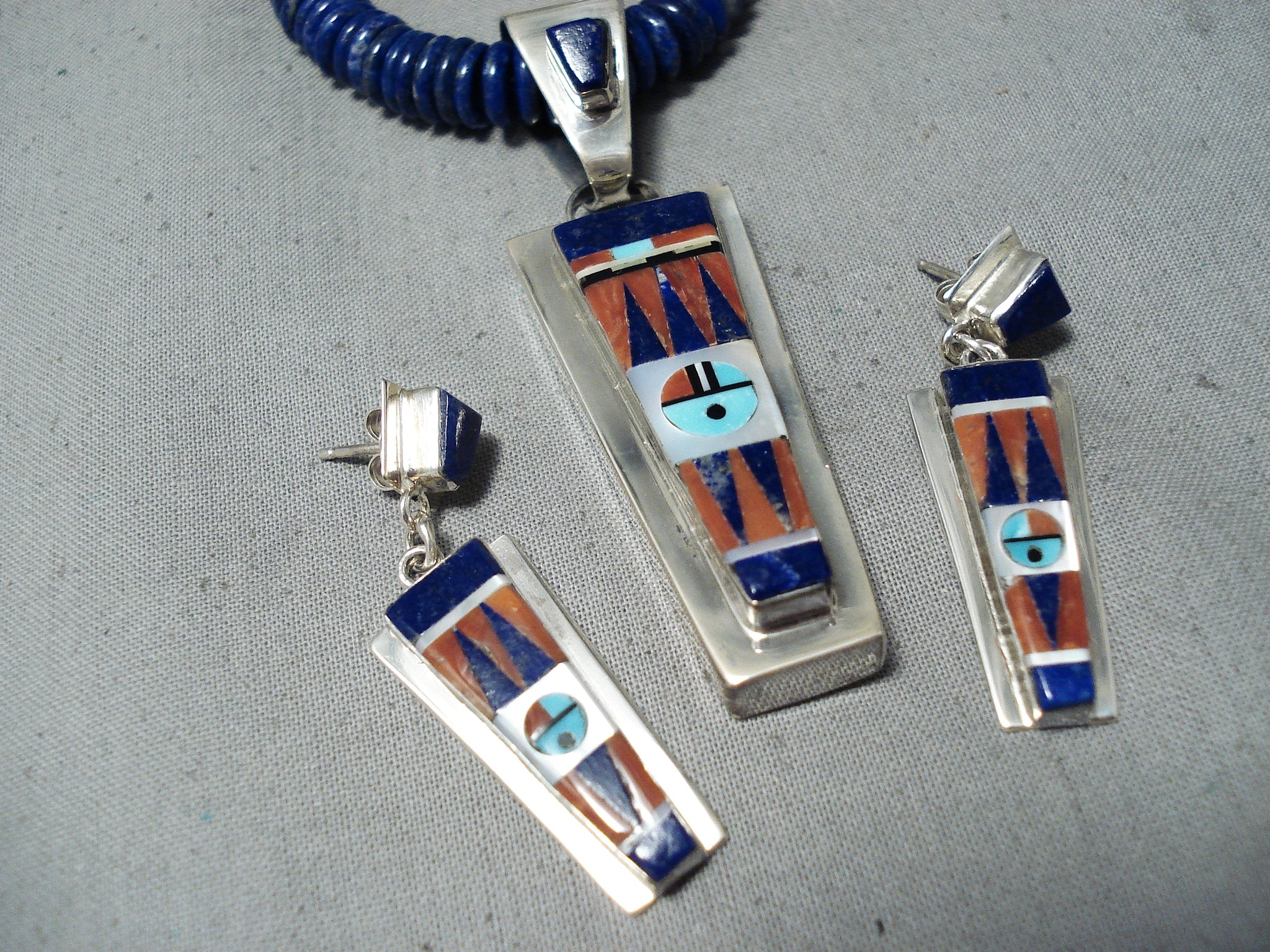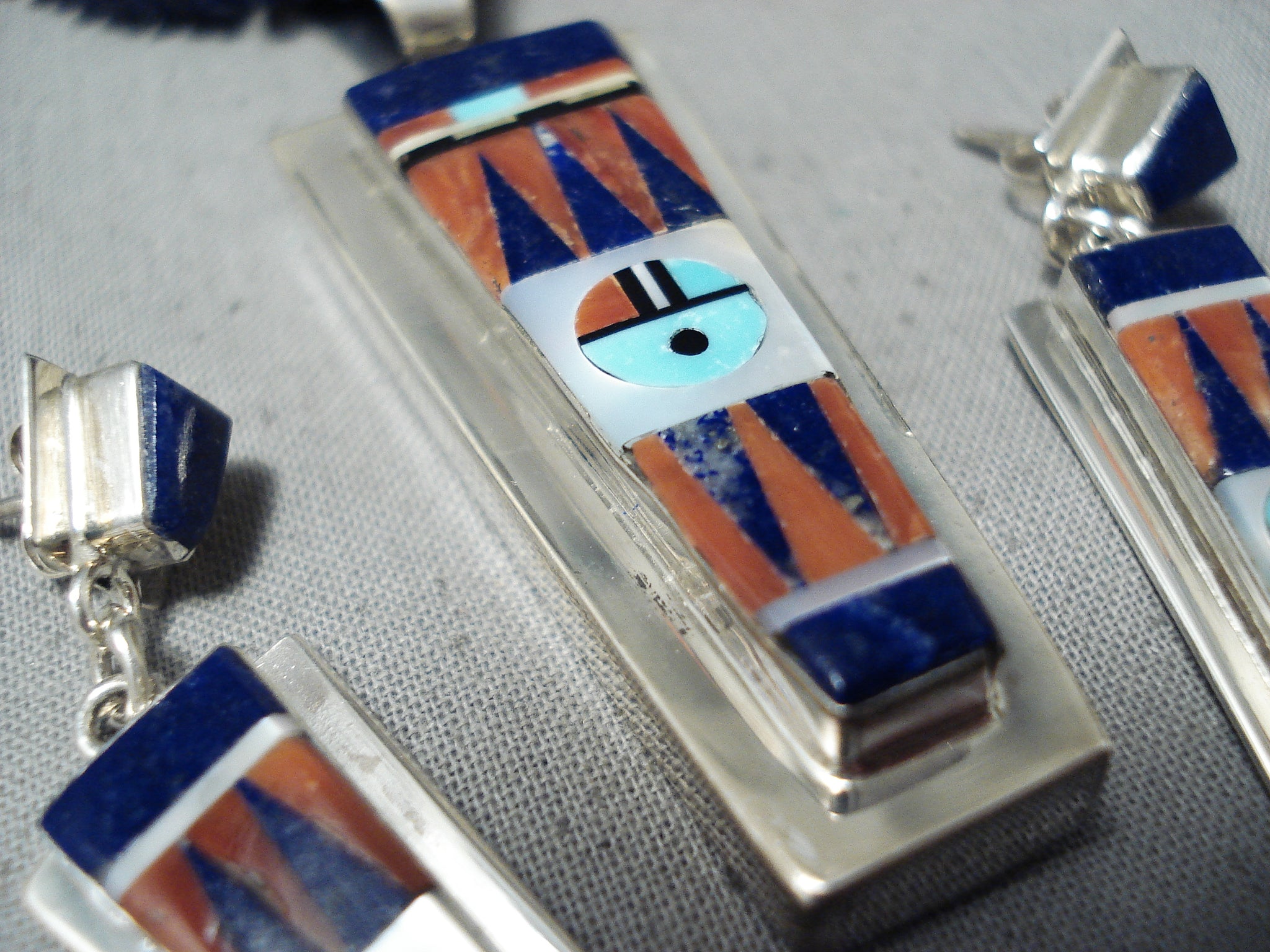 This is an astonishing vintage Zuni inlaid lapis and silver necklace being one of the best Zuni lapis inlaid necklaces we have recently collected. This wonderful piece contains a remarkable inlaid silver pendant that consists of lapis, coral, mother of pearl, and onyx. The wonderful pendant measures around 2-3/8" X 7/8". Resting throughout the necklace are impeccable rounded inlaid silver beads that are just amazing. The majority of the necklace consists of intricately hand carved thick disc shaped lapis stones. This impeccable necklace can be adjustable in length as the shortest it measures is around 23*-1/2" while the long length measures around 25". What I absolutely love about this necklace is that it comes with a beautiful matching pair of inlaid silver earrings. Each earring matches the pendant and measures around 1-1/2" X 1/2". Sterling silver, marked. Cir. 1970's+. Signed by Zuni artist, Ray Edaaki. Sturdy 78 grams.