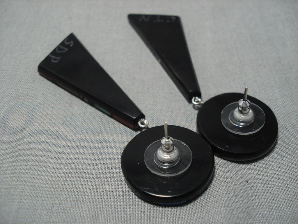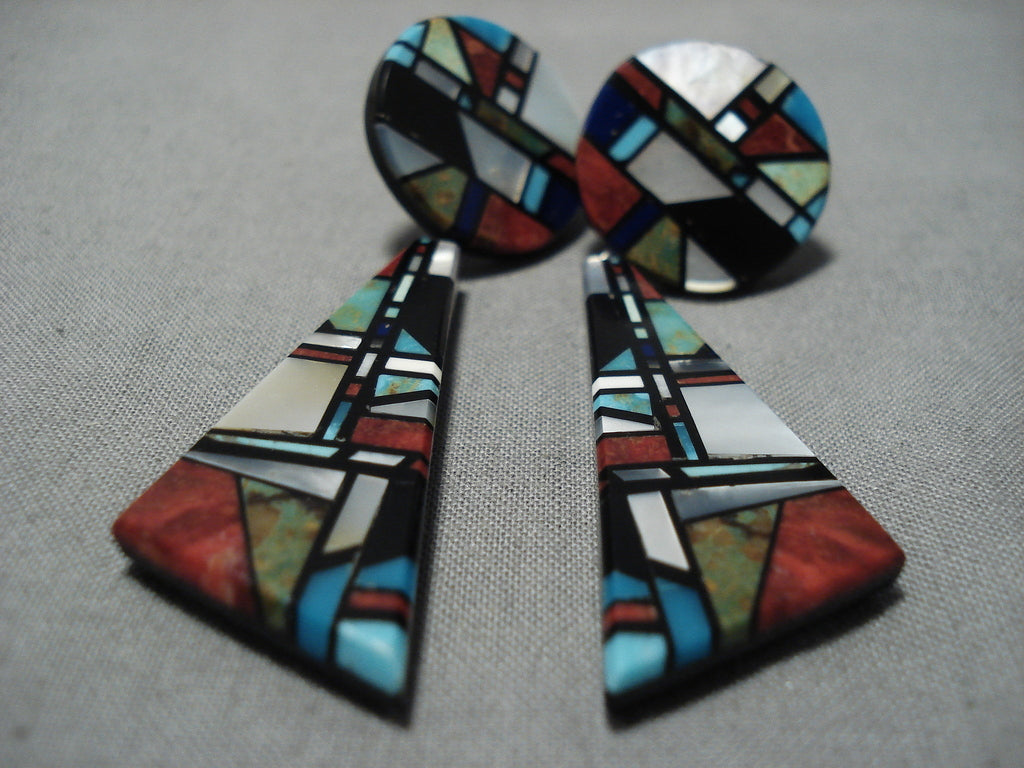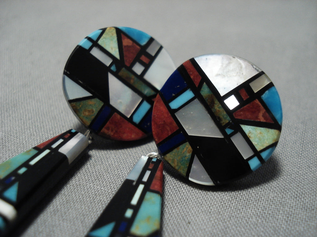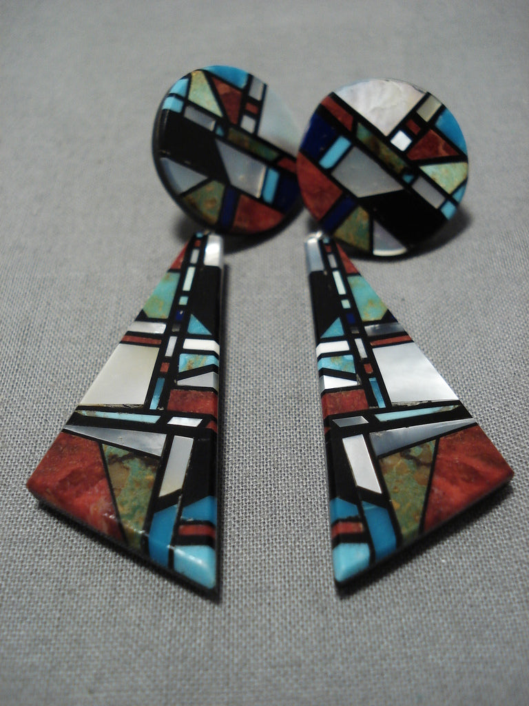 Here we have an incredible vintage Santo Domingo silver pair of earrings. These bright colorful post pierced earrings of inlay stones including turquoise, coral and mother of pearl have a round top with the dangling pointed triangle below. They measure about 2-7/8” x 3/4” from top to bottom. Sterling silver. Signed by Santo Domingo artist Chris Nieto. The earrings weigh around 12 grams.