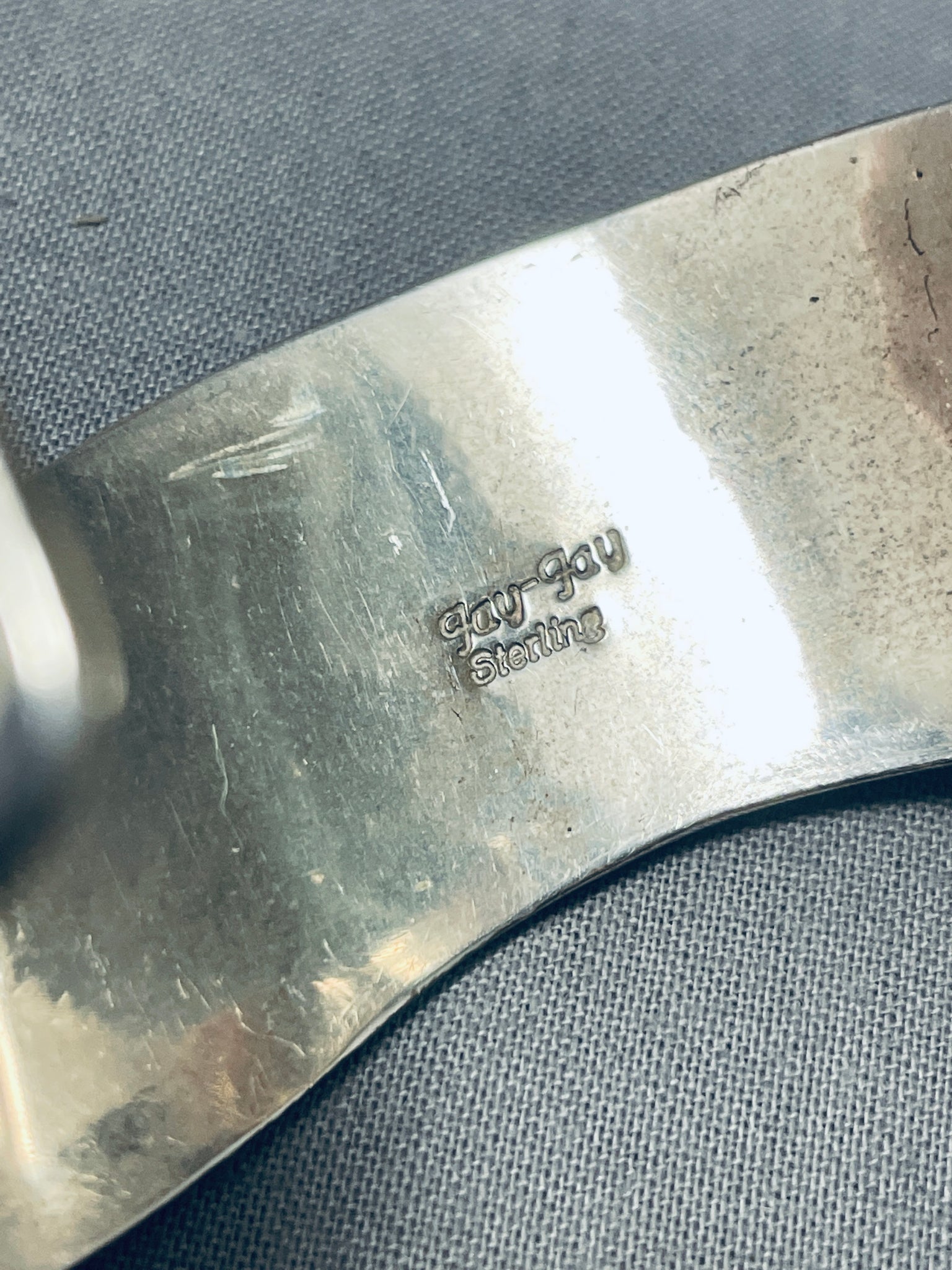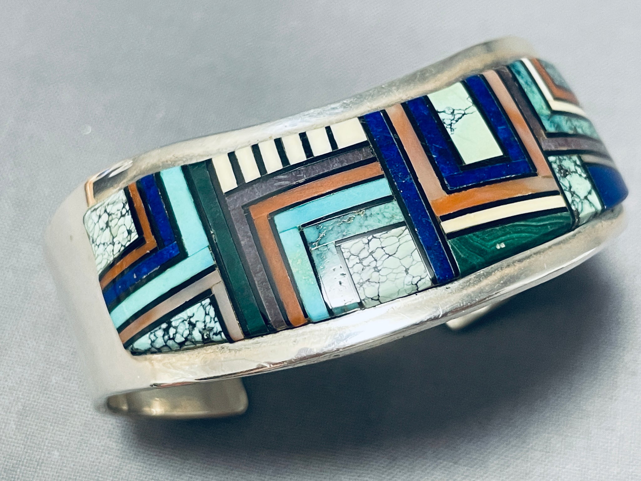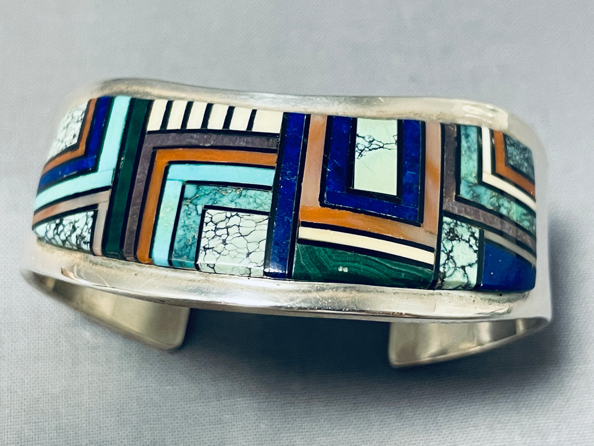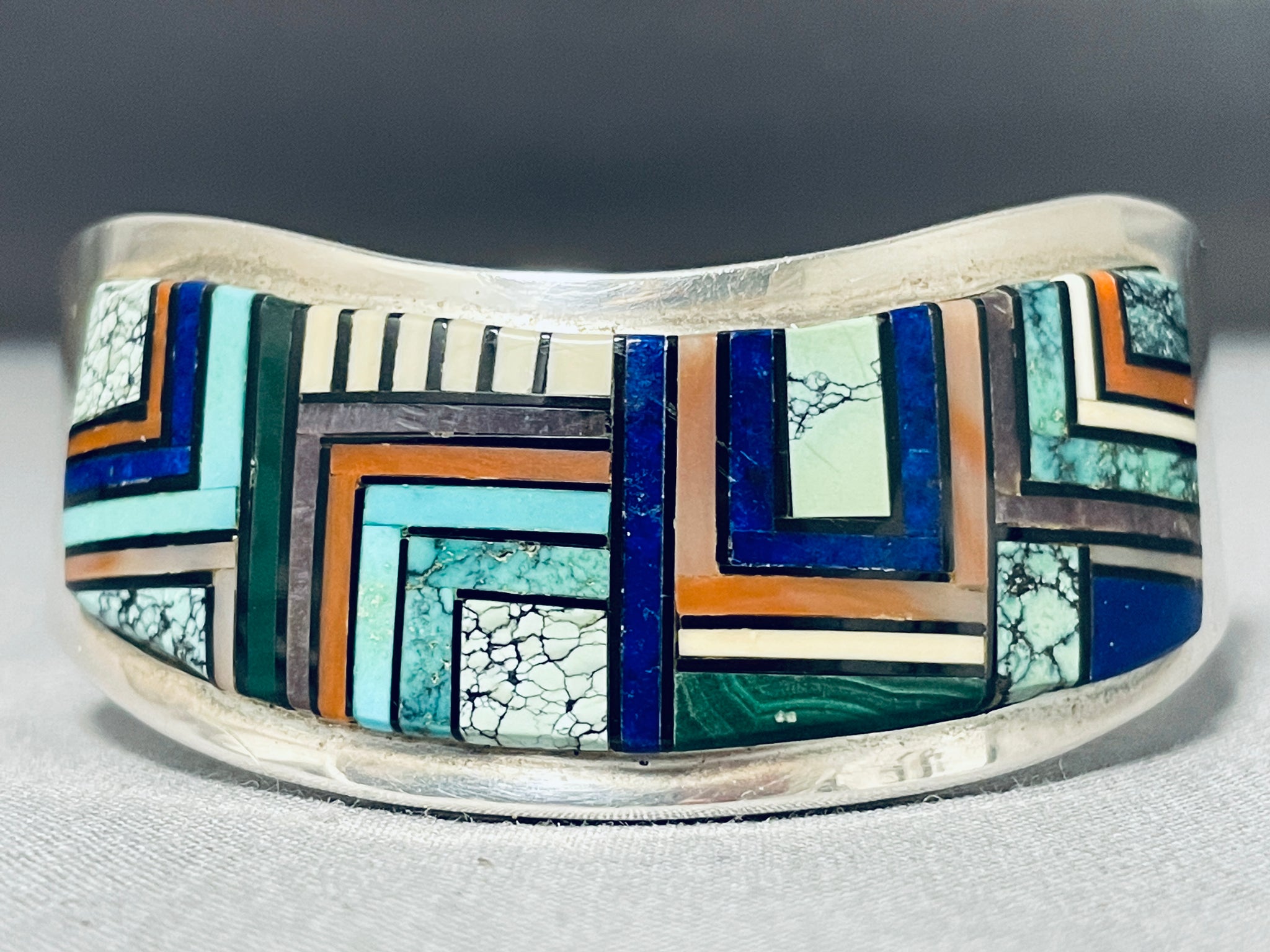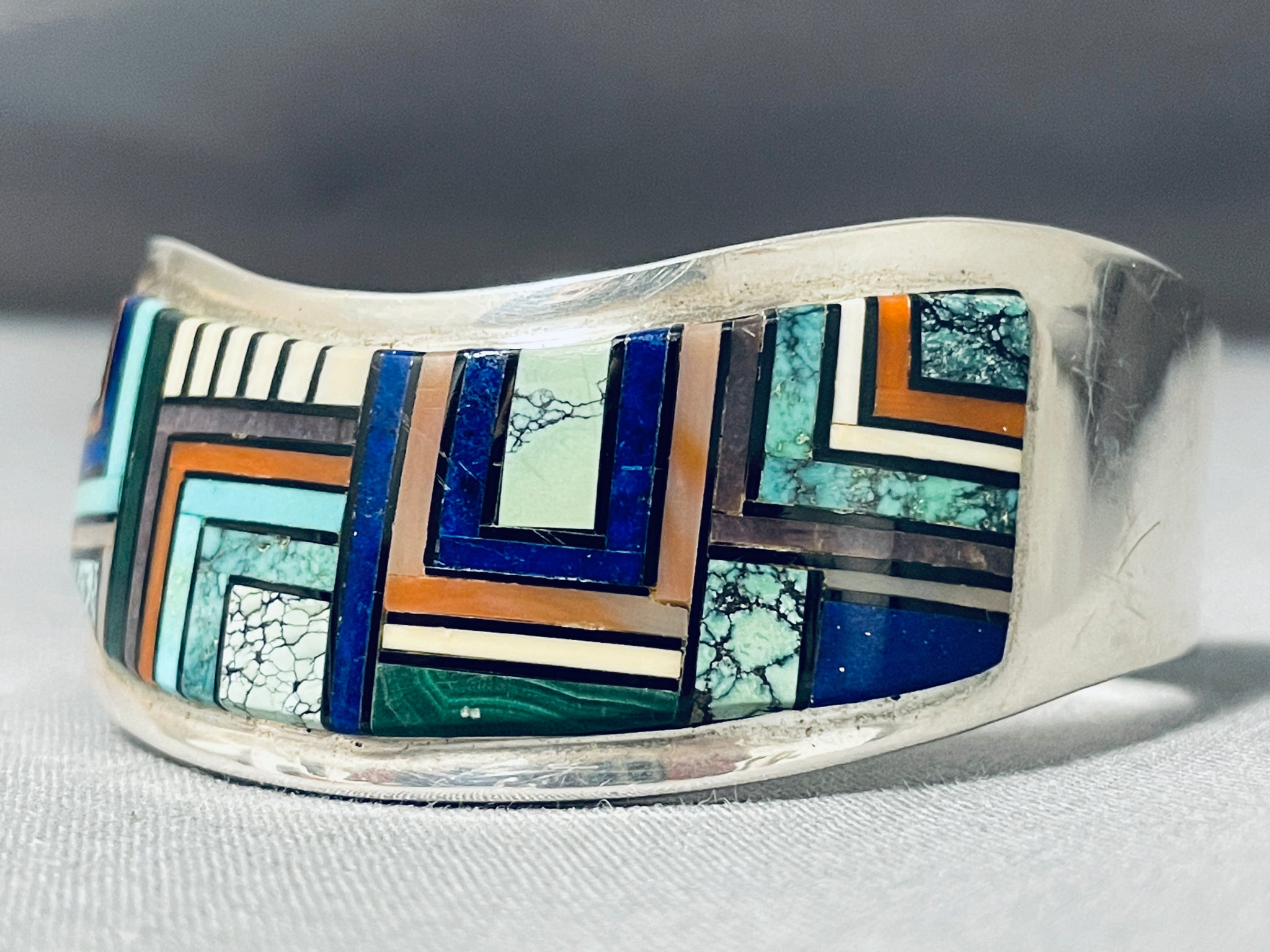 Native American Incredible Intricate Vintage Turquoise Lapis Sterling Silver Inlay Bracelet