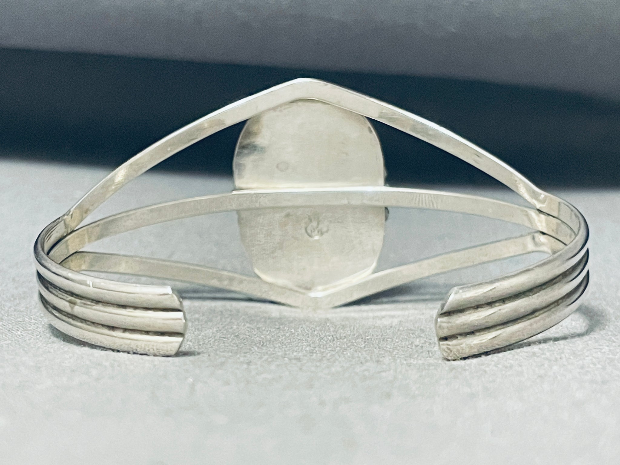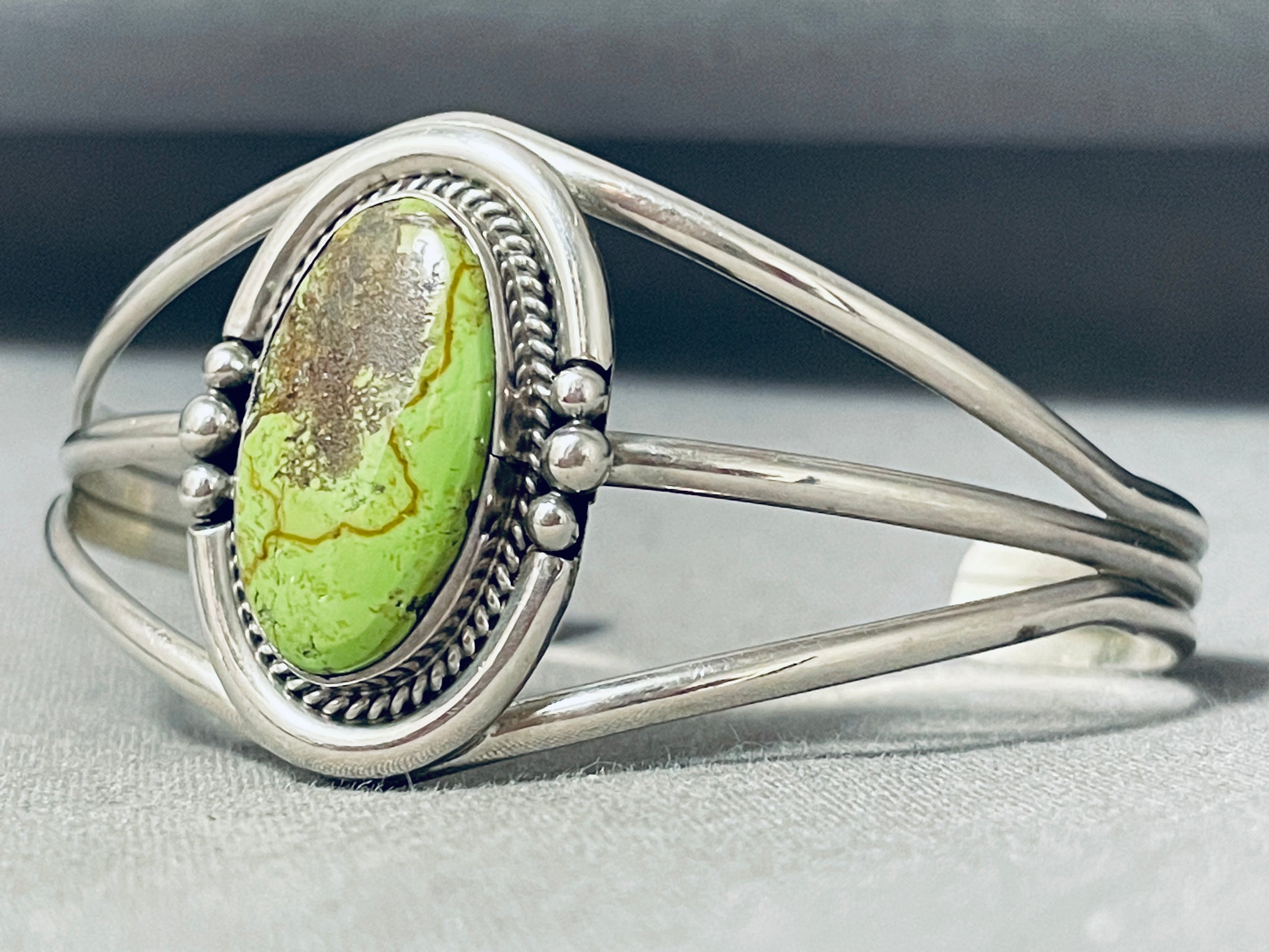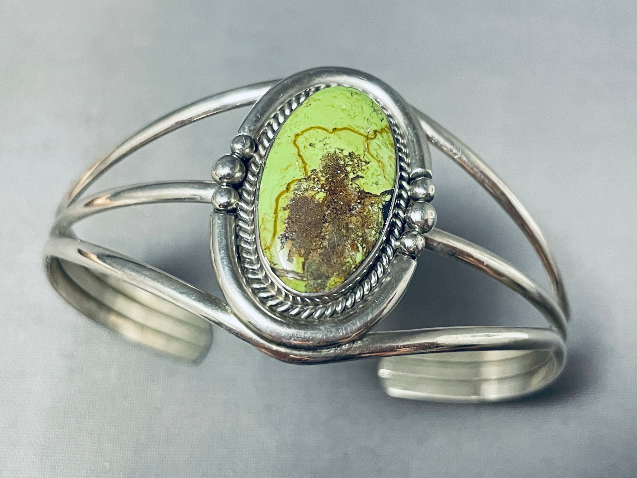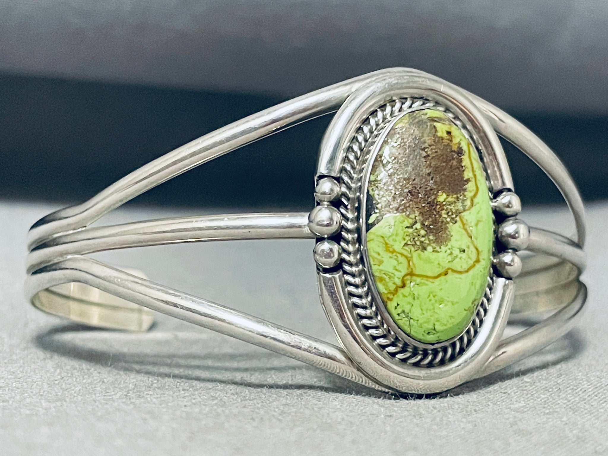 Native American Incredible Vintage Running Bear Green Gaspeite Sterling Silver Bracelet