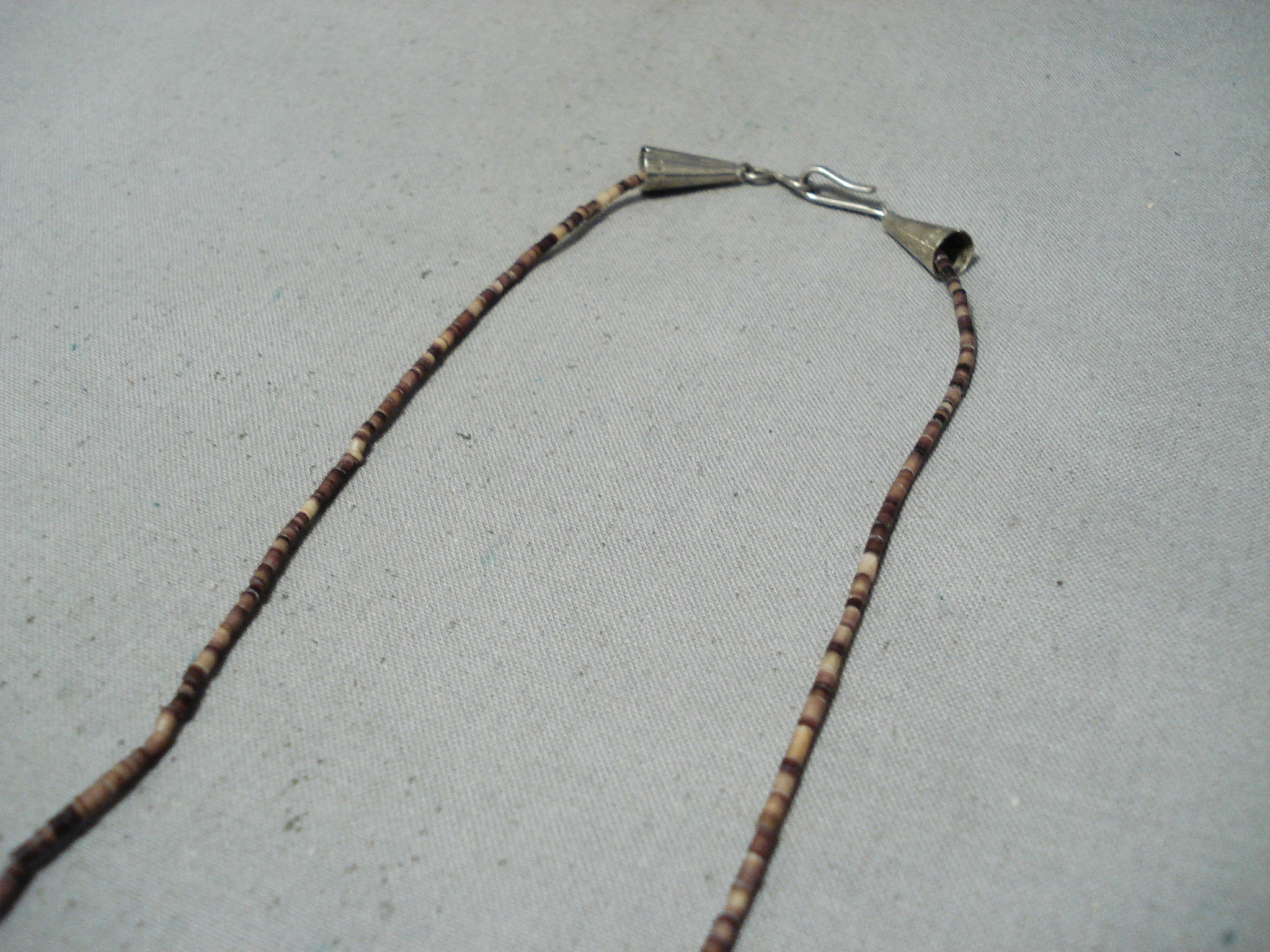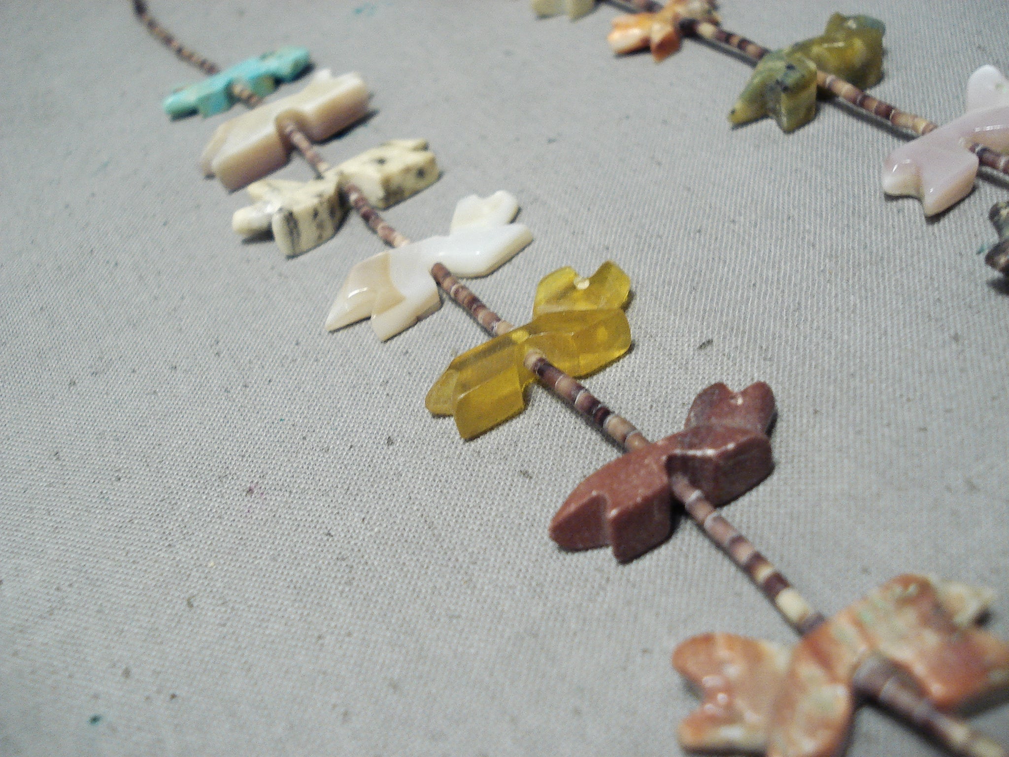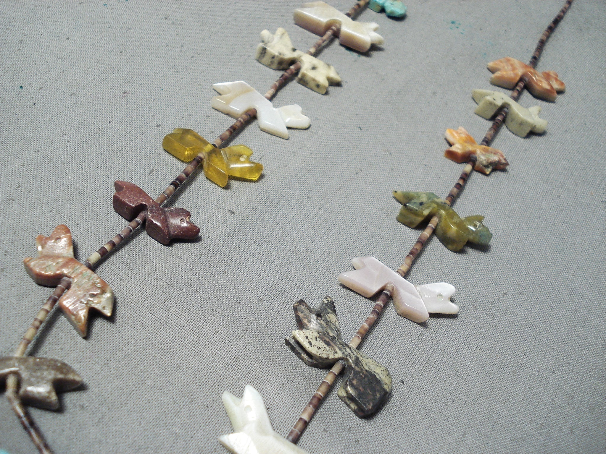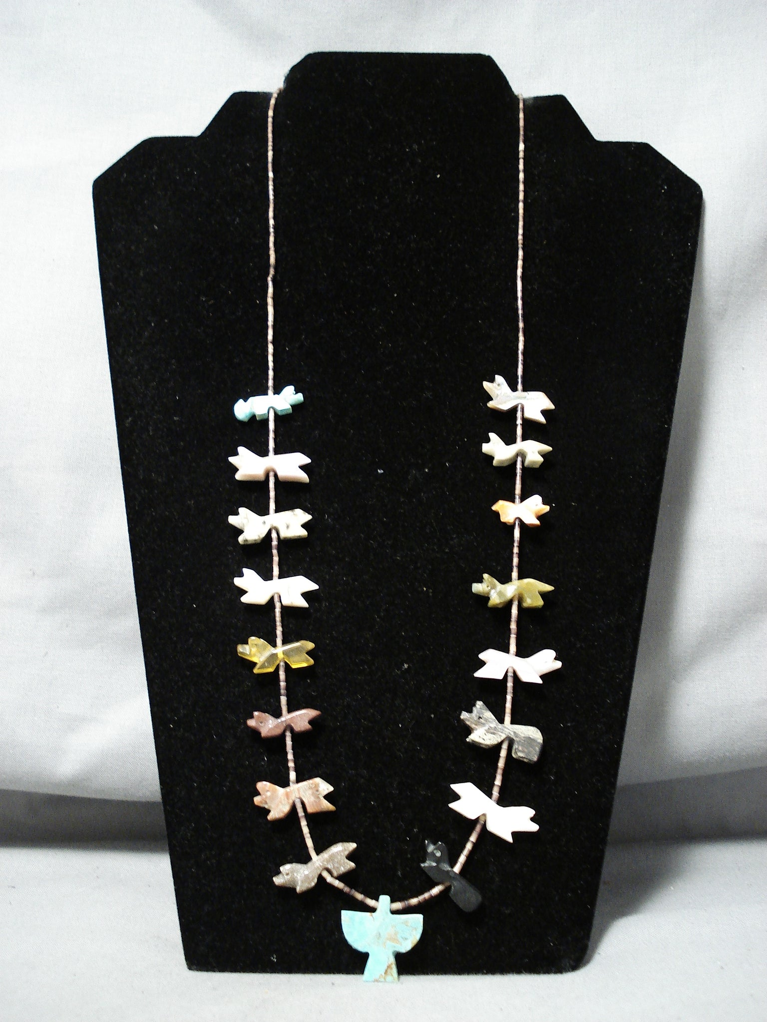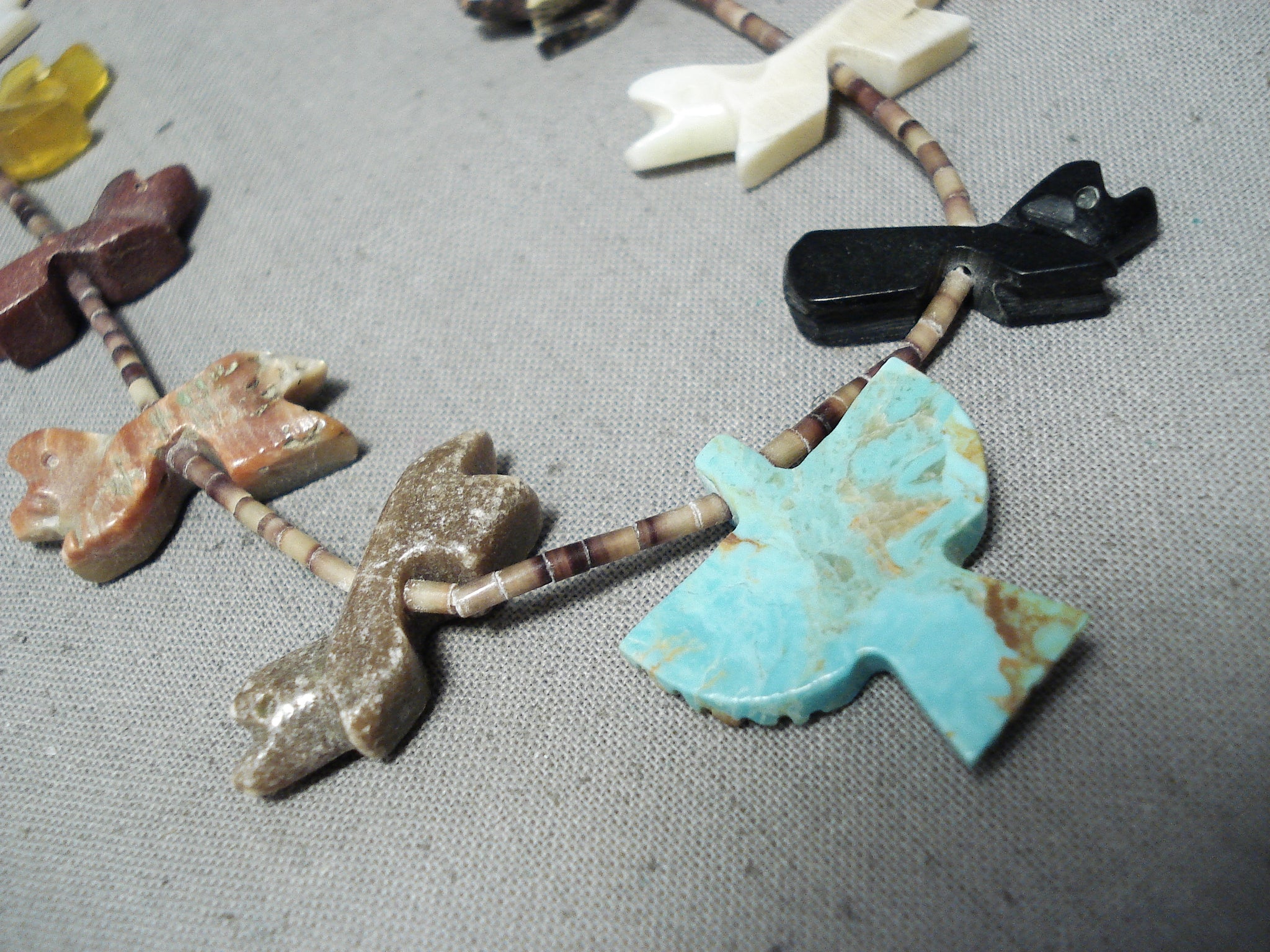 This is an incredible vintage Santo Domingo fetish necklace. This necklace is impeccable as it includes multiple fetishes with different stones and shells. The stones and shells consist of Royston turquoise, jet, mother of pearl, spiny oyster, opal, pink shell and pipestone. Located throughout the necklace stunning brown shell heishi with end silver cones and traditional silver clasp. The large bird fetish at the bot/tom measures around 7/8" X 7/8". Sterling silver. Cir. Mid century . The length of the necklace measures around 28". Sturdy 23 grams.