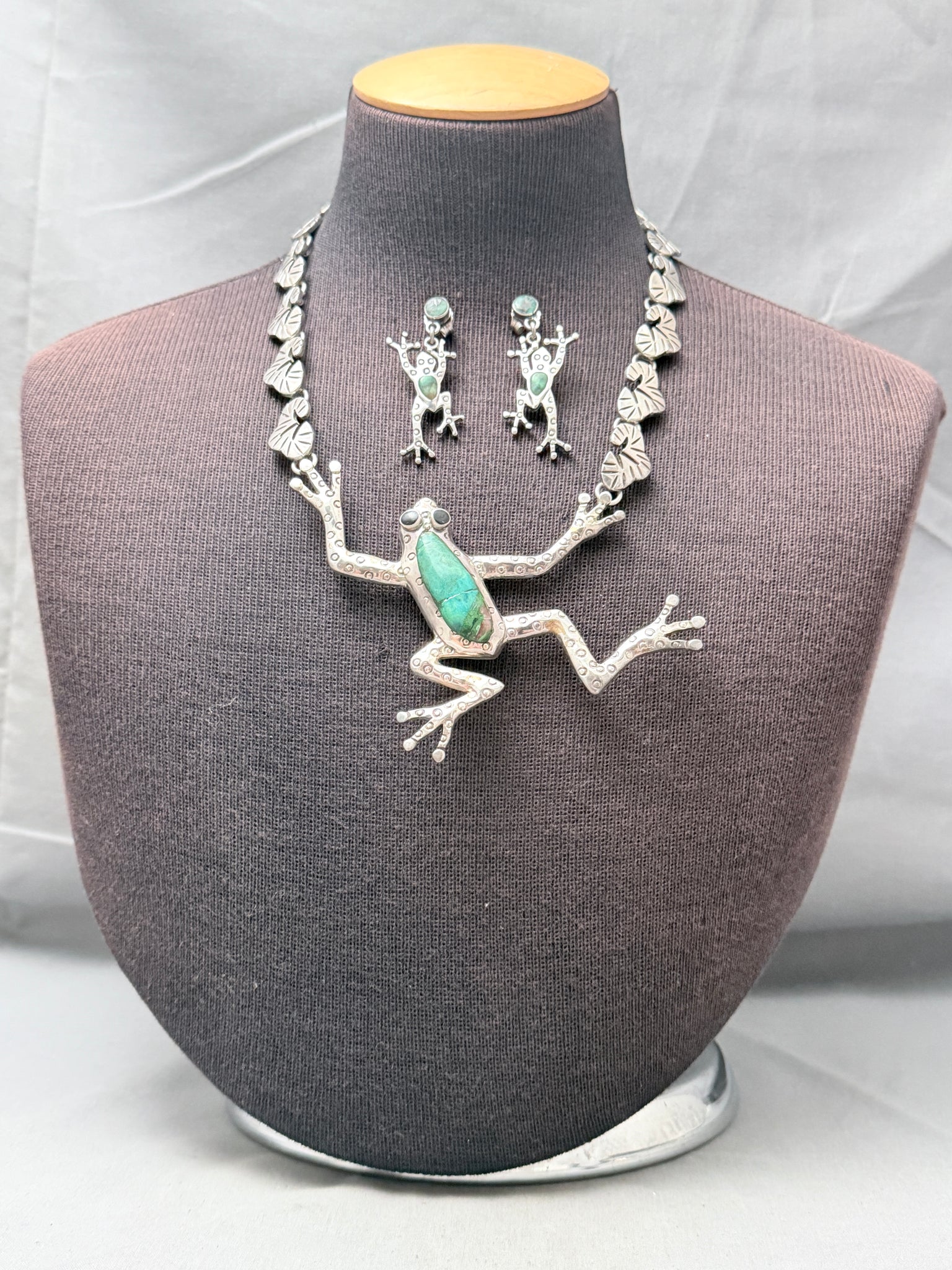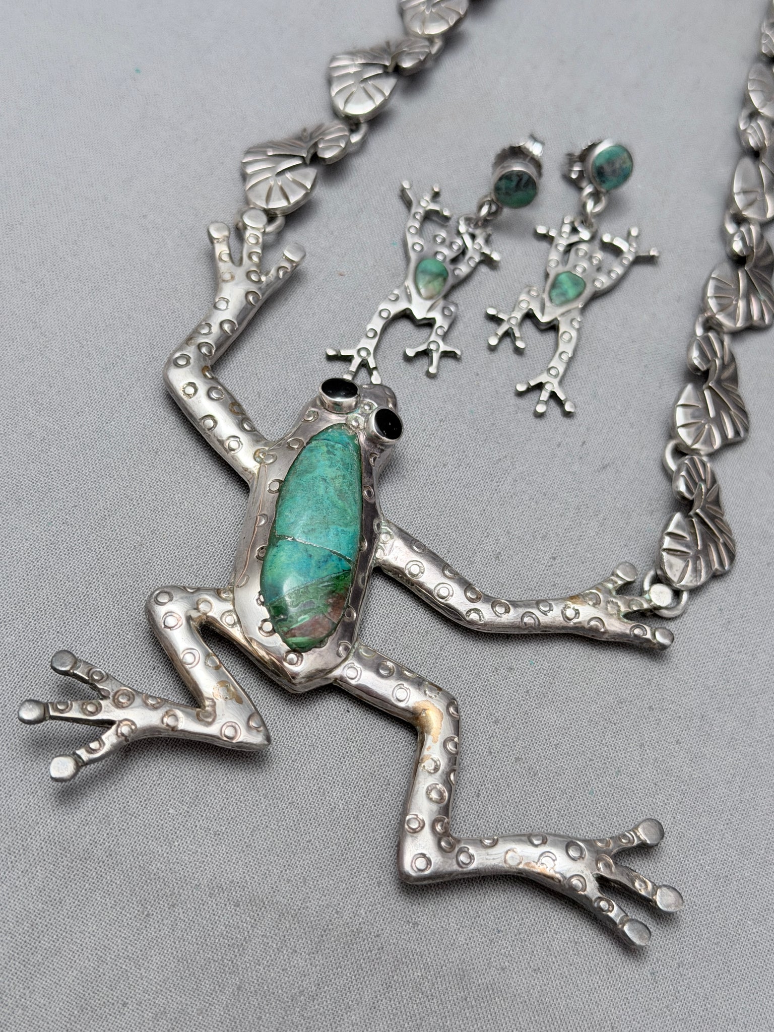 This is an impressive Southwestern turquoise silver frog necklace set. This incredible set consists of a large chunky frog pendant necklace with a beautiful matching pair of silver frog earrings. The necklace contains a large handmade silver frog pendant that measures a whopping 3-3/4' X 3-1/4". Located on the frog pendnat are two onyx snake eye shaped eyes with a chunky Royston turquoise stone. The carvings on the frog consist of silver dotted patterns. Running up the necklce is a beautiful plethora of thick handmade silver lilypad links. The earrings each consist of a hand carved silver frog with two more amazing Royston turquoise stones. Each earring measures around 2" X 3/4". Sterling silver. Cir. 1970's+. The length of the necklace measures around 21". Sturdy 138 grams.