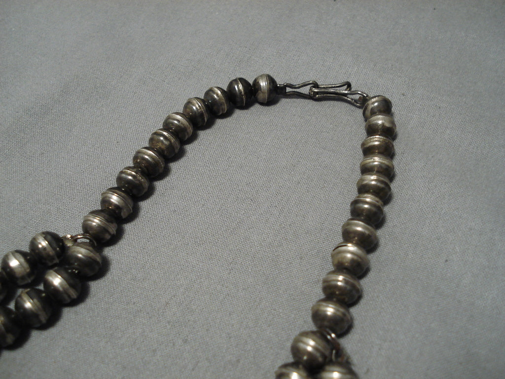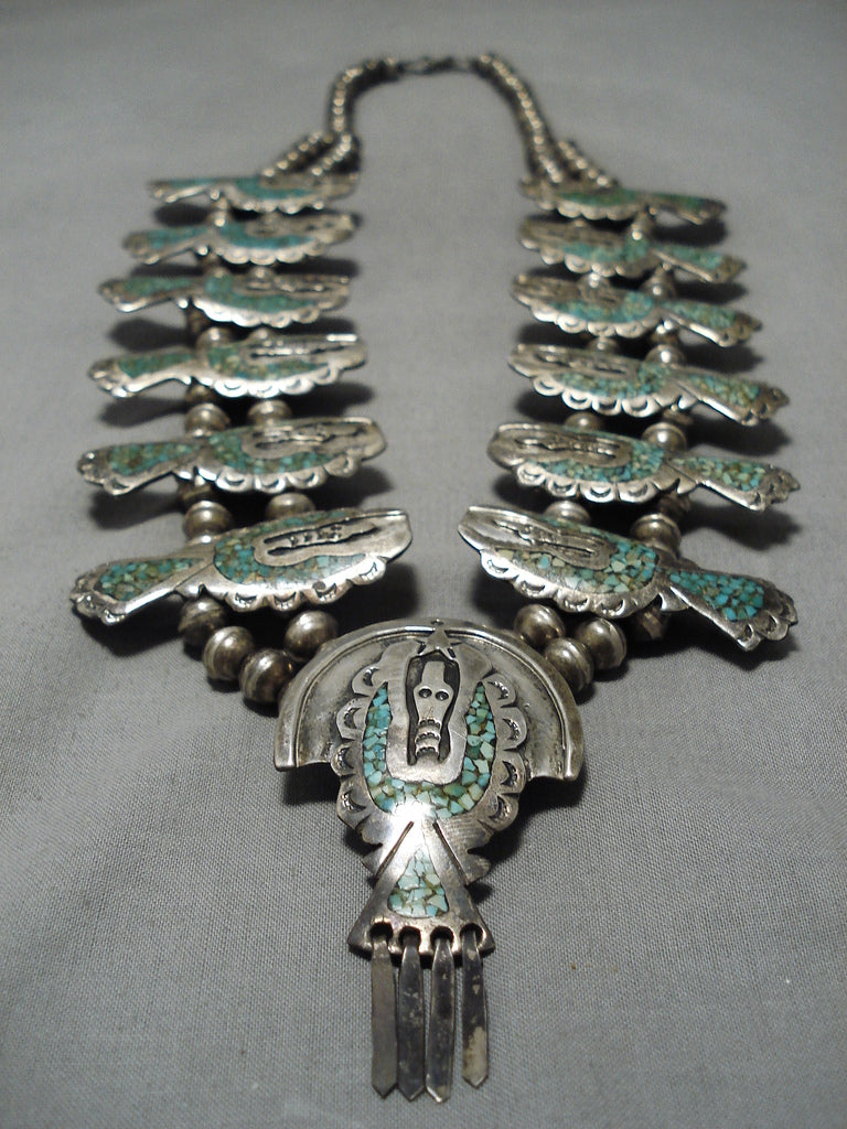 This is an astounding vintage Zuni inlaid waterbird squash blossom necklace. This absolutely remarkable piece is beautiful inlaid with green turquoise stones. This necklace consists of 13 phenomenal inlaid silver waterbirds including the bottom large one. The bottom waterbird measures around 2-3/4" X 1-1/2" including the four dangling pieces from the bottom. Resting throughout the entire necklace are amazing hand wrought rounded silver beads with a traditional silver clasp. Sterling silver. Cir. Mid century . The length of the necklace measures around 31". Sturdy 187 grams.