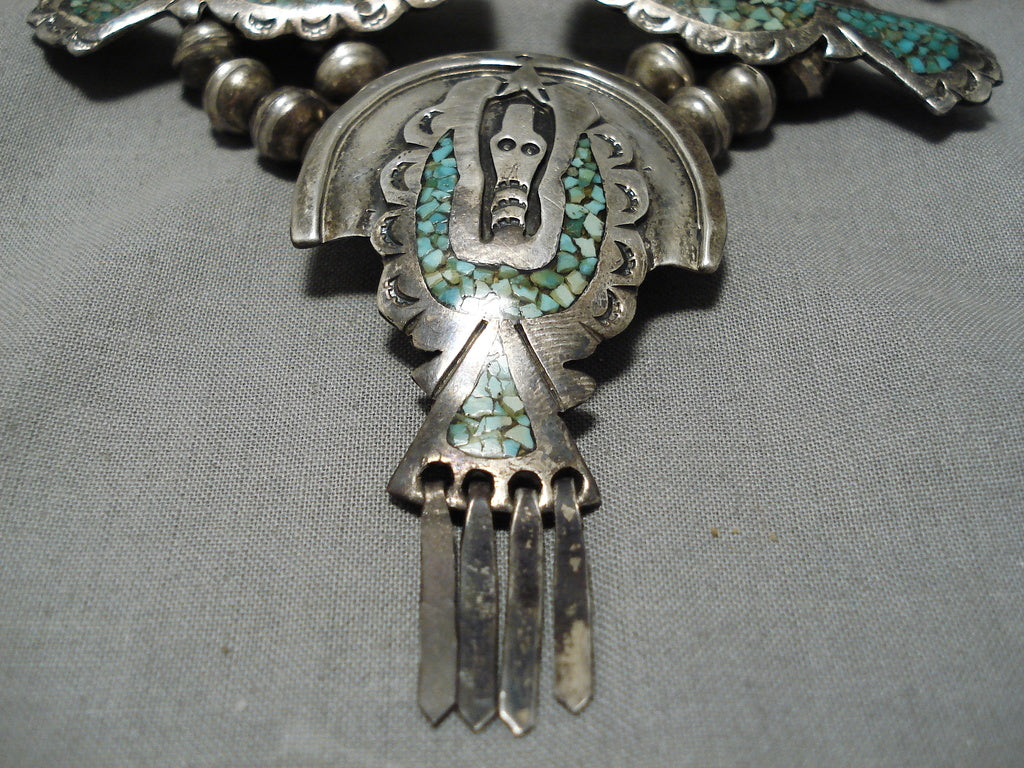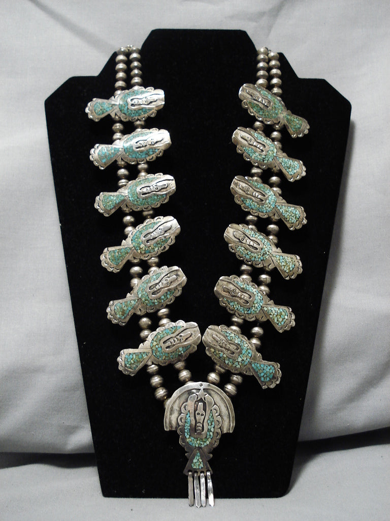 Native American Intricate Vintage Navajo Turquoise Inlay Sterling Silver Squash Blossom Necklace