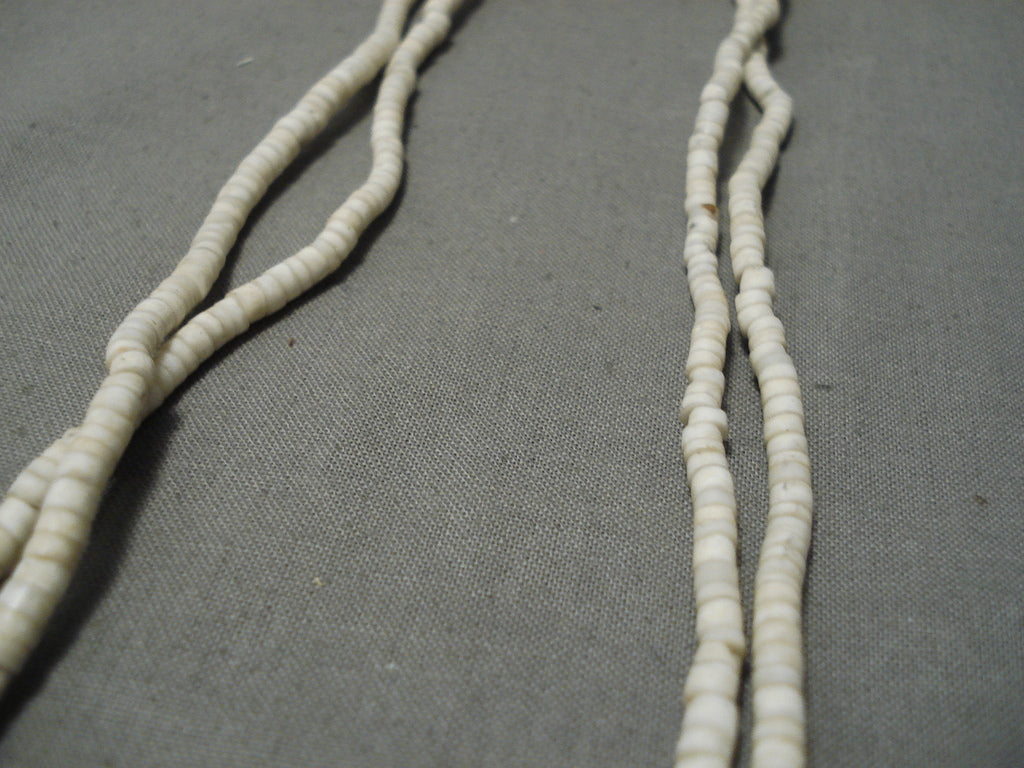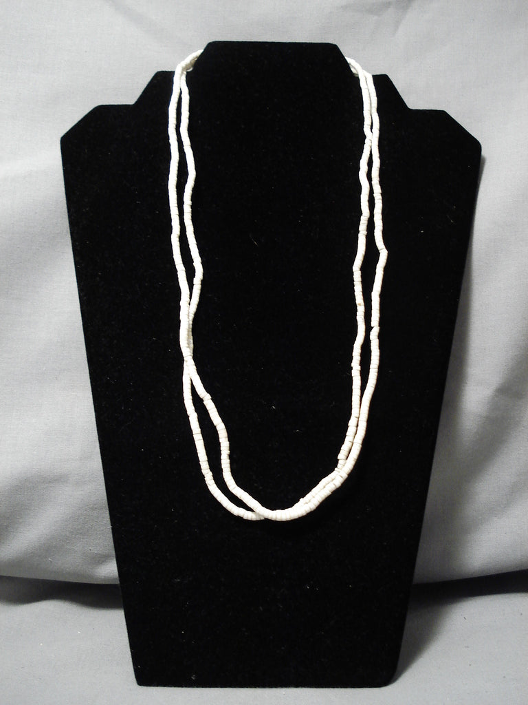 Up for sale is this marvelous vintage Santo Domingo necklace. This is a unique double strand necklace of gypsum heishi strung side by side, until meeting the silver clasp. Sterling silver. The length of the necklace measures around 23-1/2". Sturdy 24 grams.