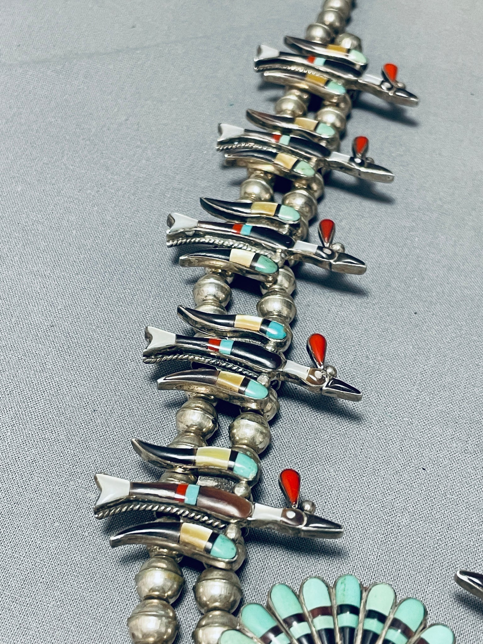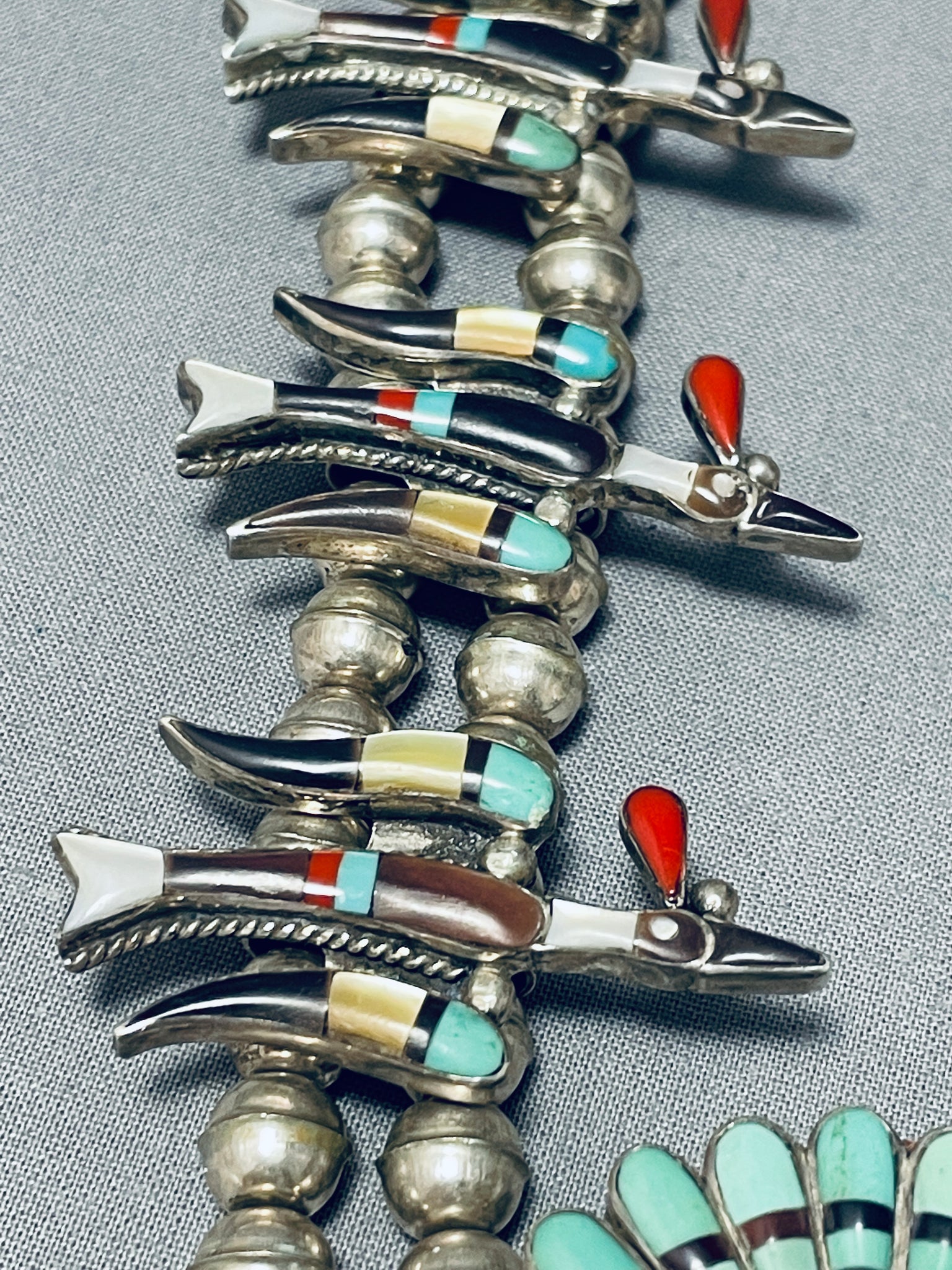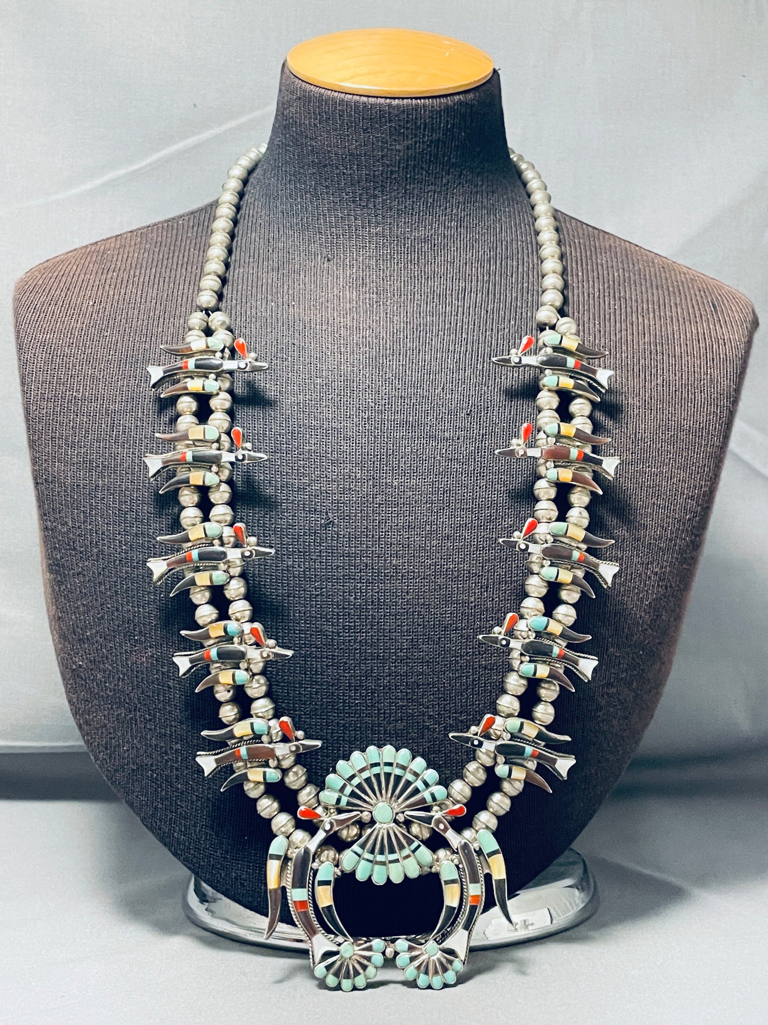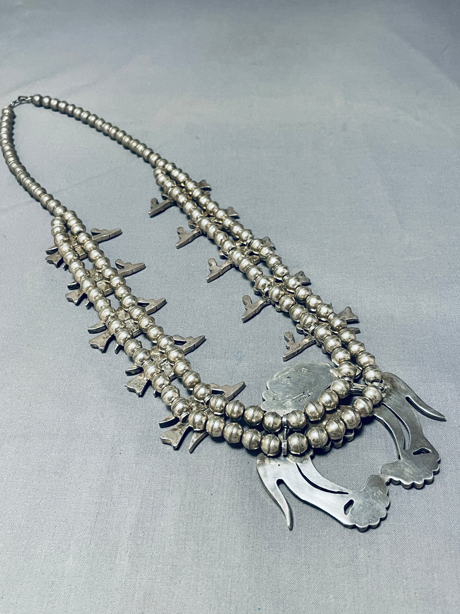 Native American Most Intricate Bird Vintage Turquoise Sterling Silver Squash Blossom Necklace