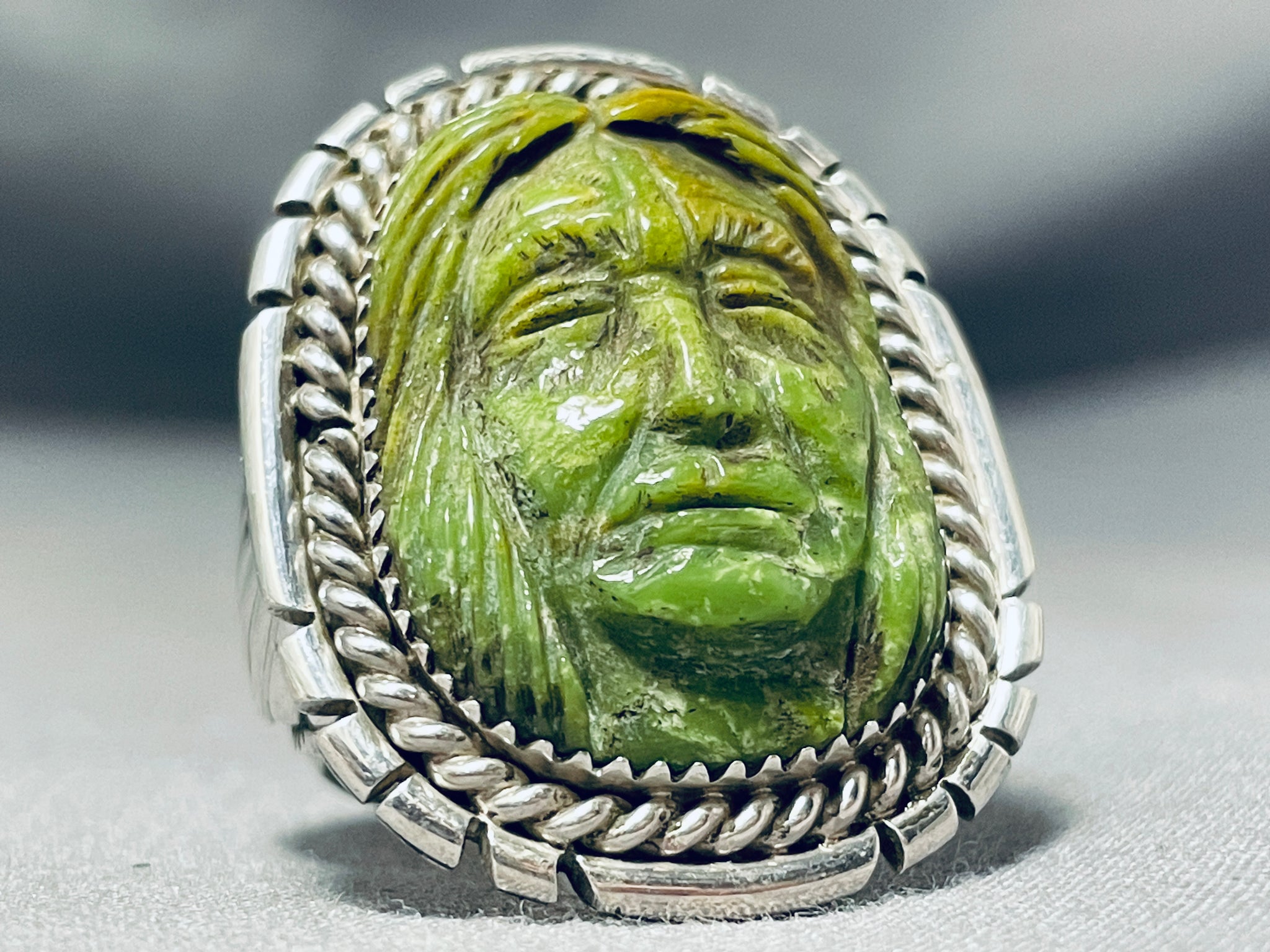 Native American Most Intricately Hand Carved Japser Sterling Silver Chief Ring