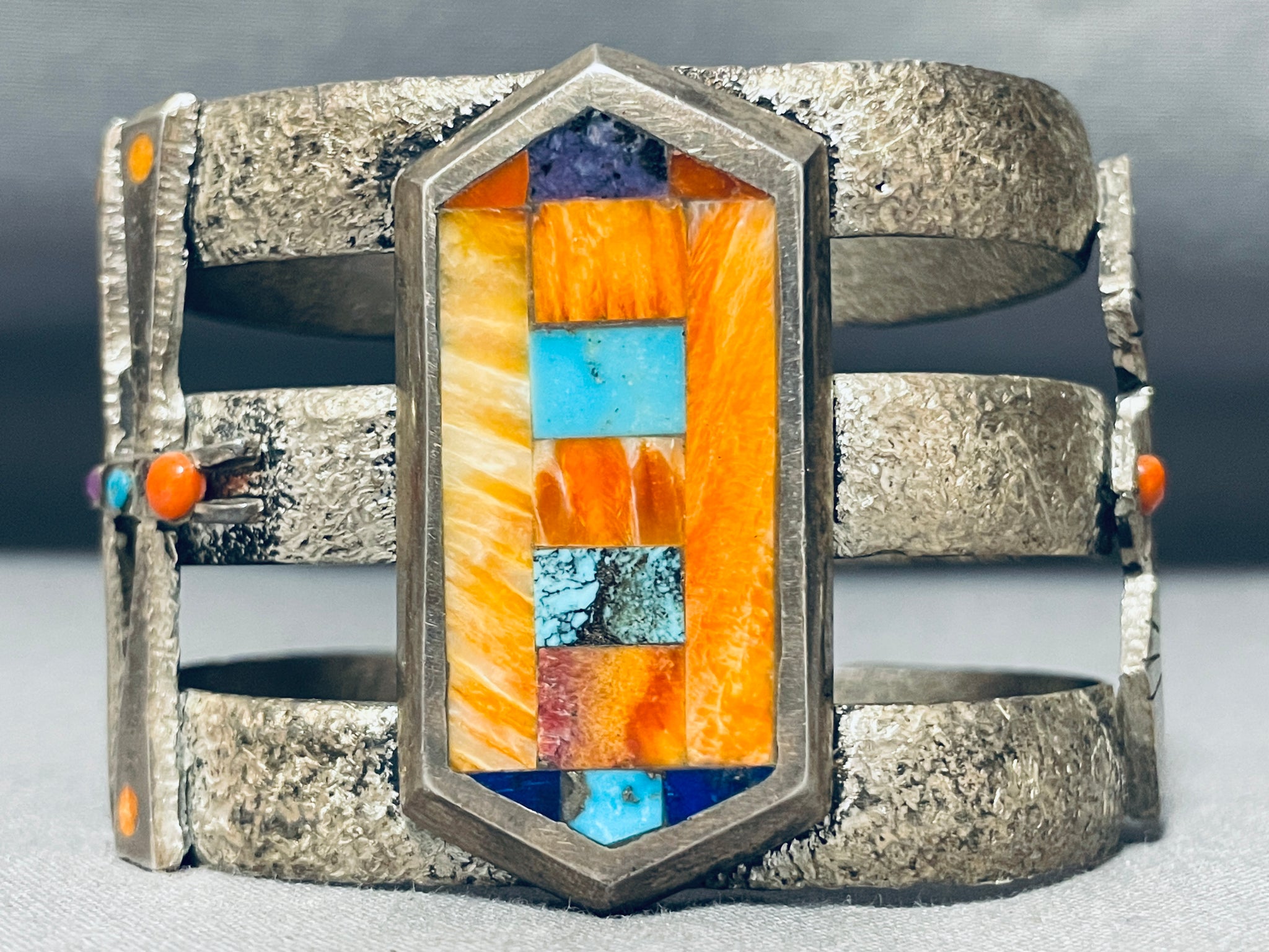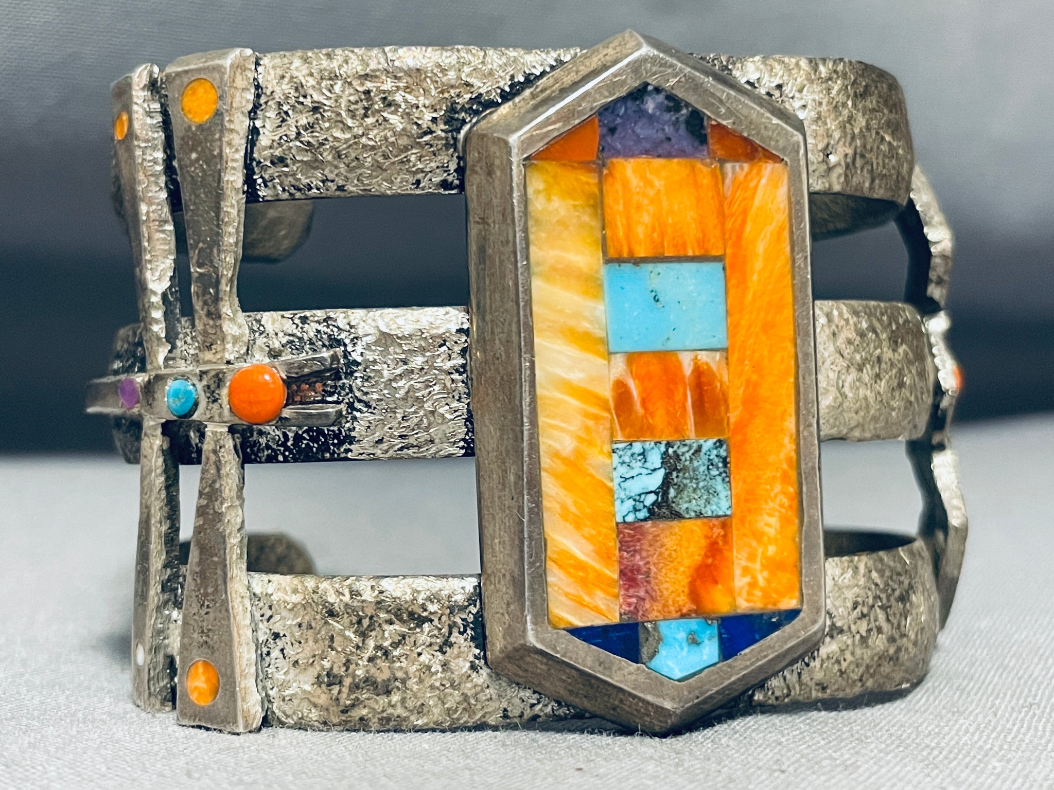 This is a magnificent vintage Native American inlaid silver bracelet. This remarkable bracelet contains a beautiful unique shaped center inlaid pattern that includes spiny osyter, lapis and turquoise. This bracelet contains a marvelous sturdy and thick triple shank cuff that is beautifully tufa casted. Resting at one end is a wonderful thick hand carved mountain flank pattern with an accenting snake eye coral stone while located on the other end of the bracelet is a wonderful hand carved silver dragonfly with accenting spiny oyster shells, turquoise stone and coral stone. The intricacy of this bracelet is just spectacular. The width of the bracelet measures around 1-3/4". Sterling silver. Cir. Mid century . The inside end to end measures around 5" with an additional 3/4" gap. Sturdy 87 grams.