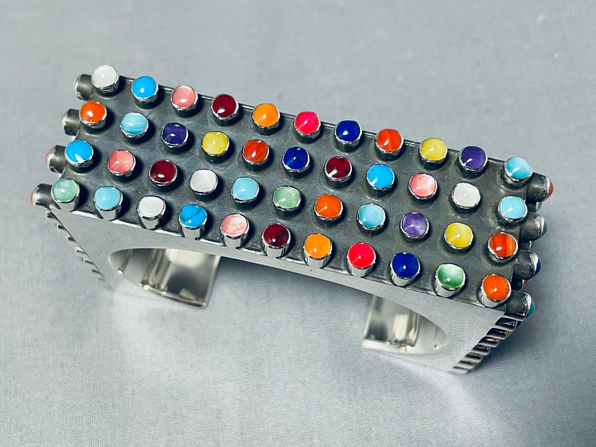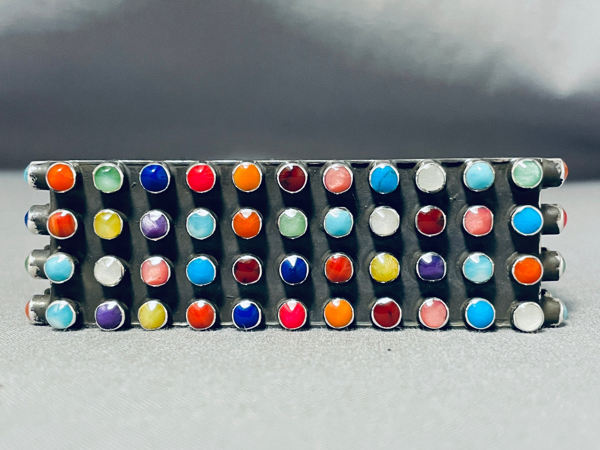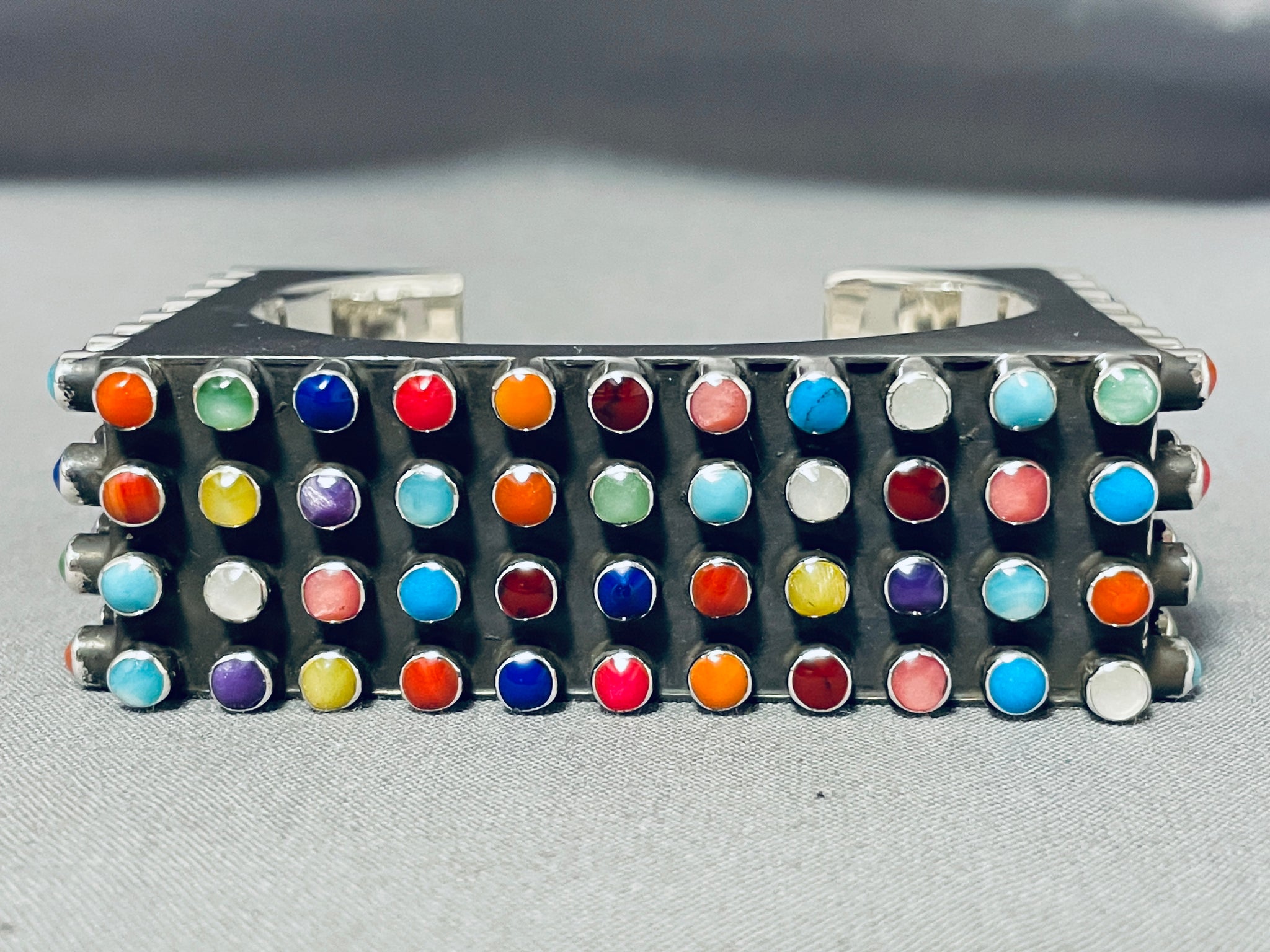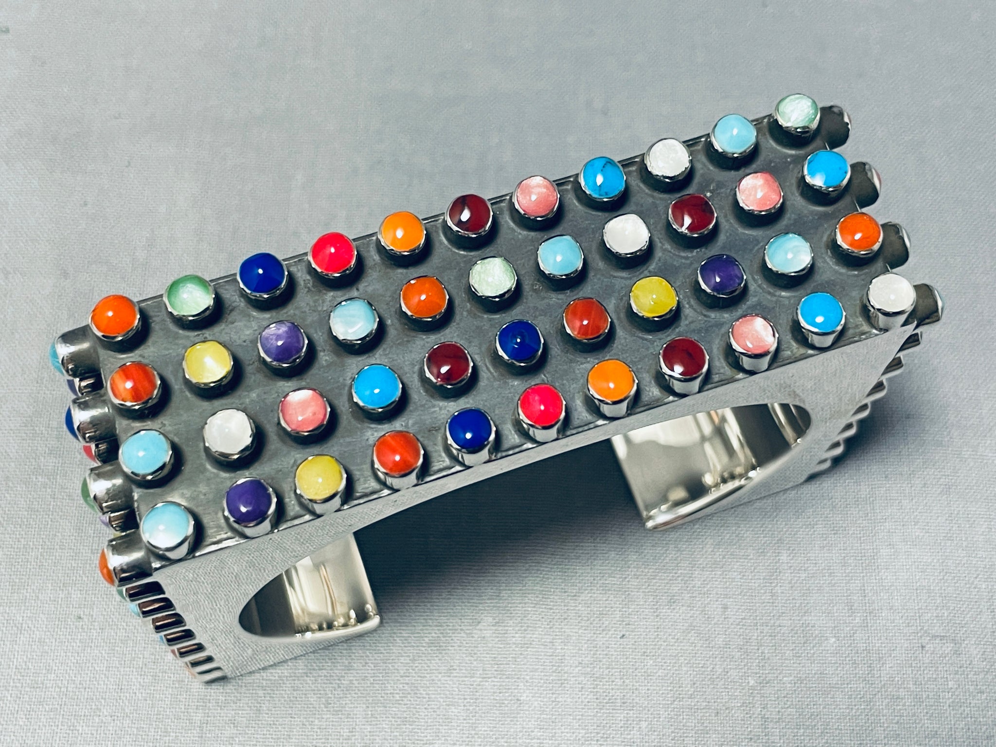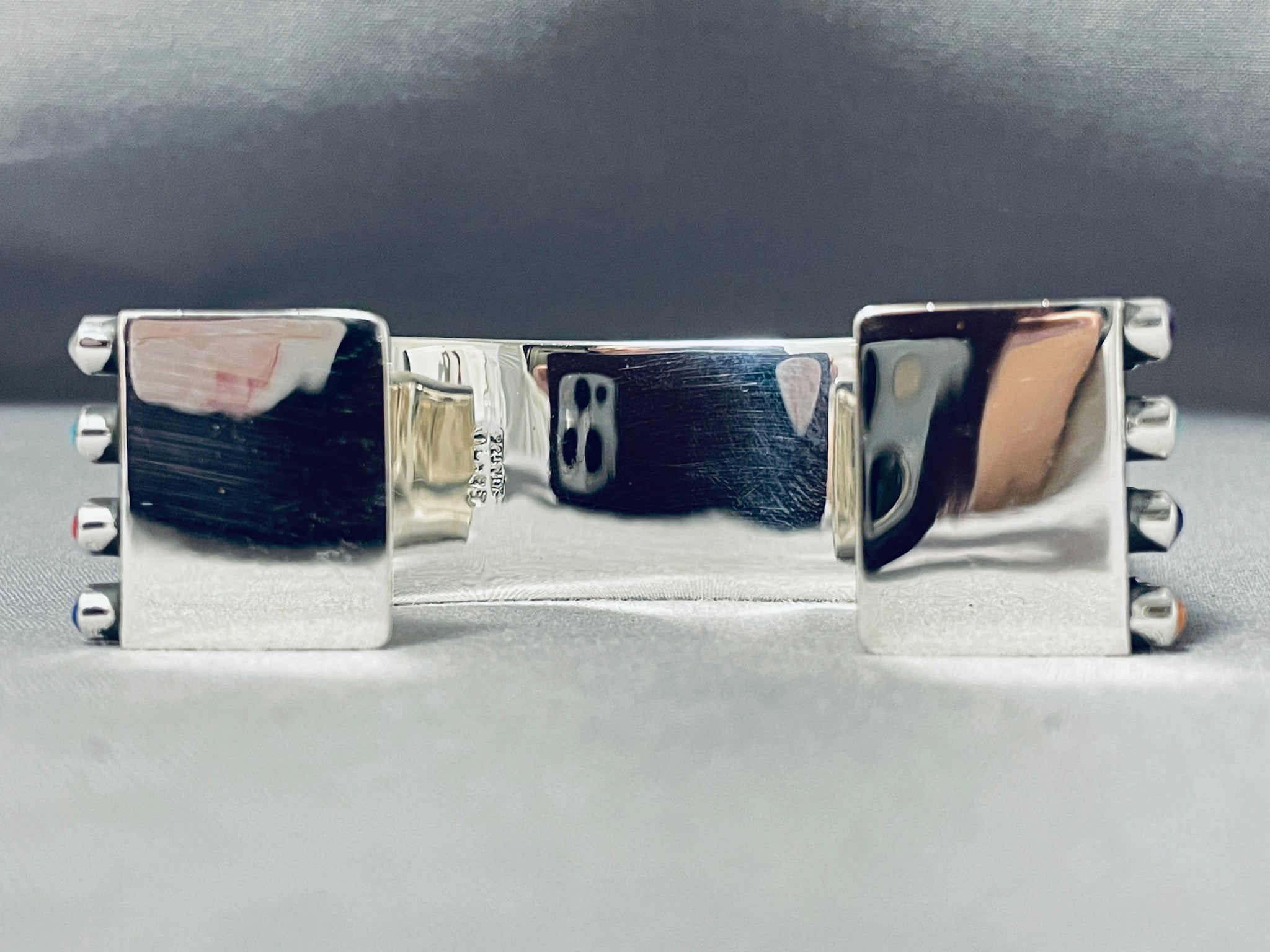 This is a striking Taxco very complex multiple petit point stone and shell thick silver bracelet. This bracelet is beautifully square shaped and is very thick and sturdy. Located throughout the entire bracelet are 108beautiful petit point stones and shells that consist of mother of pearl, Sleeping Beauty turquoise, pink shell, spiny oyster, lapis, green shells, and sugulite. This bracelet is absolutey remarkable as the petit point shells and stones wrap completely around the entire thick cuff. This bracelet contains such a unique and wonderful design. The stones measure around 1/8" x 1/8". The width of the bracelet measures around 1". Sterling silver. The inside end to end measures around 5-1/2" with an additional 1-1/4" gap. Sturdy 101 grams.