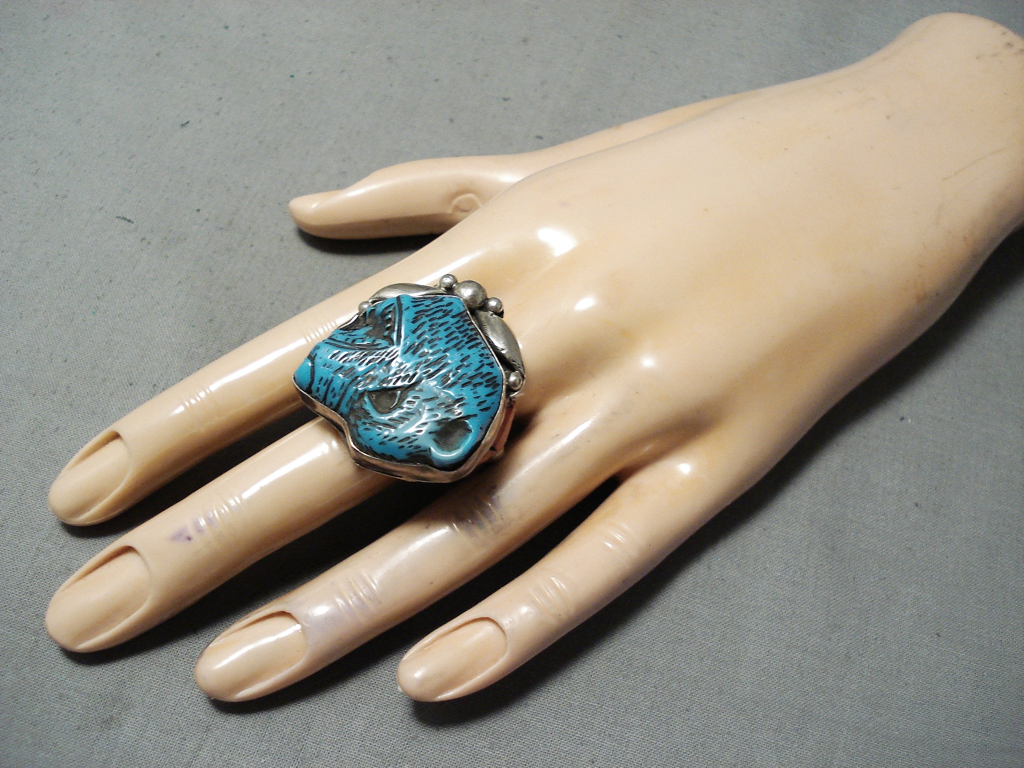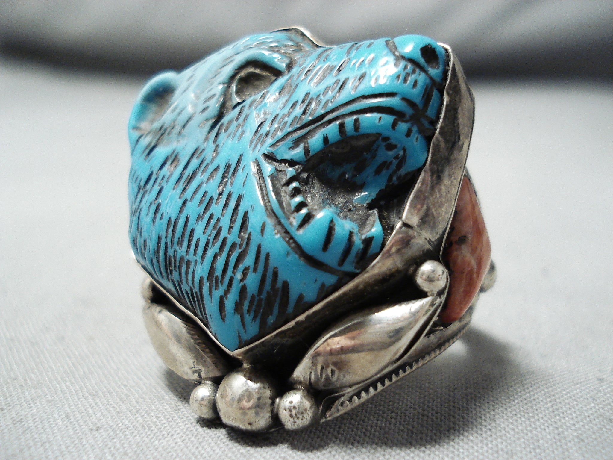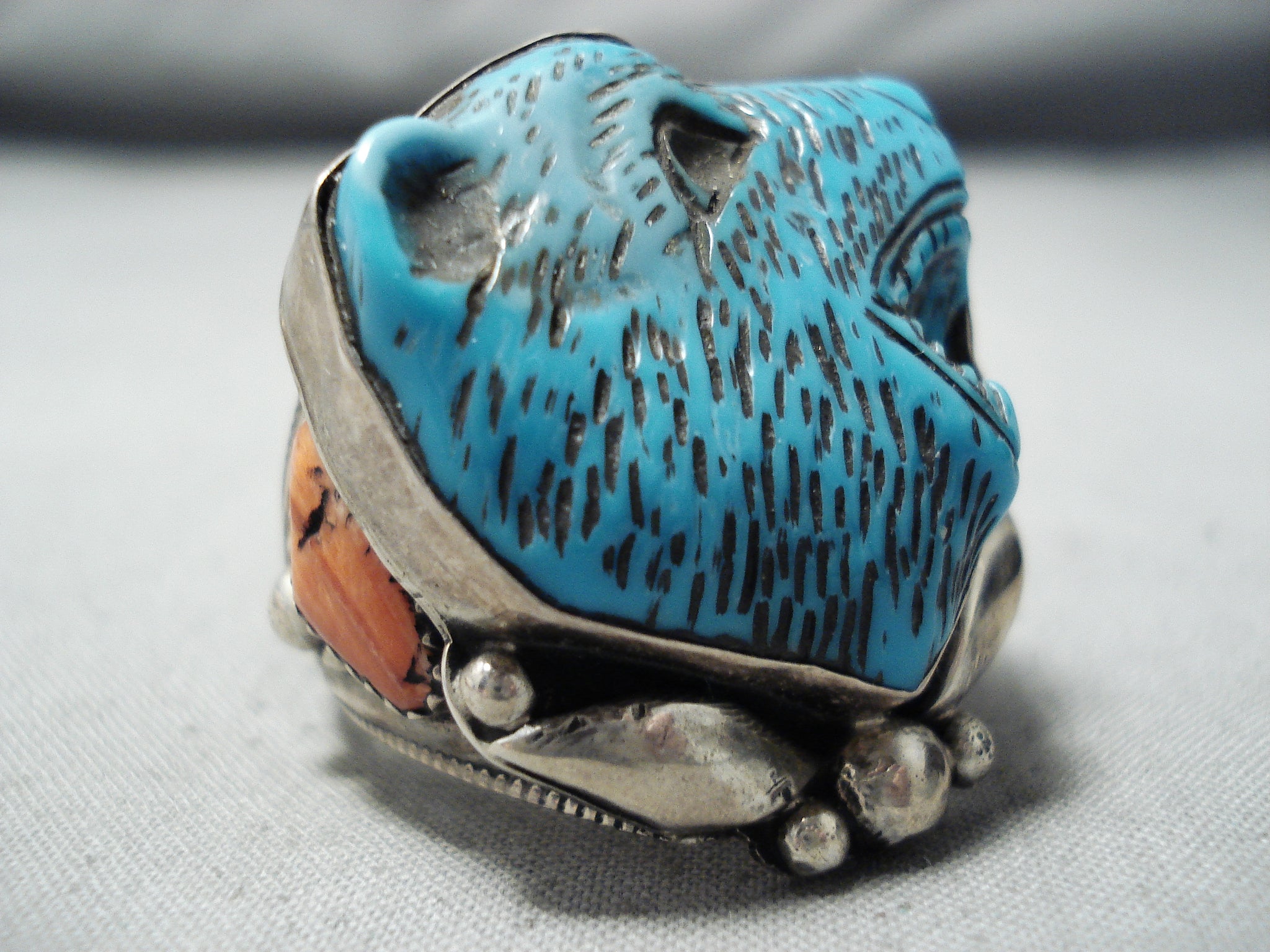 Native American One Of The Best Ever Vintage Turquoise Animal Head Sterling Silver Ring