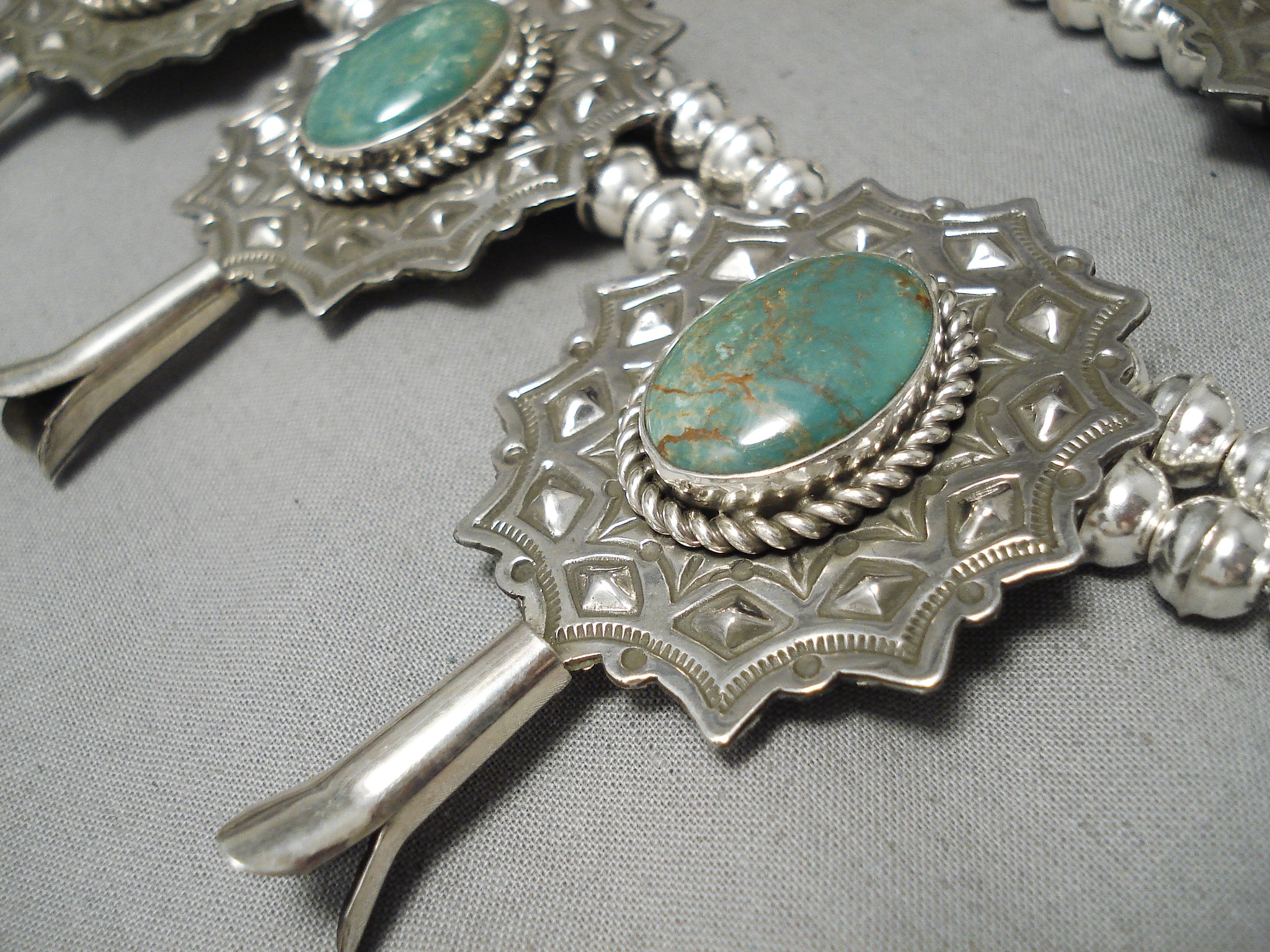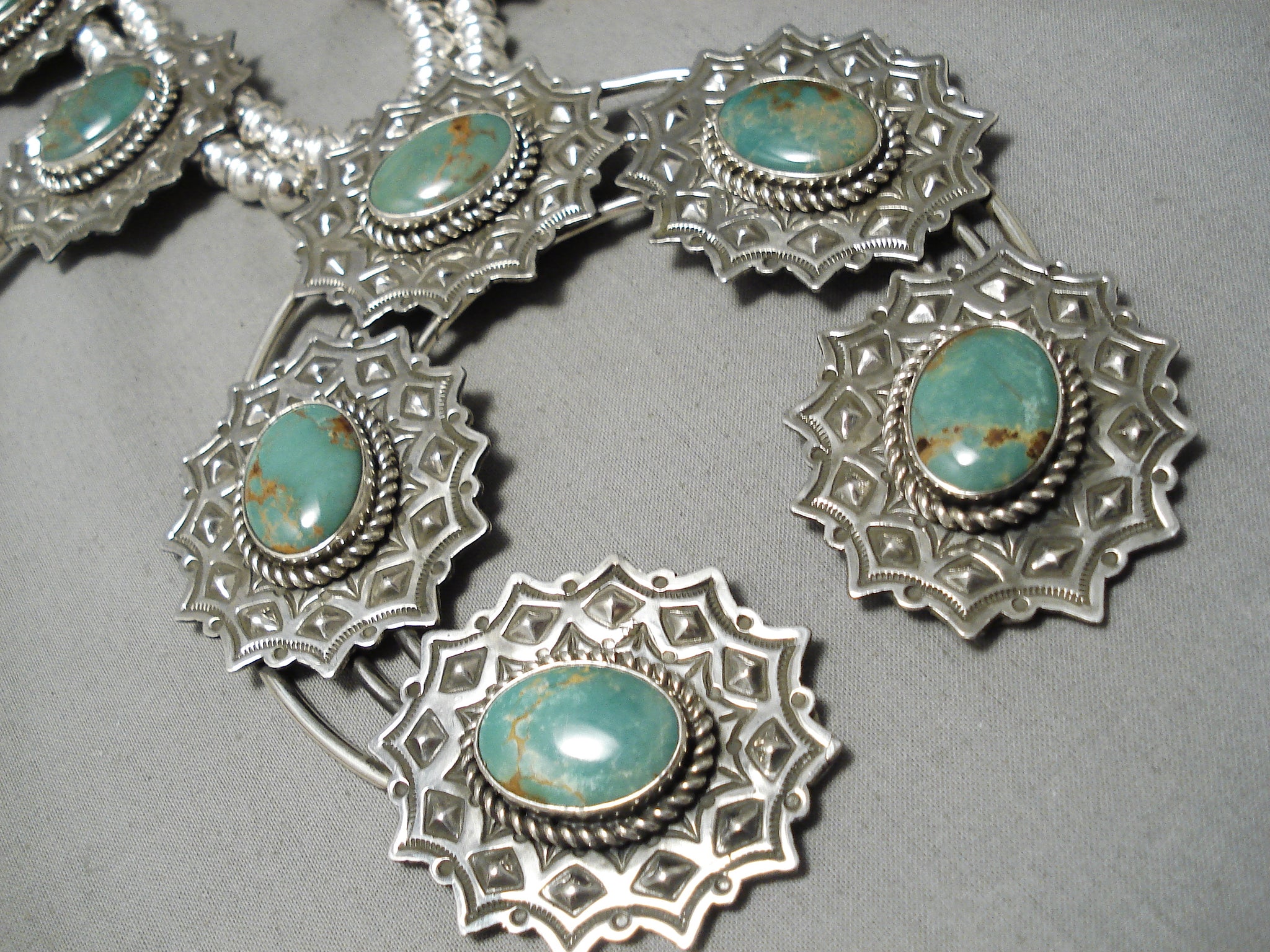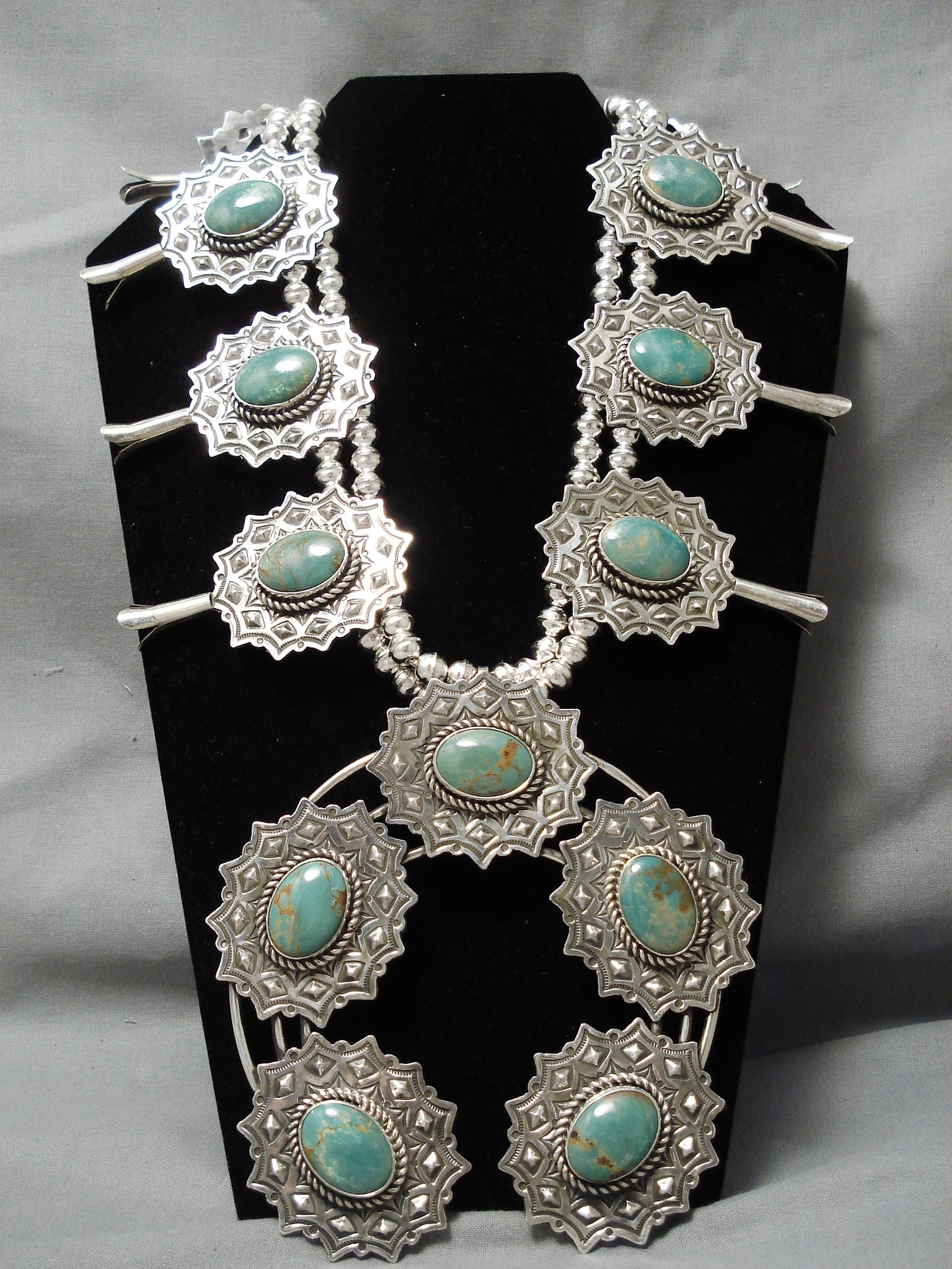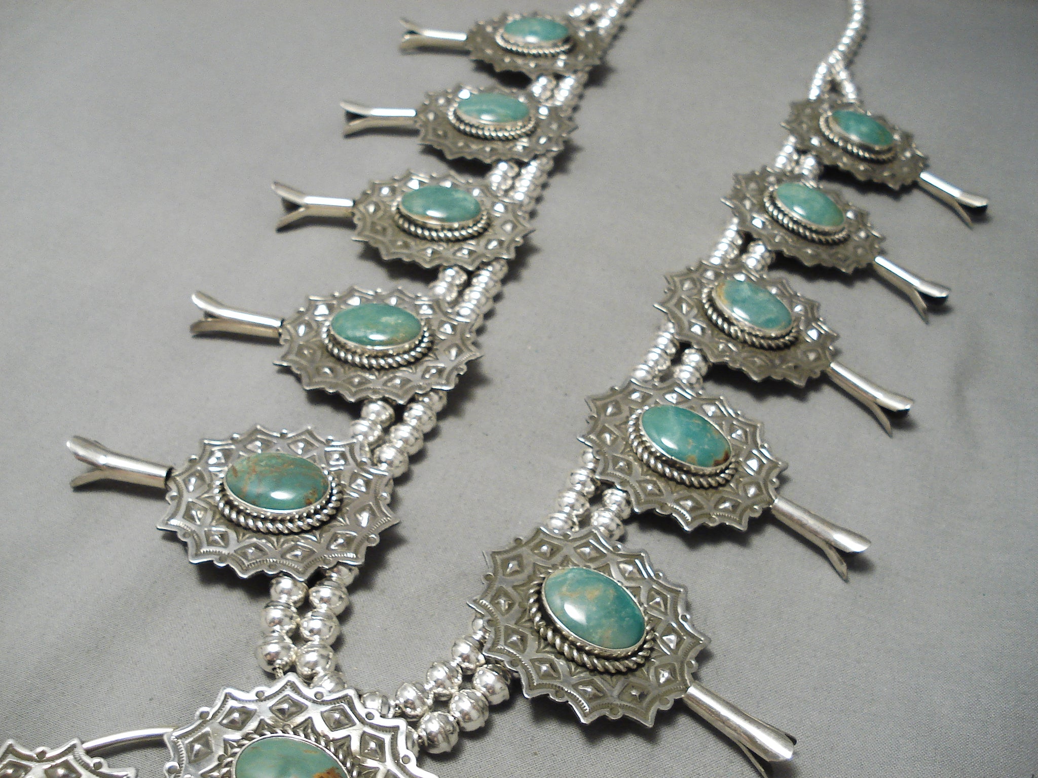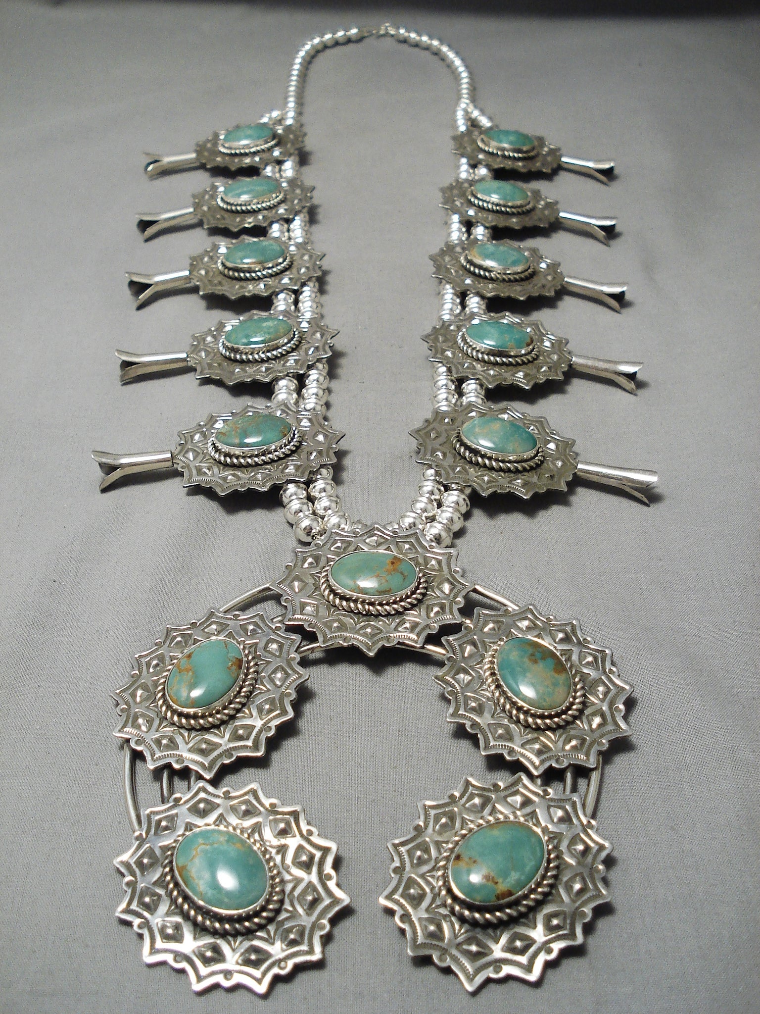 Native American One Of The Biggest Naja Green Turquoise Sterling Silver Squash Blossom Necklace
