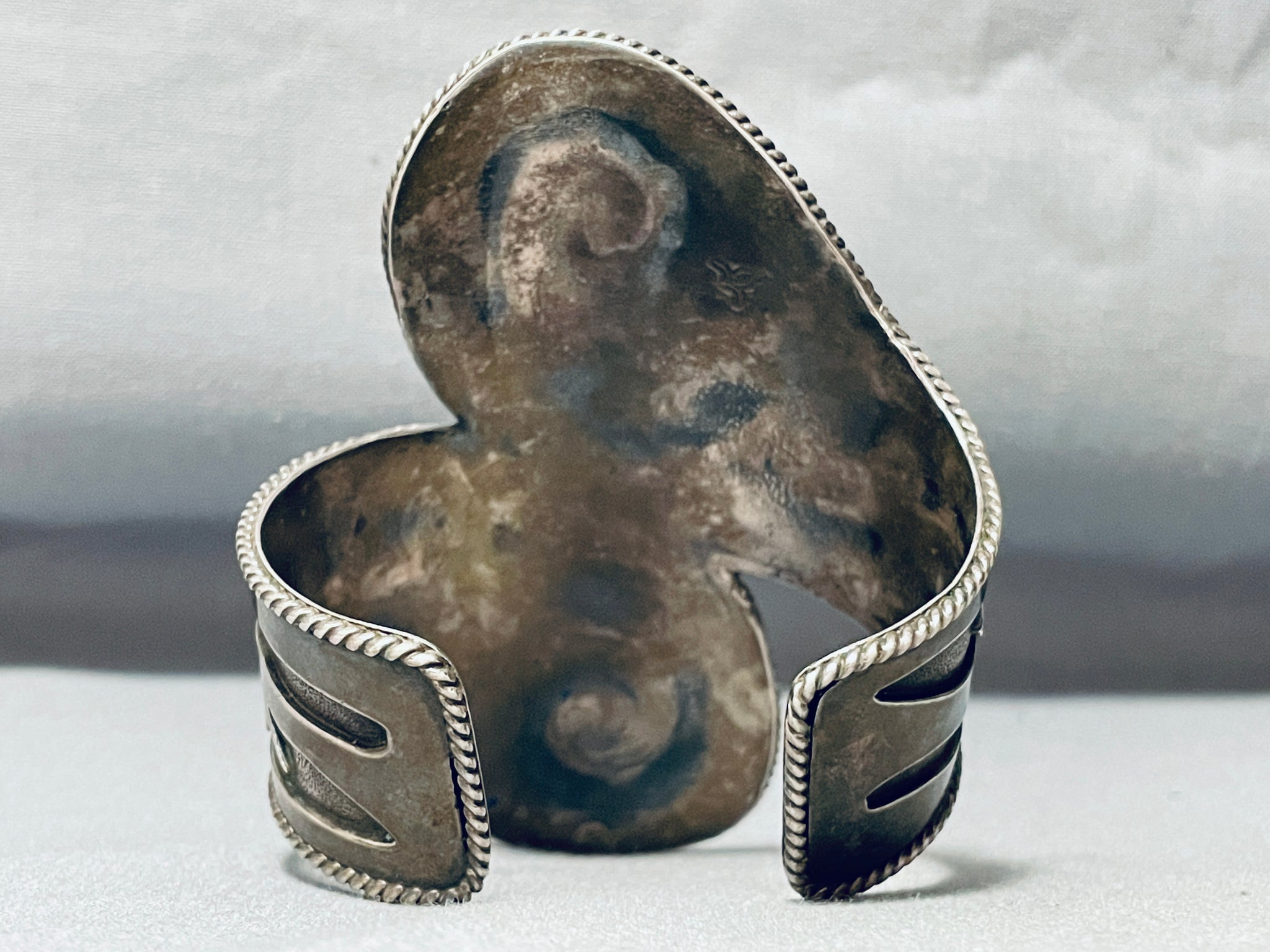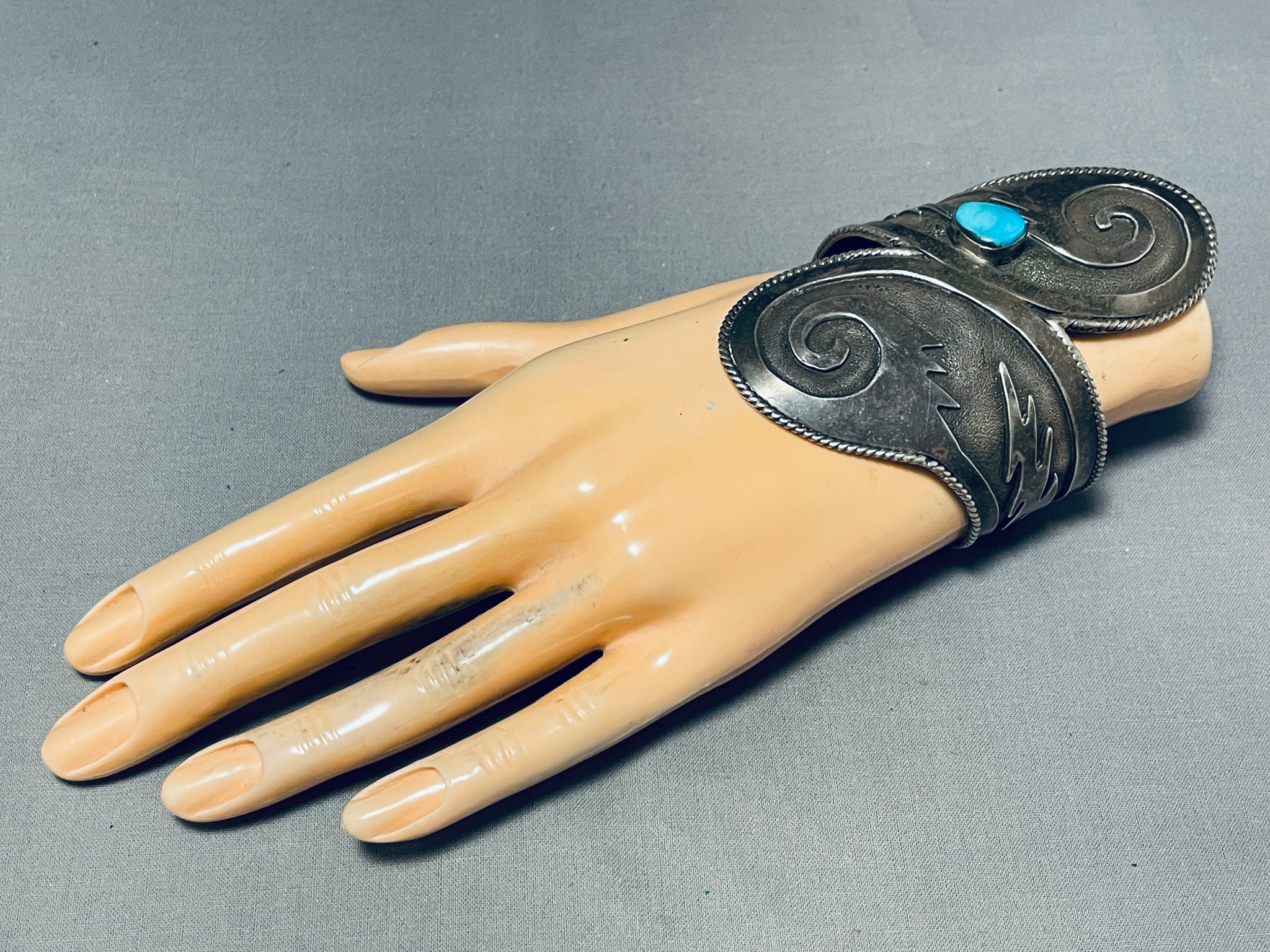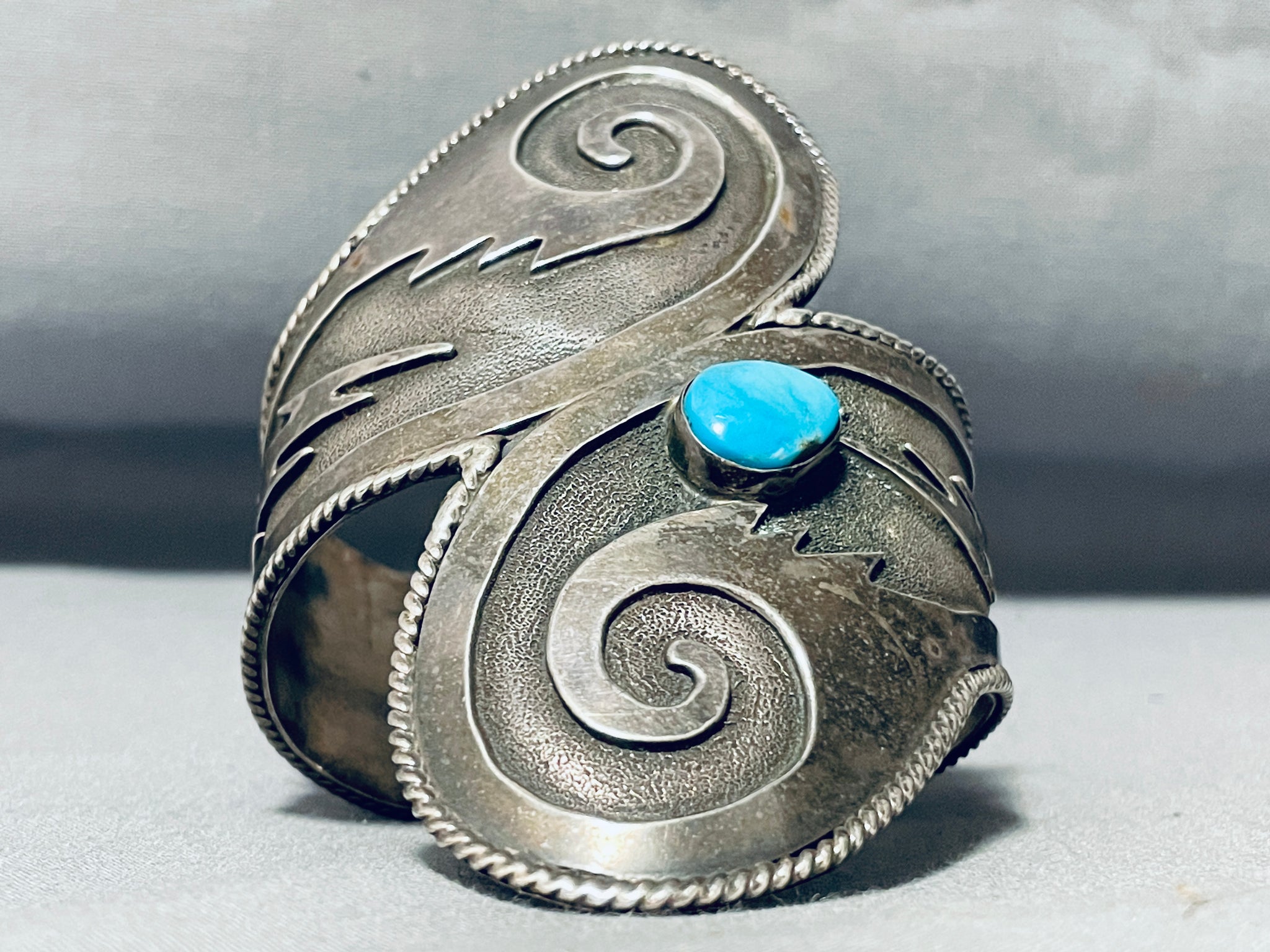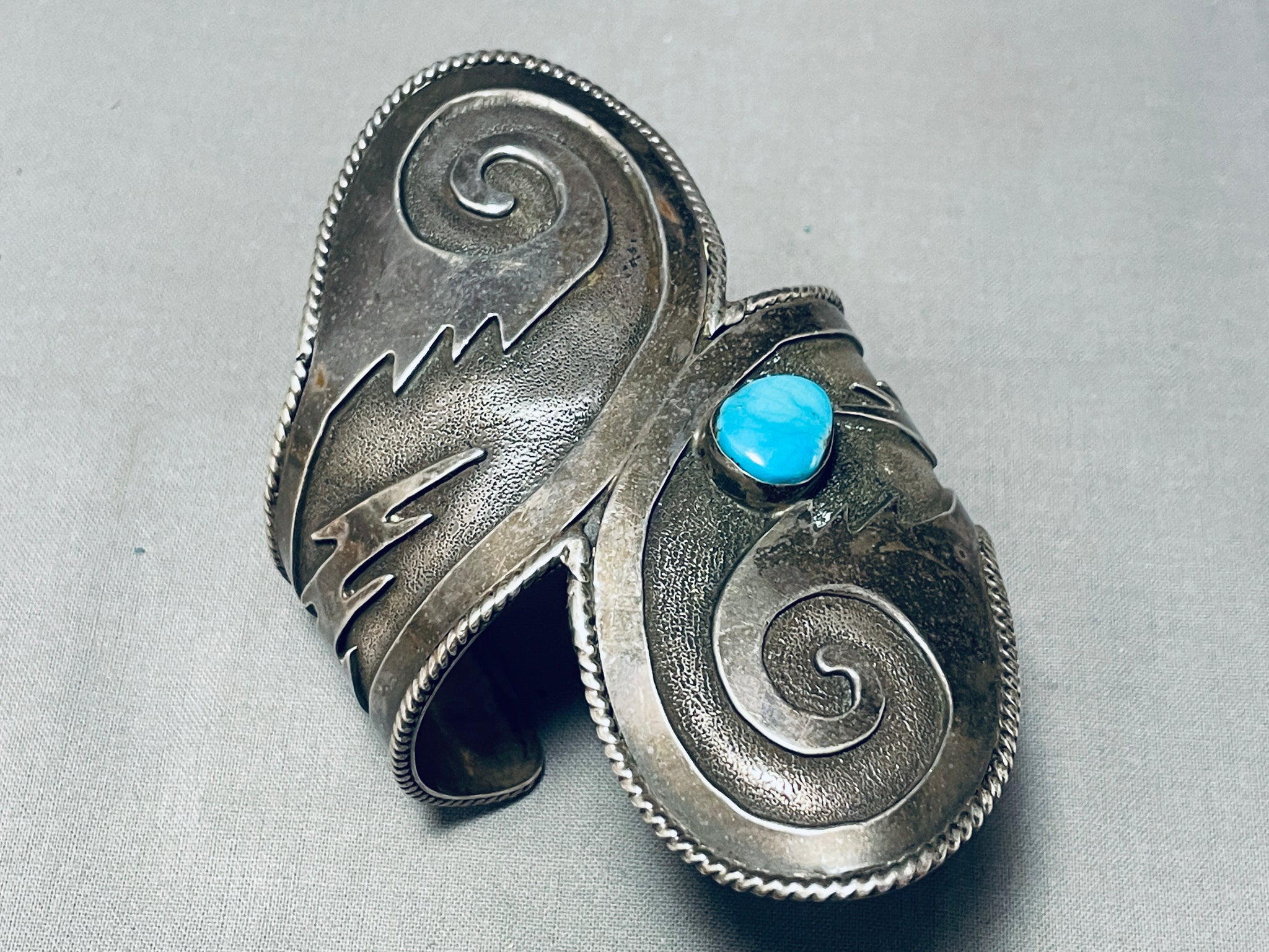 This is a magnificent vintage Native American single stone silver bracelet. This bracelet is large and contains a beautiful center blue colored turquoise stone. The silver works on this bracelet is just astonishing consisting of beautiful swirling patterns with accenting lightning bolts. Bordering the entire cuff of the bracelet are marvelous silver ropes that run completely around the edges of the cuff. The height at the center of this phenomenal bracelet measures a whopping 3-3/4", wow! The center stone measures around 1/2" x 3/8". Sterling silver. Cir. 1970's+. The inside end to end measures around 5-1/2" with an additional 1" gap. Sturdy 80 grams.