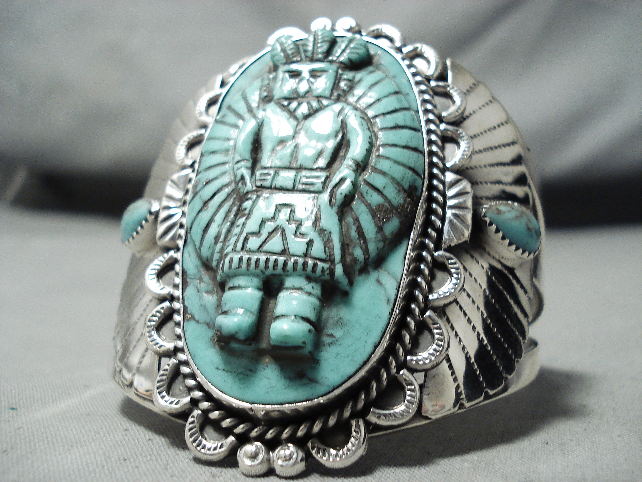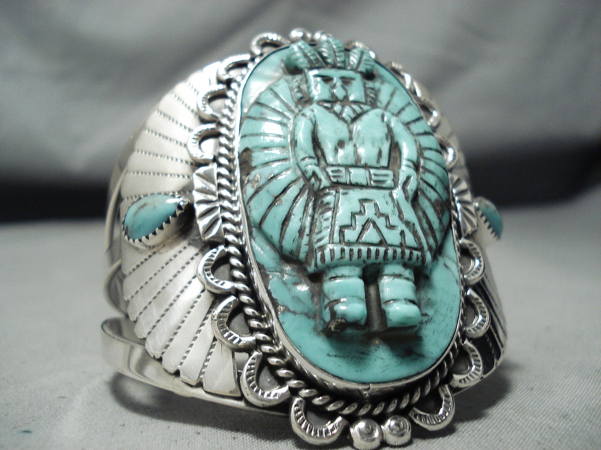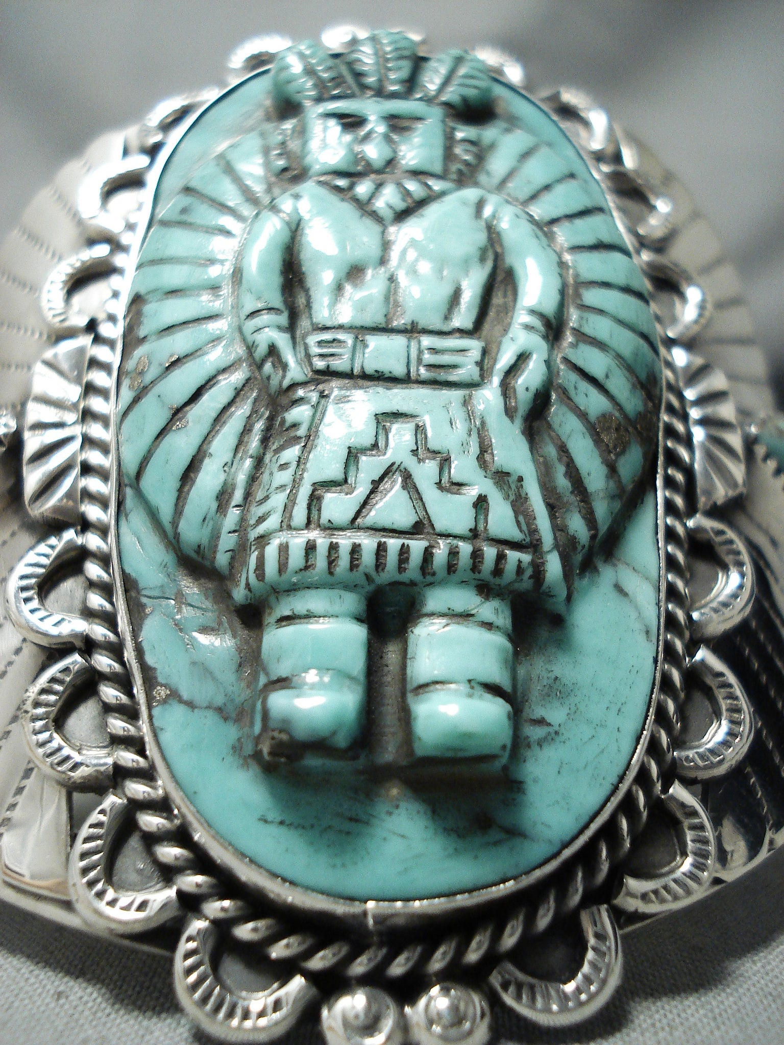 Native American One Of The Finest Ever Hand Carved Turquoise Sterling Silver Bracelet