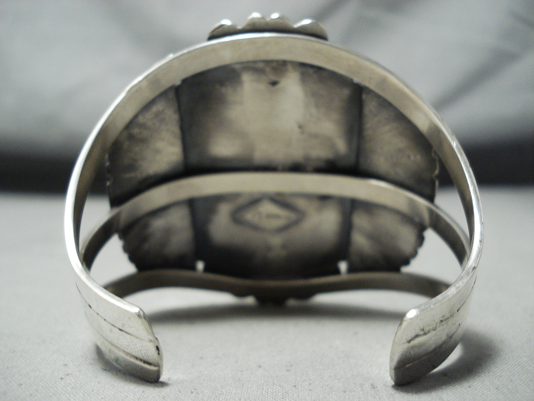 This is a superior hand carved turquoise silver bracelet handmade by one of the most famous and best stone carvers of our time, Francisco Gomez. This piece contains a remarkable center hand carved turquoise stone that is carved into a kachina. Surrounding the stone are impeccable silver works that consist of wave works, shells and a thick silver rope. Resting at the sides of the marvelous thick and sturdy triple silver shank cuff are huge hand carved sun bursting silver flanks with accenting teardrop shaped turquoise stones. The center stone measures around 2-1/4" x 1-1/4". The width of the bracelet measures around 2-3/4". Signed by artist, Francisco Gomez. Sterling silver, marked. Cir. 1970's+. The inside end to end measures around 5-3/4" with an additional 1-1/4" gap. Sturdy 84 grams.