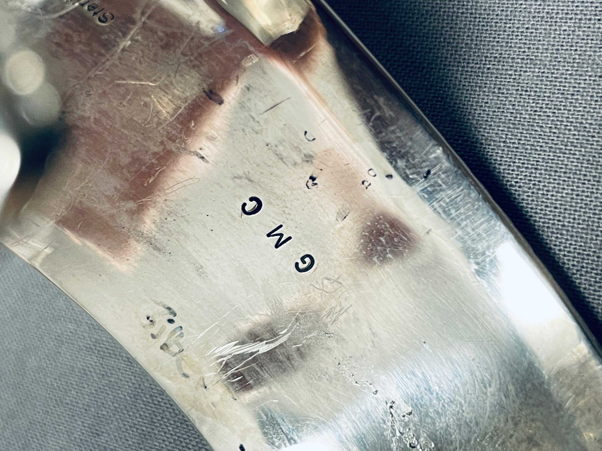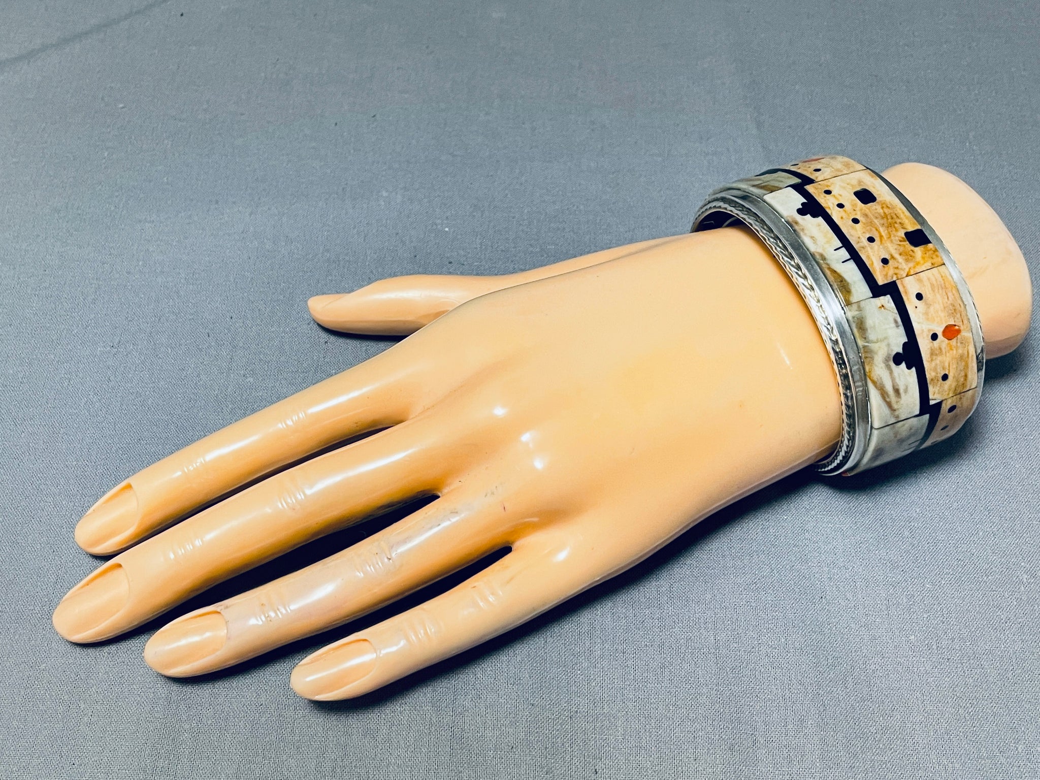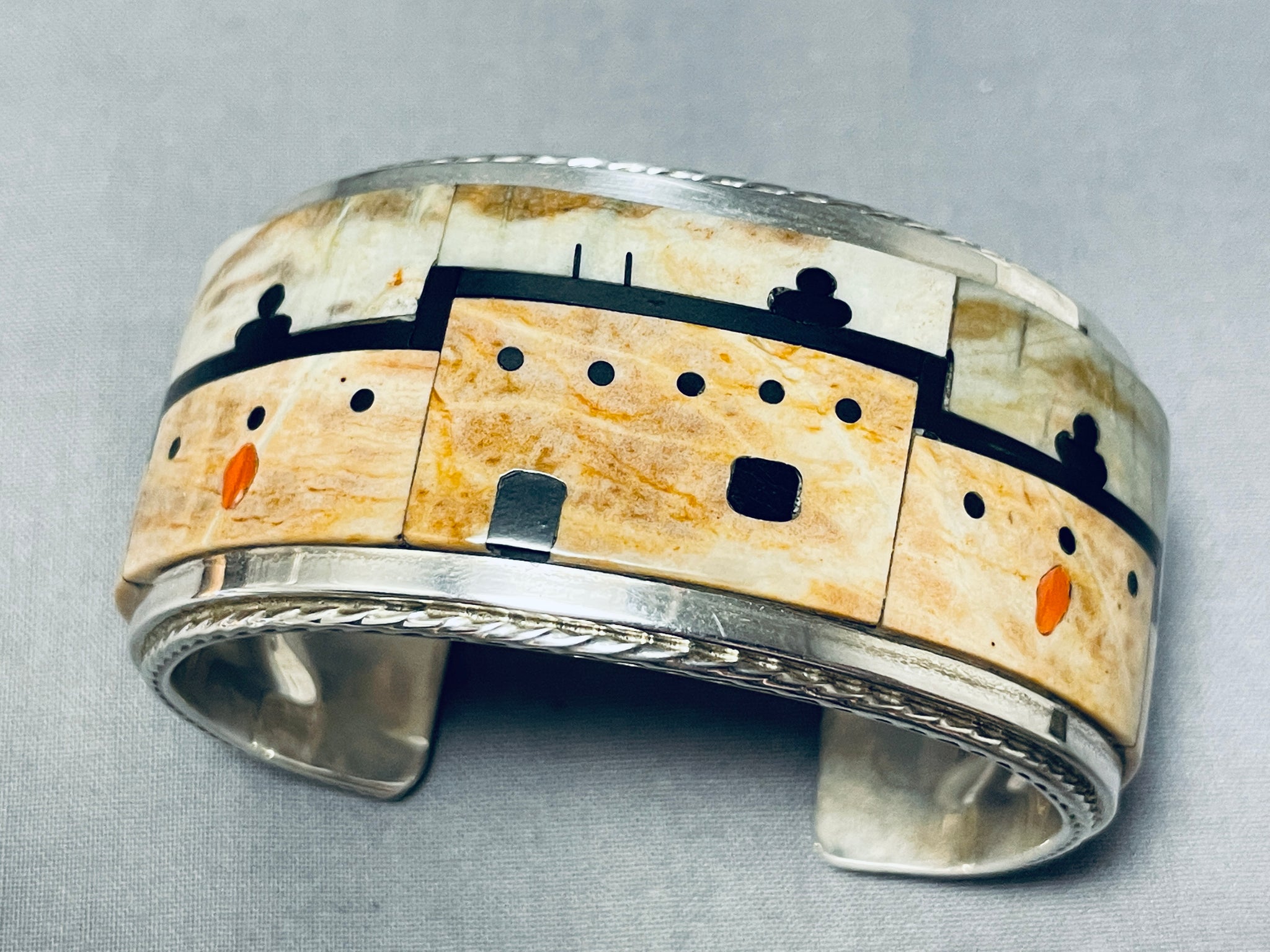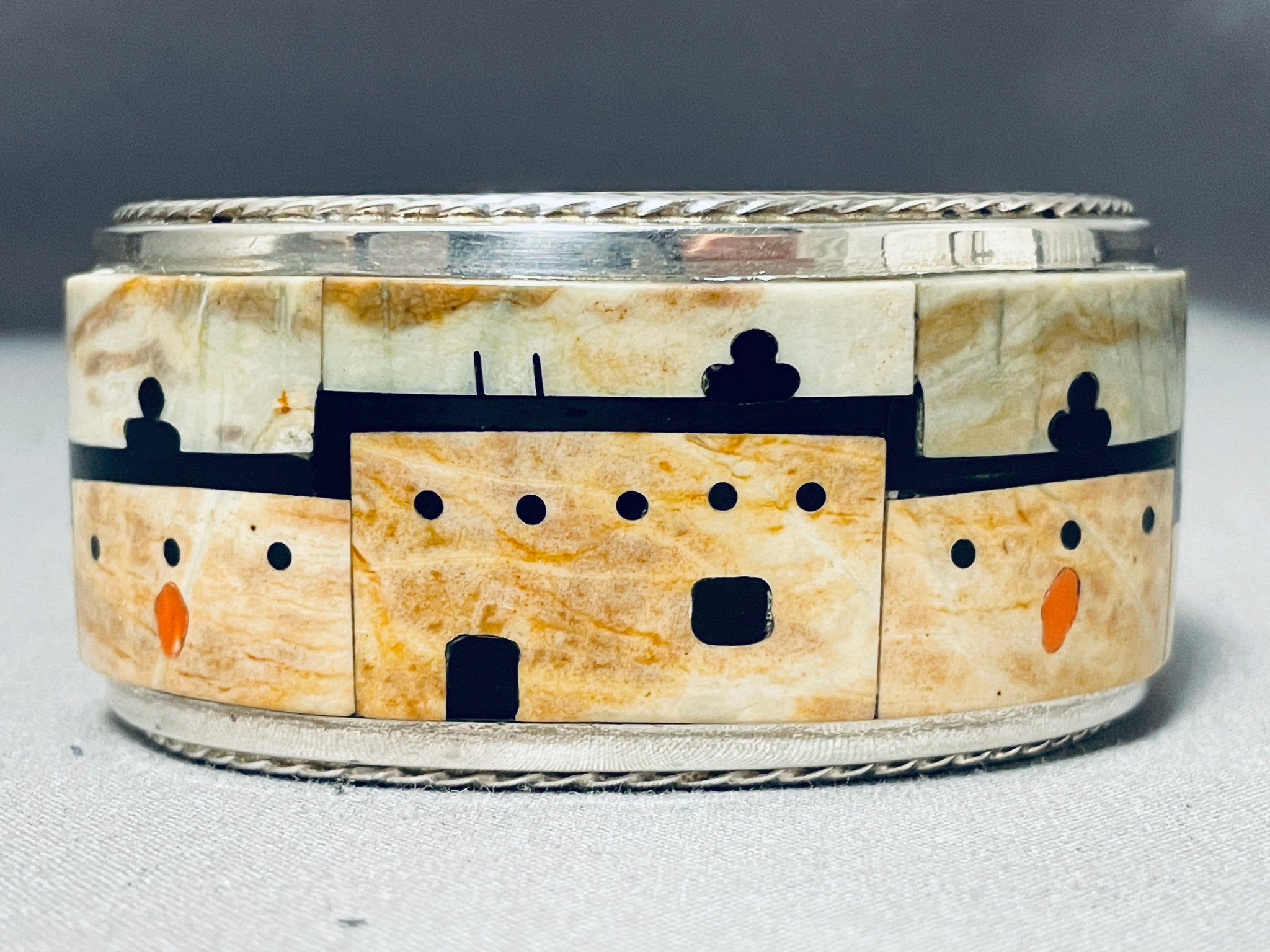 This is an impressive Zuni inlaid thick and wide cuff silver bracelet. This amazing bracelet contains an intricate inlay pattern that wraps around the entire cuff. The inlay consists of tan shells, onyx, coral, Sleeping Beauty turquoise, mother of pearl and even possibly very rare Lander Blue turquoise stones. The inlay workmanship is in a stunning pueblo formation with end channel works. Bordering the thick and wide silver cuff are remarkable silver ropes. The width of the bracelet measures around 1-1/4". Signed by Zuni artist, Gilbert Calavaza. Sterling silver, marked. Cir. 1980's+. The inside end to end measures around 5-3/4" with an additional 1-1/4" gap. Sturdy 100 grams.