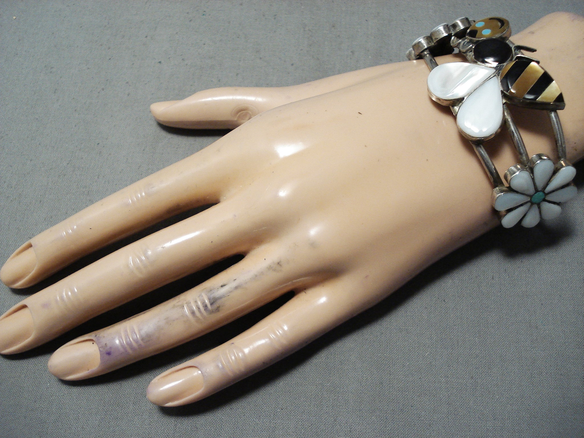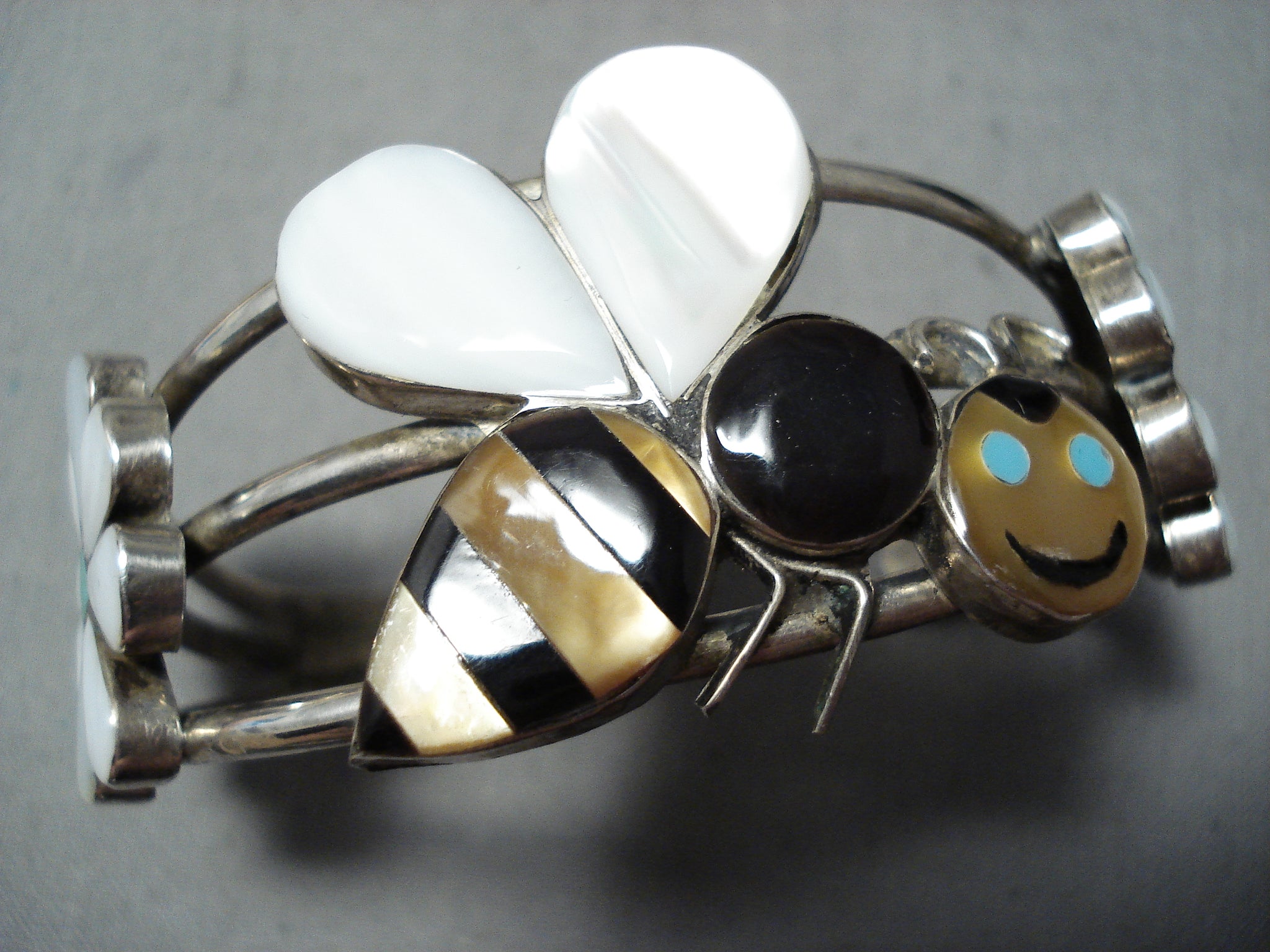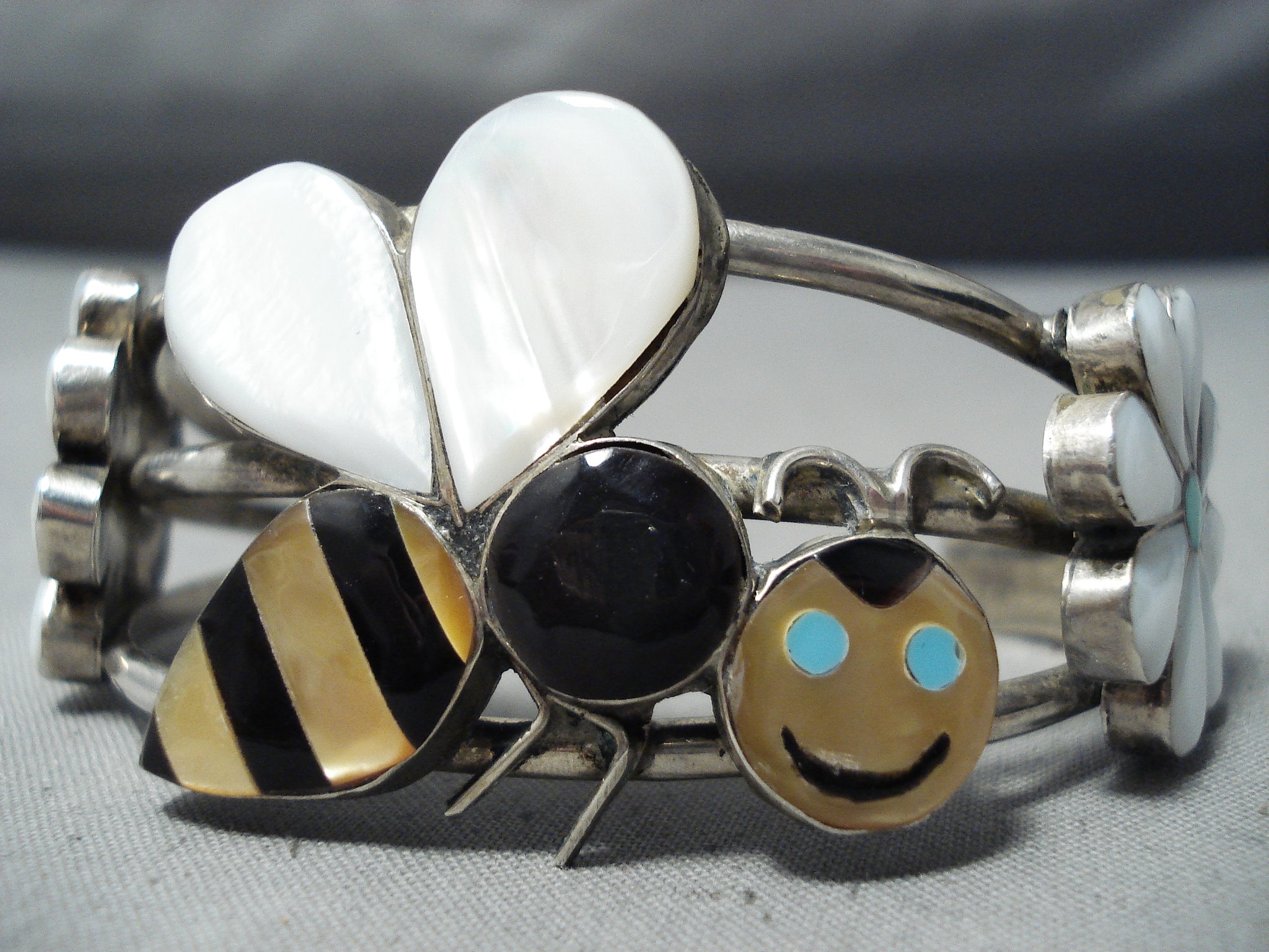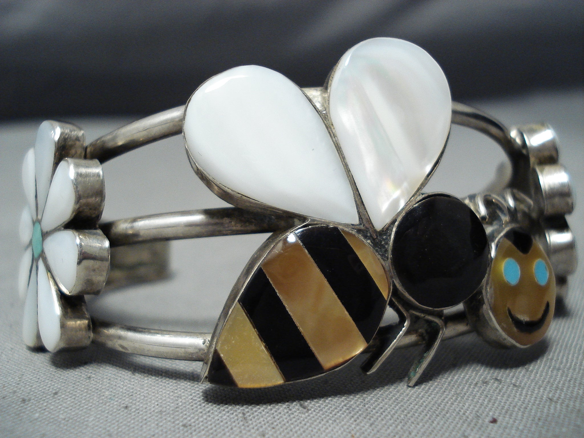 Native American One Of The Most Detailed Vintage Zuni Bee Sterling Silver Turquoise Bracelet
