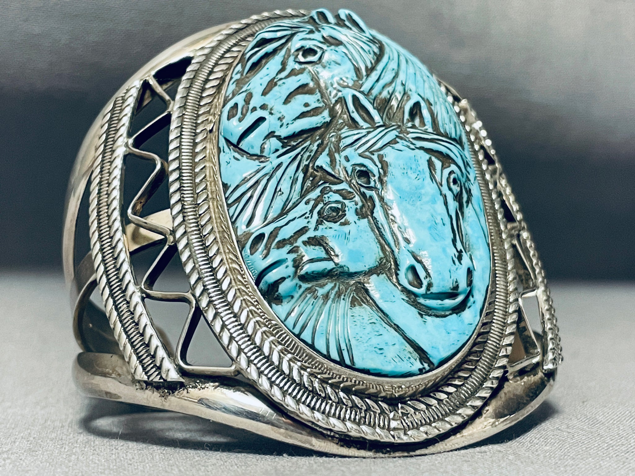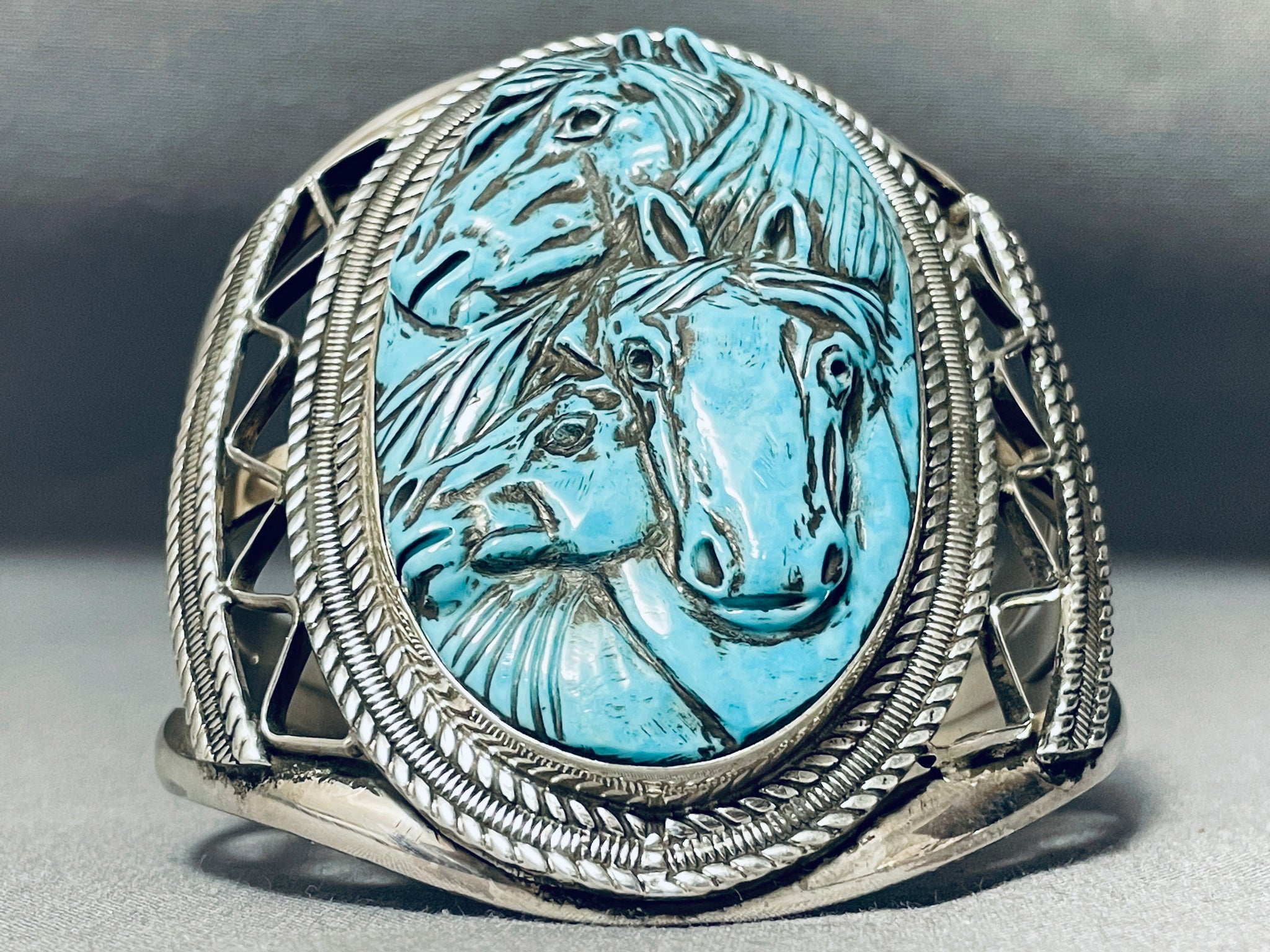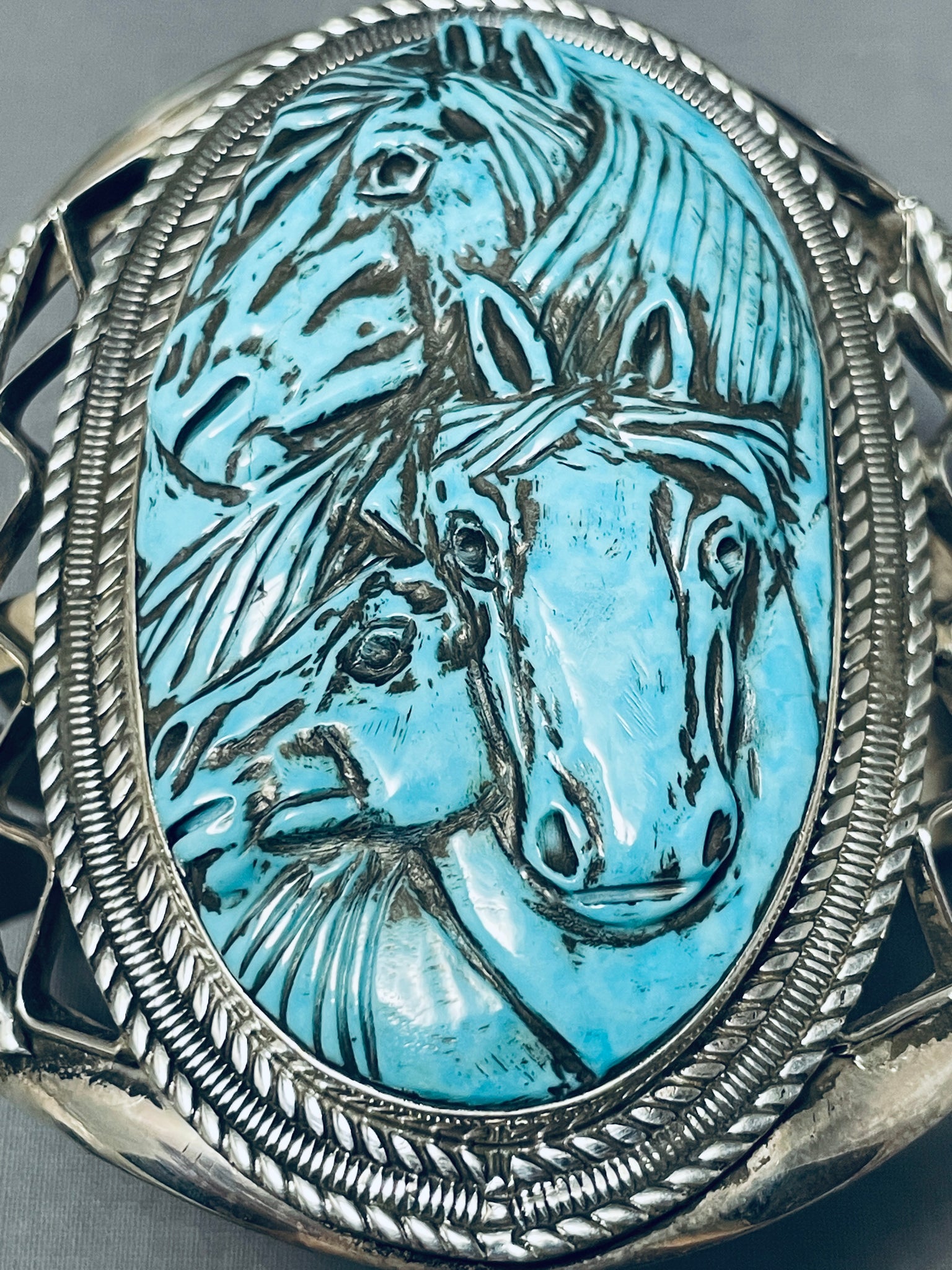 This is a museum quality large hand carved single stone silver bracelet handmade by the famous artist, Francisco Gomez. This impeccable bracelet contains a huge center hand carved single stone that appears to be from the incredible Sleeping Beauty turquoise mine. The carving on the stone is absolutely impressive and contains three hand carved VERY DETAILED horses. Bordering the turquoise stone are wonderful silver ropes and channel works with accenting zigzag flanks and more beautiful rope flanks. This bracelet includes a stunning thick and sturdy triple silver shank cuff that is heavy. The center stone measures around 2-3/8" x 1-1/2". The width of the bracelet measures around 3". Signed by artist, Francisco Gomez. Sterling silver, marked. Cir. 1970's+. The inside end to end measures around 6" with an additional 1-1/4" gap. Sturdy 96 grams.