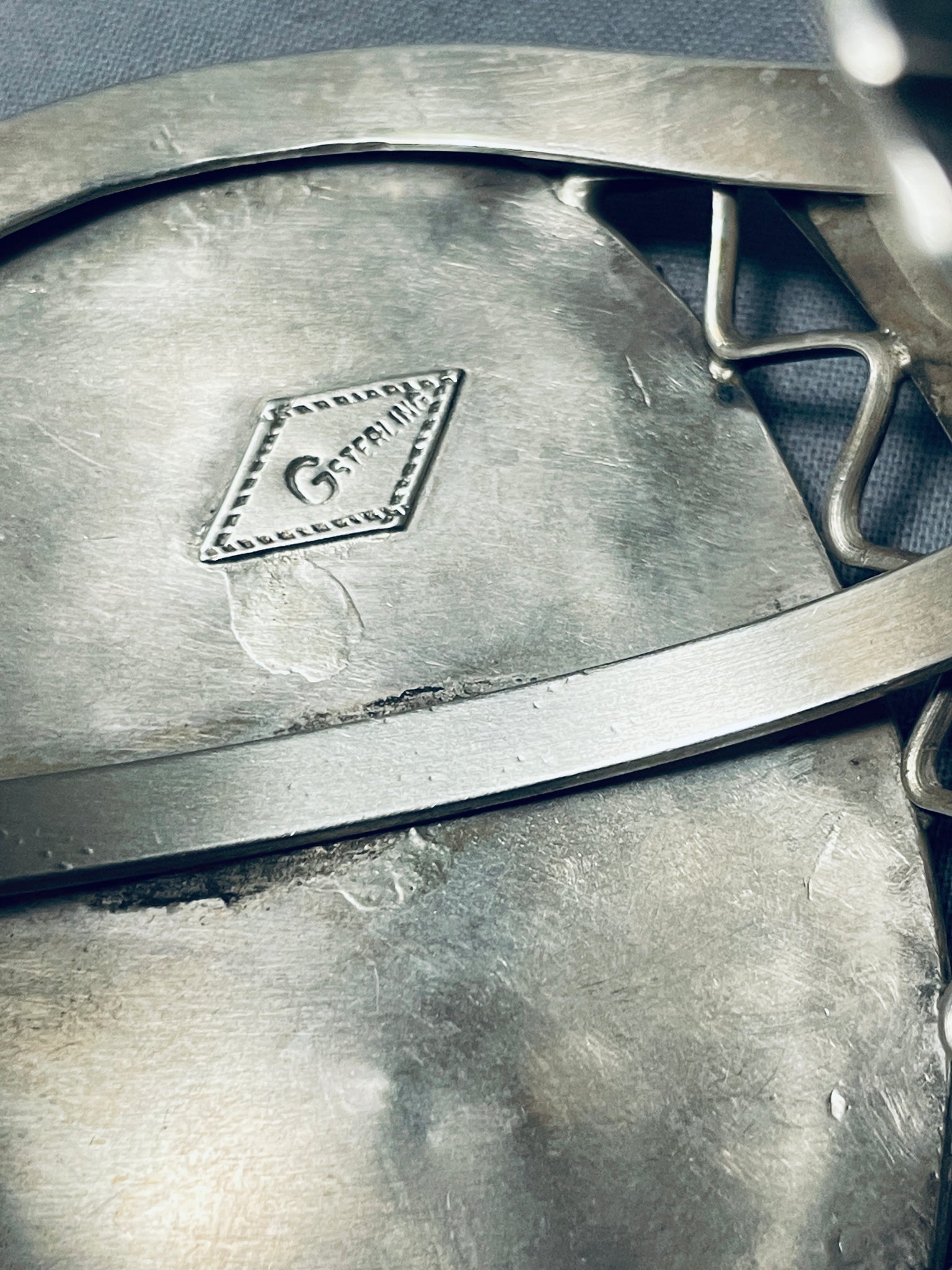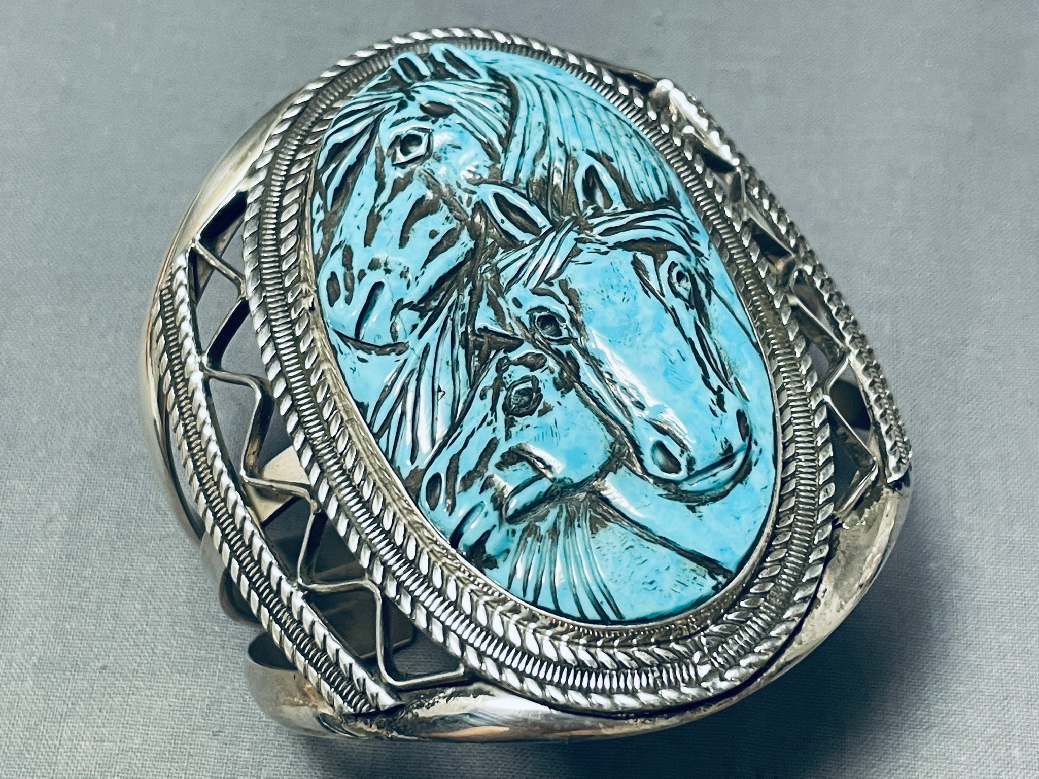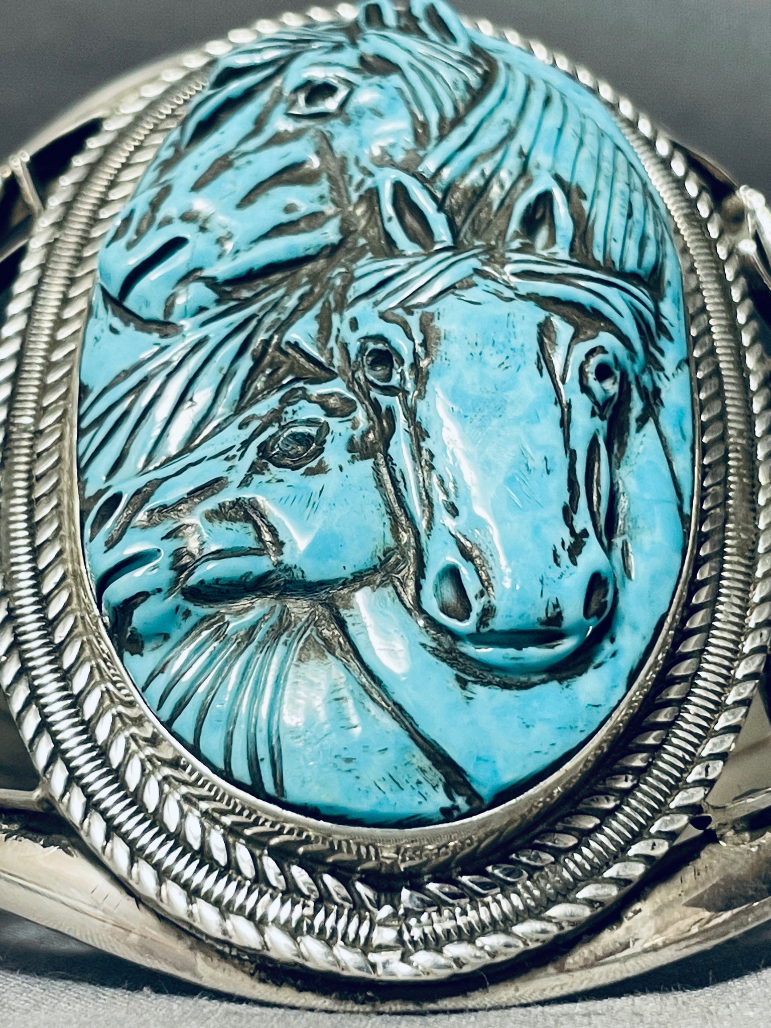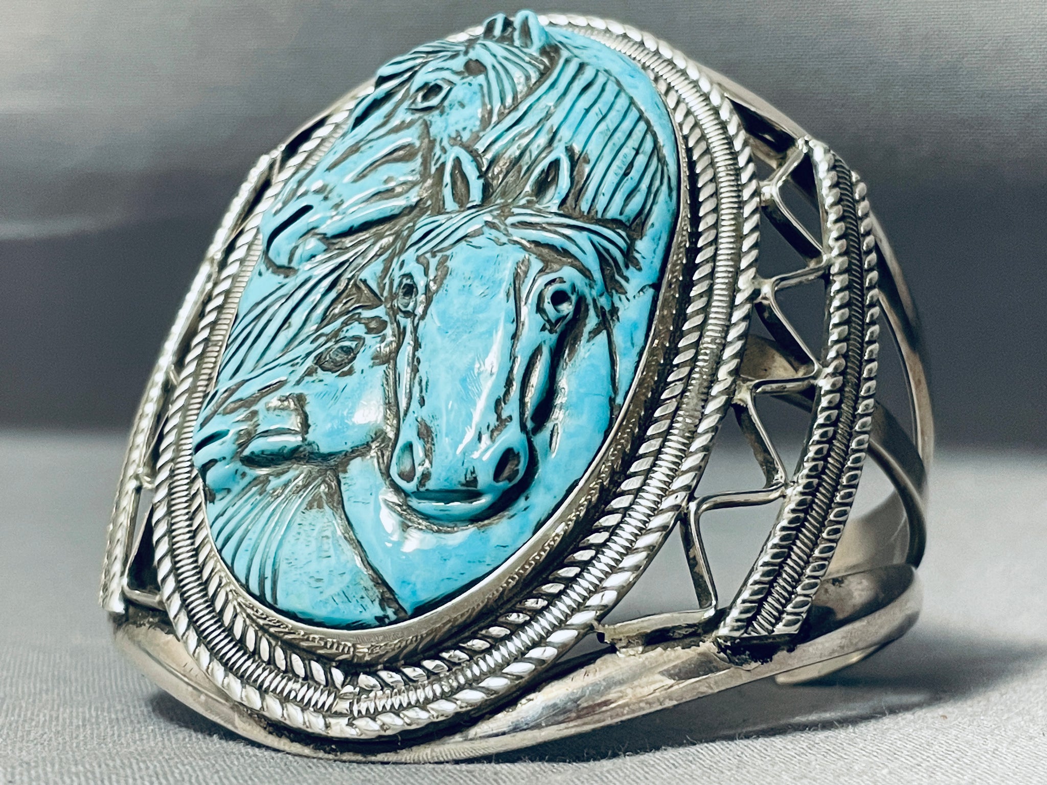 This is a museum quality large hand carved single stone silver bracelet handmade by the famous artist, Francisco Gomez. This impeccable bracelet contains a huge center hand carved single stone that appears to be from the incredible Sleeping Beauty turquoise mine. The carving on the stone is absolutely impressive and contains three hand carved VERY DETAILED horses. Bordering the turquoise stone are wonderful silver ropes and channel works with accenting zigzag flanks and more beautiful rope flanks. This bracelet includes a stunning thick and sturdy triple silver shank cuff that is heavy. The center stone measures around 2-3/8" x 1-1/2". The width of the bracelet measures around 3". Signed by artist, Francisco Gomez. Sterling silver, marked. Cir. 1970's+. The inside end to end measures around 6" with an additional 1-1/4" gap. Sturdy 96 grams.