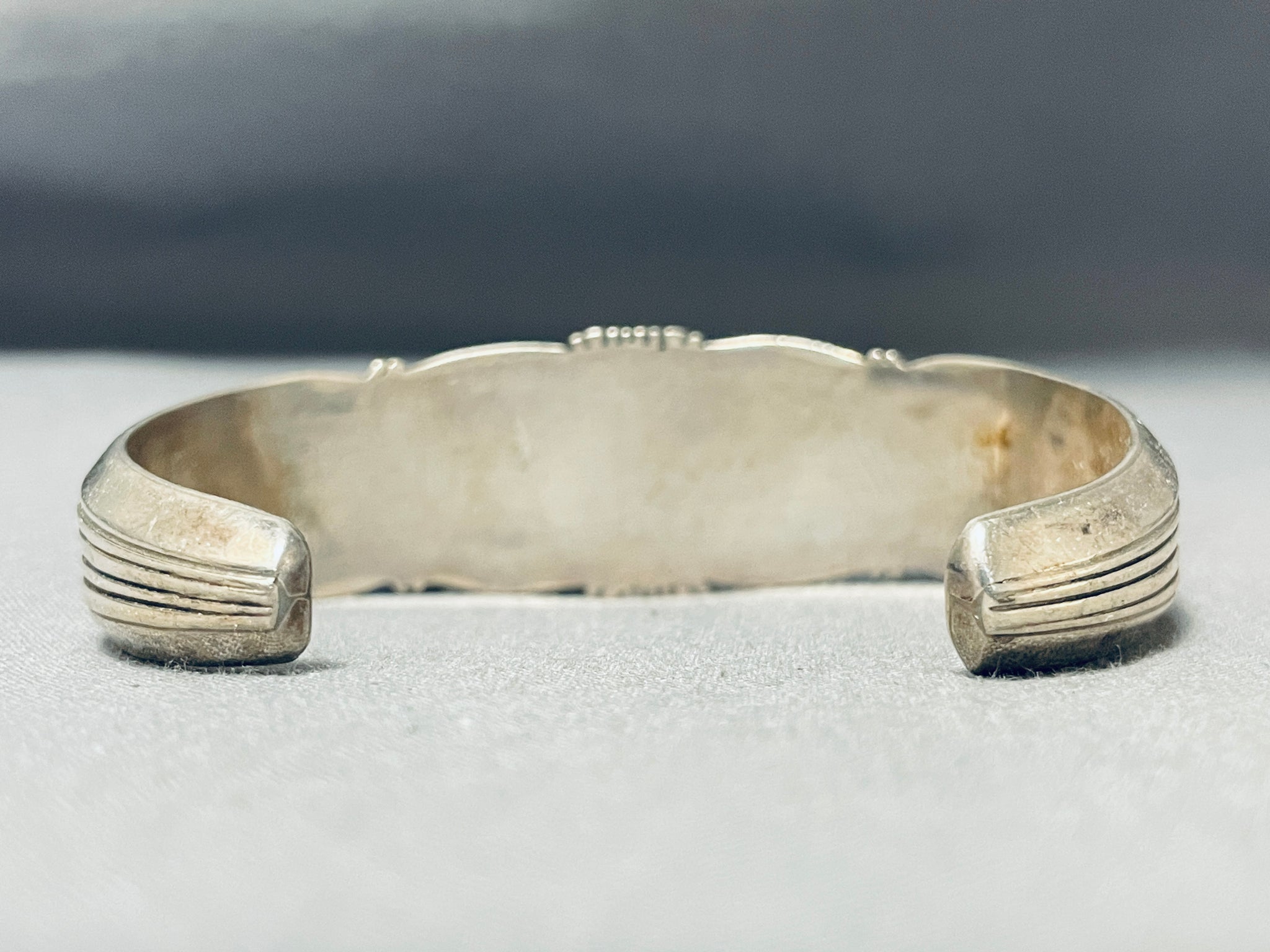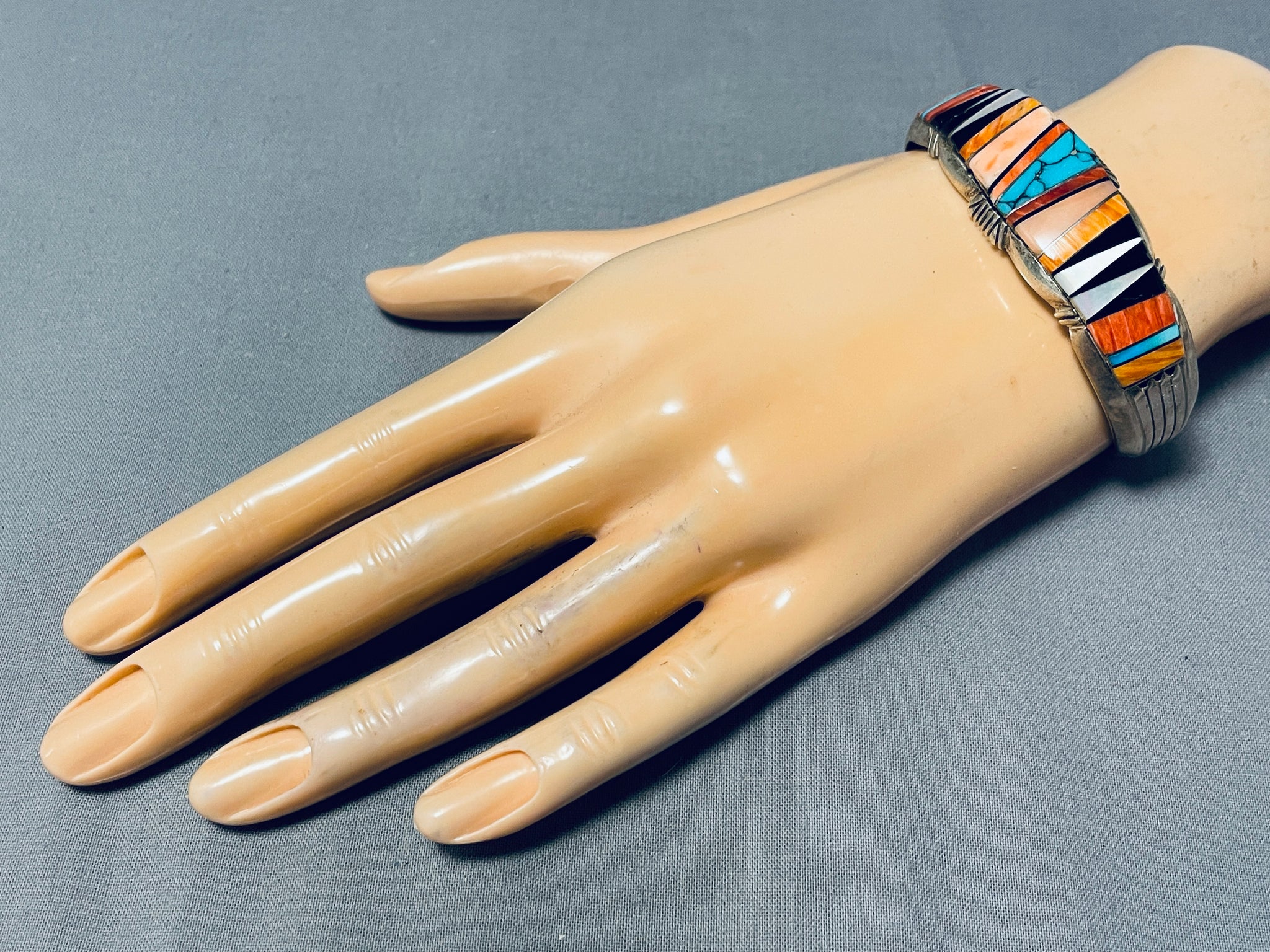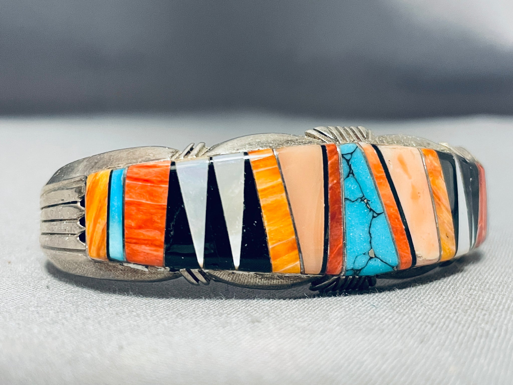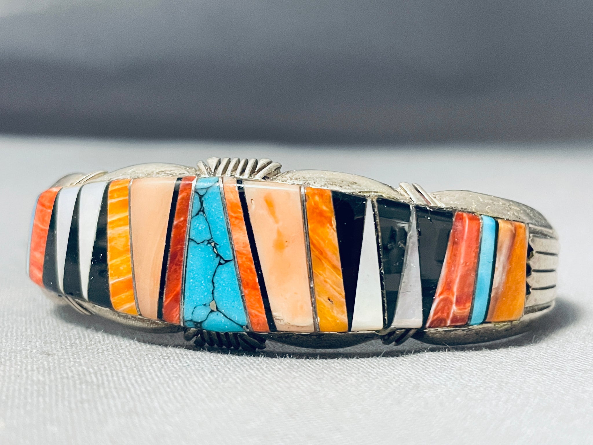 This is a fascinating Navajo inlaid thick silver cuff bracelet. This amazing bracelet contains a beautiful center unique inlaid pattern that consists of wonderful stones and shells. The stones and shells on this bracelet include mother of pearl, onyx, orange spiny oyster, red spiny oyster, pink coral, and Morenci turquoise stones. Accenting the edges of the center of the cuff are wonderful sun bursting patterns. Running down both ends of the thick silver cuff are amazing long sun bursting flanks. The width of the bracelet measures around 3/4". Sterling silver. The inside end to end measures around 5-1/4" with an additional 1-1/4" gap. Sturdy 35 grams.