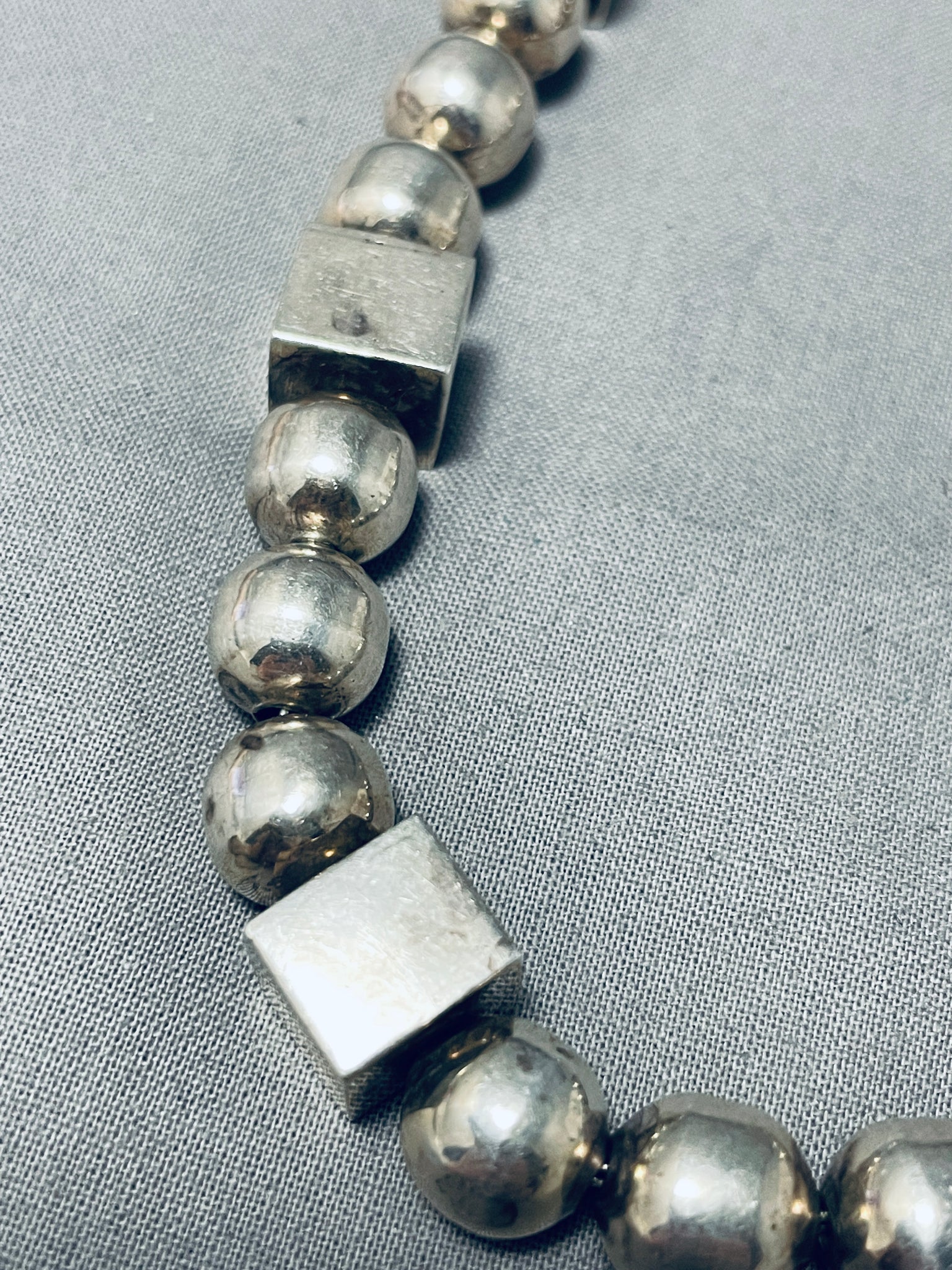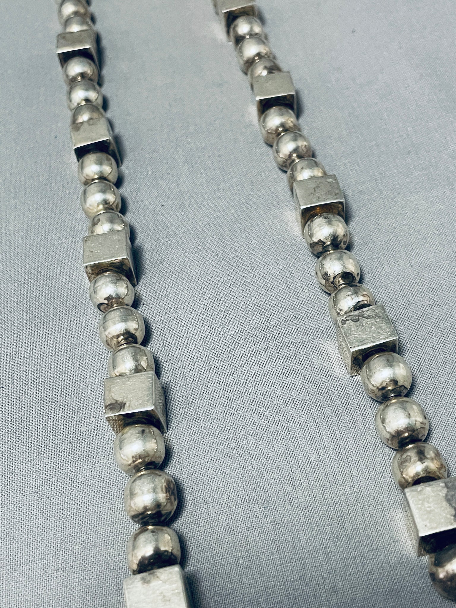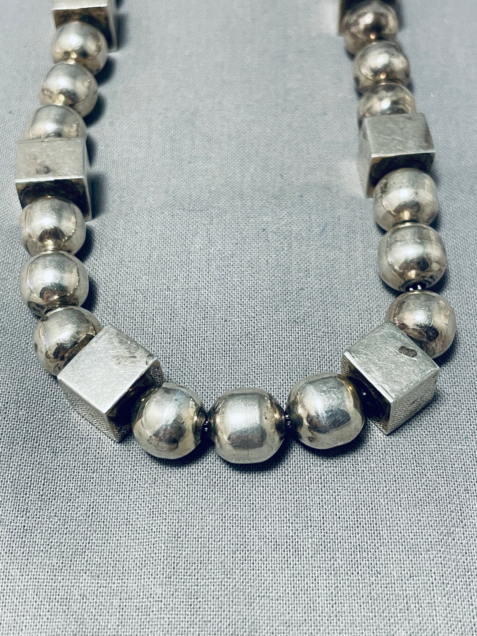 Drew note: So much work and time was involved for an artist to have to hand cut and solder all those sterling cube beads, exceptional. This is a marvelous all silver bead necklace. I absolutely love how the necklace consists of multiple handmade large round silver beads that each measure around 3/8" in diameter. Situated throughout the round silver beads are phenomenal square shaped 3D silver cubes that each measure around 3/8" X 3/8" X 3/8". The clasp on this necklace is beautiful. Taxco or Navajo. Sterling silver. Cir. 1970's+. The length of the necklace measures around 26". Sturdy 133 grams.