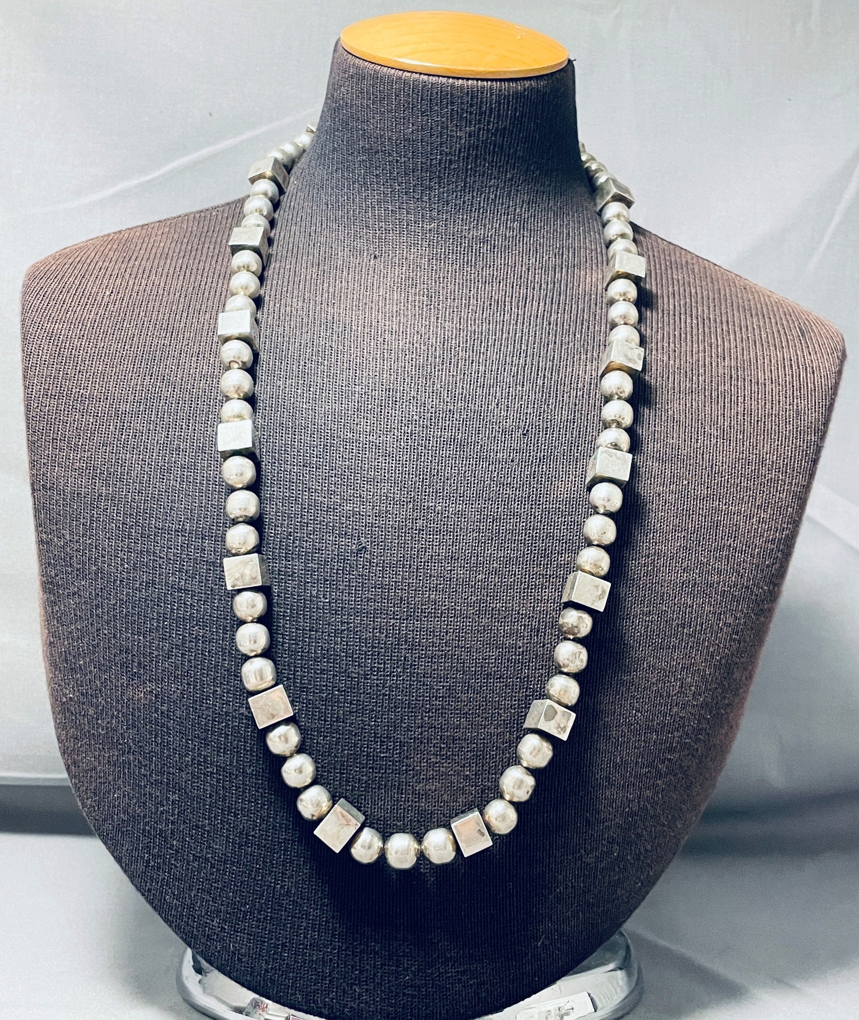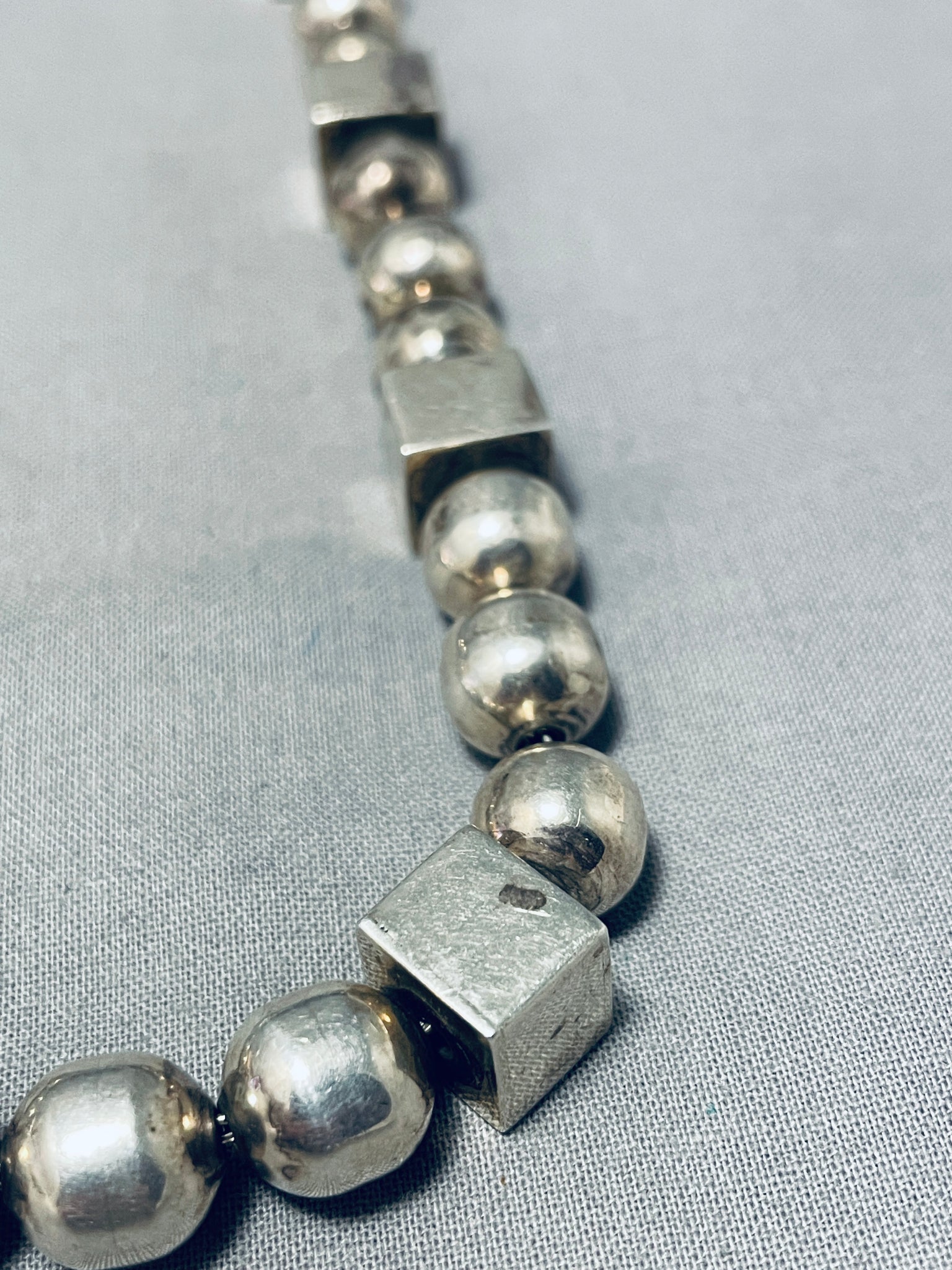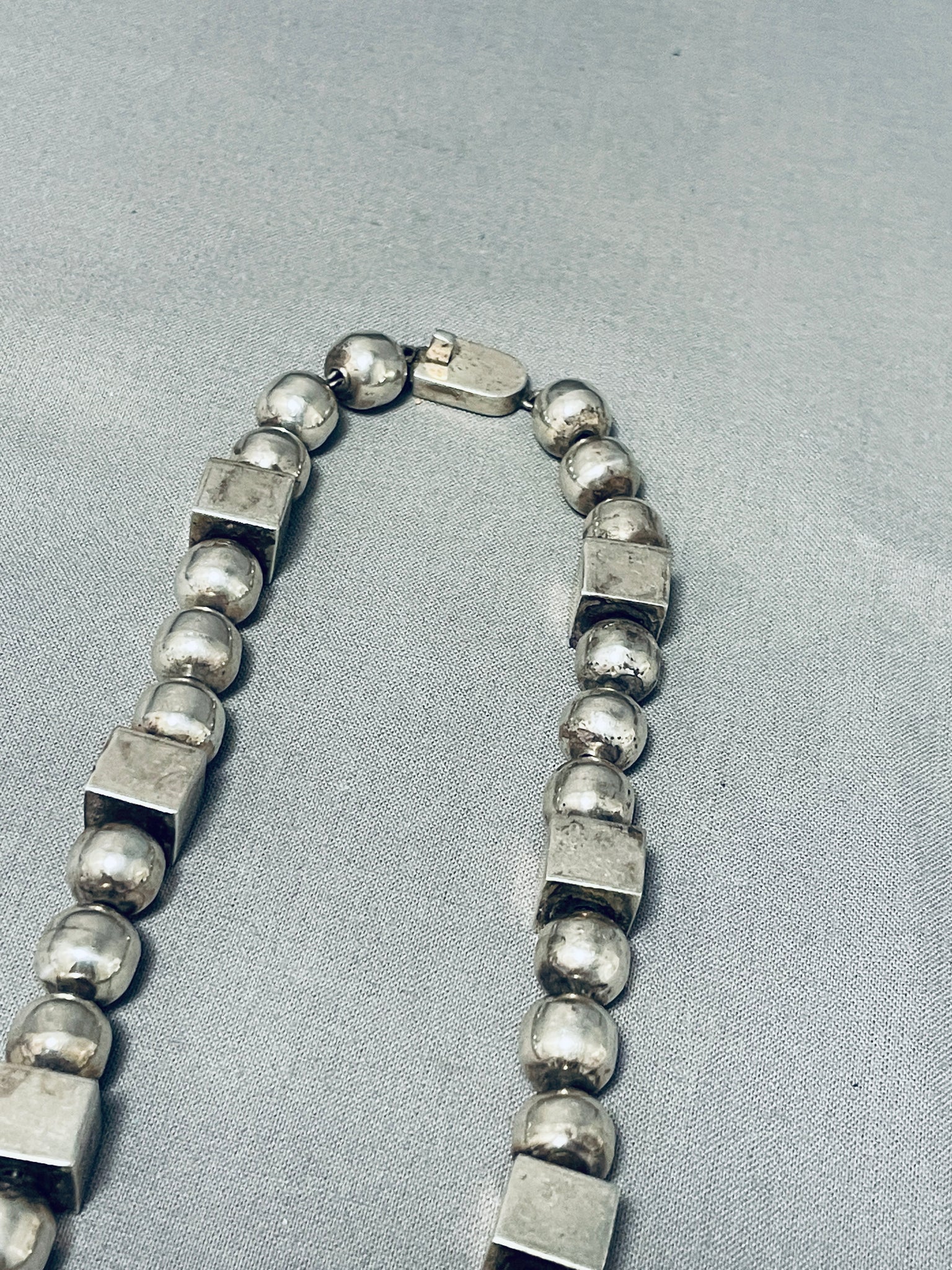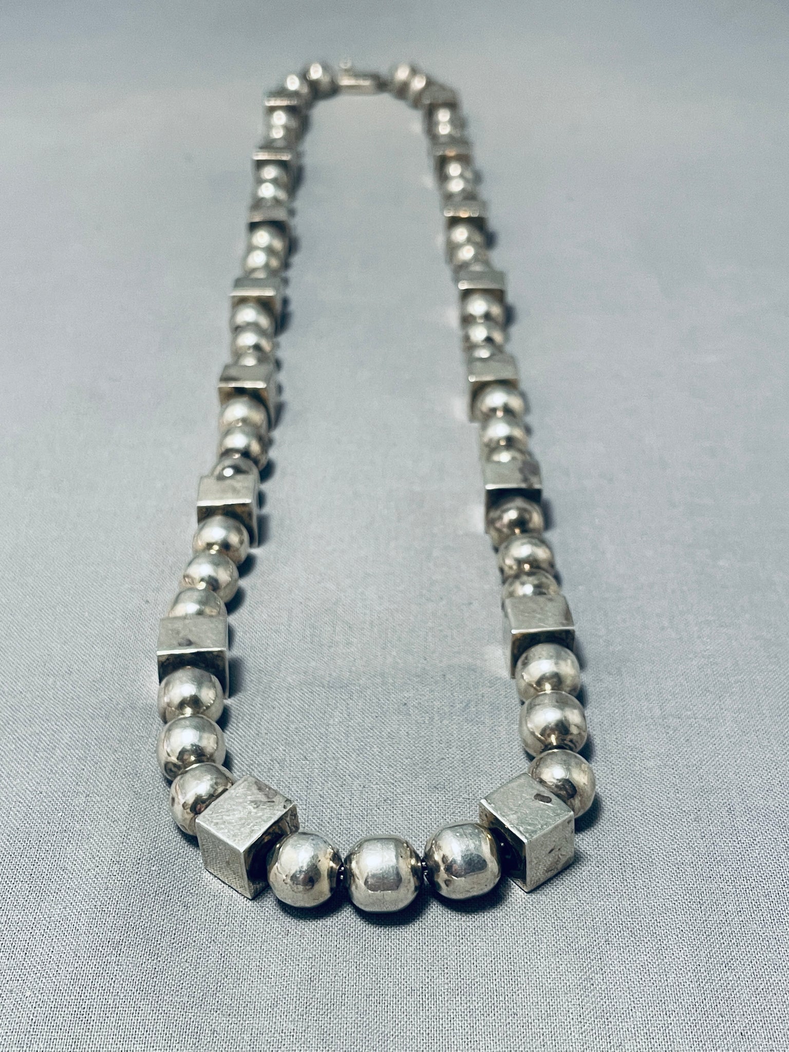 Drew note: So much work and time was involved for an artist to have to hand cut and solder all those sterling cube beads, exceptional. This is a marvelous all silver bead necklace. I absolutely love how the necklace consists of multiple handmade large round silver beads that each measure around 3/8" in diameter. Situated throughout the round silver beads are phenomenal square shaped 3D silver cubes that each measure around 3/8" X 3/8" X 3/8". The clasp on this necklace is beautiful. Taxco or Navajo. Sterling silver. Cir. 1970's+. The length of the necklace measures around 26". Sturdy 133 grams.