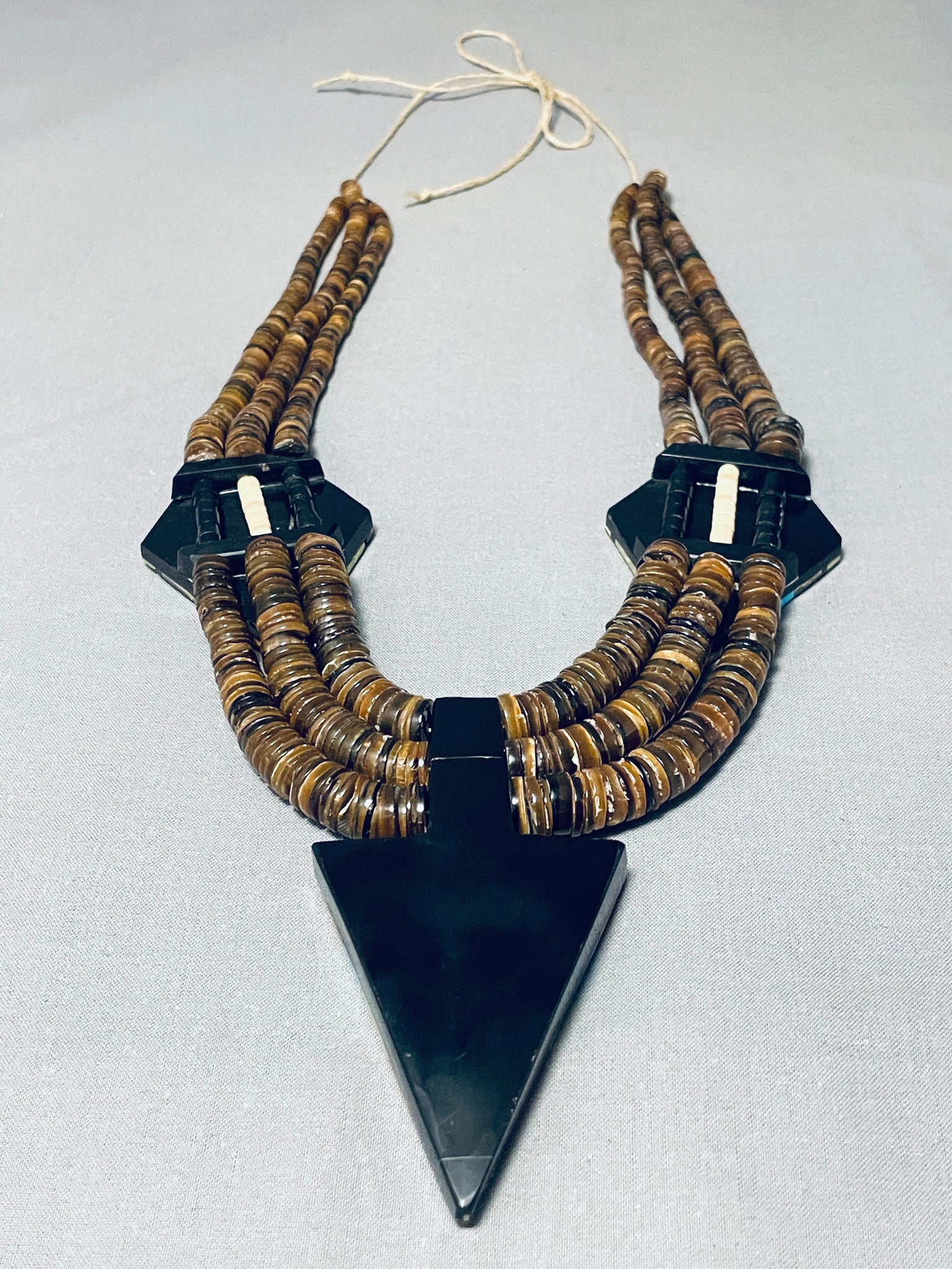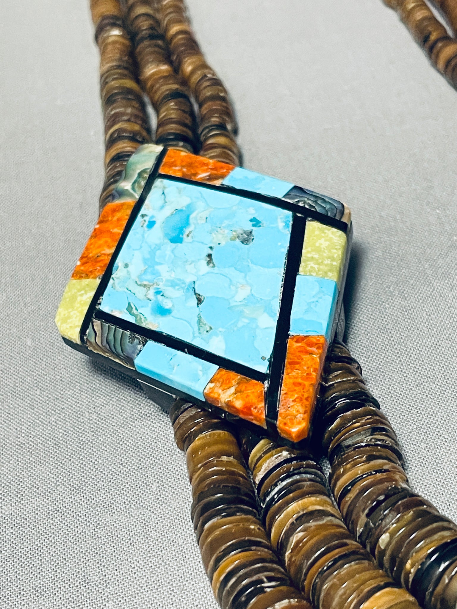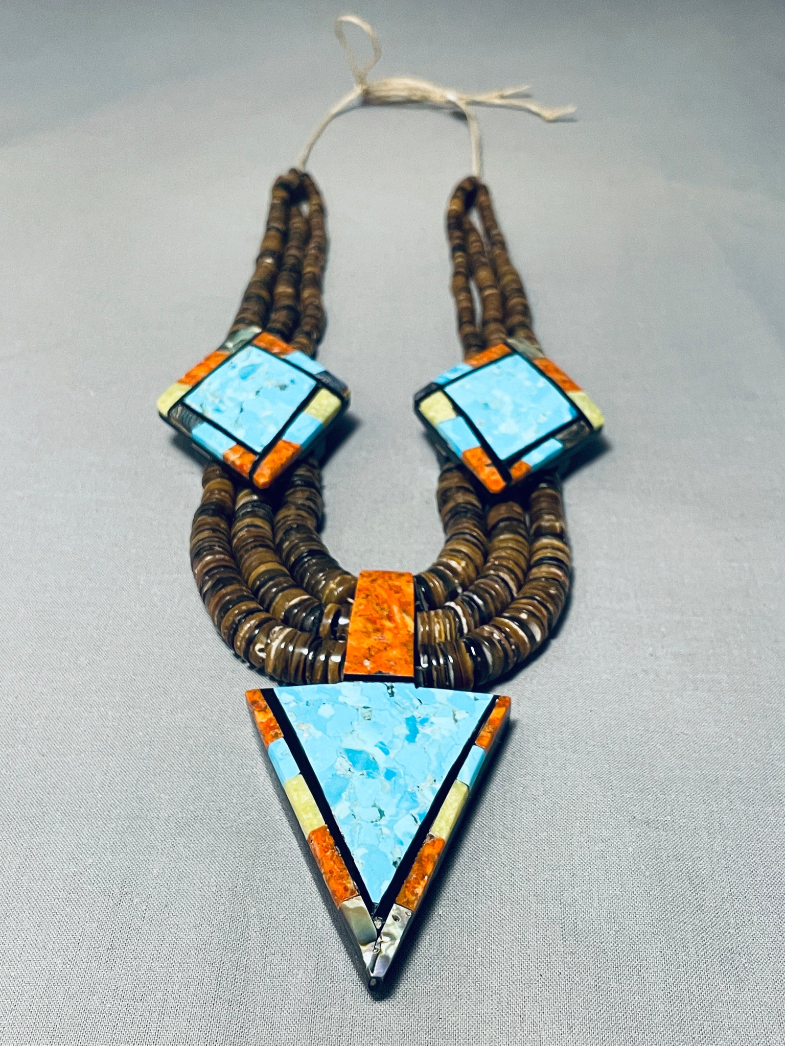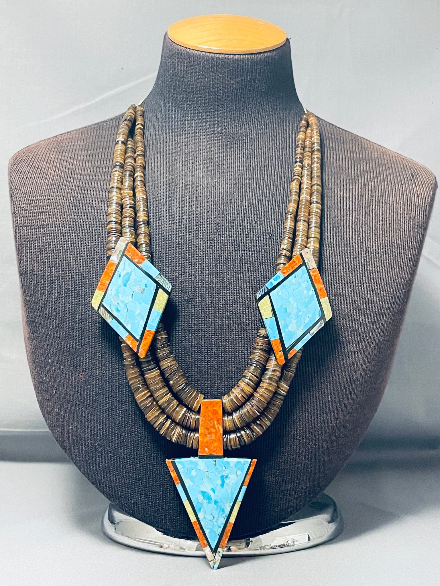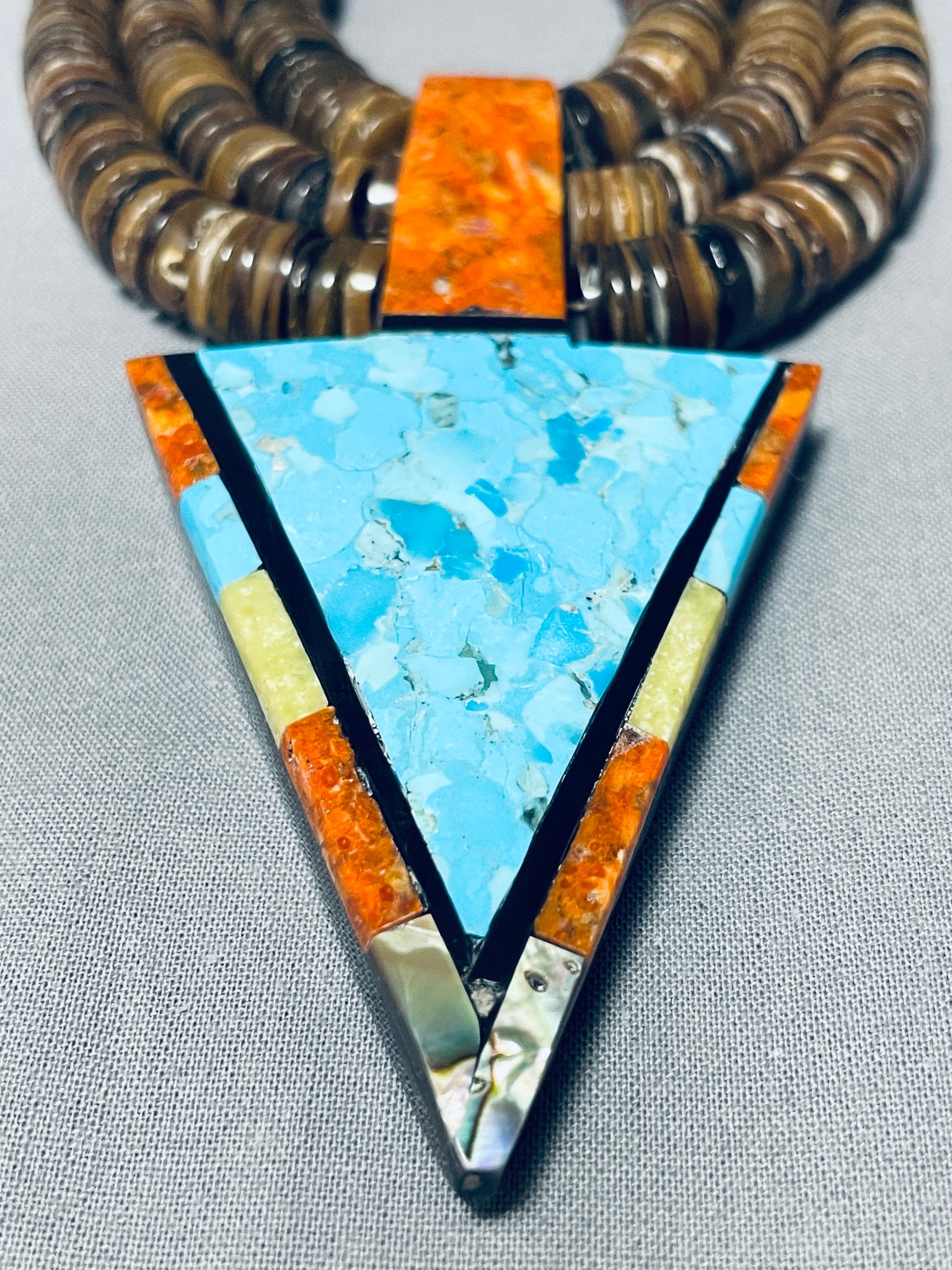 It is very rare to see this type of heishi with inlay, very rare opportunity! This is a fascinating vintage Santo Domingo inlaid very large necklace. This wonderful necklace contains three beautiful very large sections of amazing inlay workmanship. The inlay consists of Sleeping Beauty turquoise, gaspeite, spiny oyster, abalone, opal and jet stones. The bottom arrowhead shaped inlaid pendant measures a whopping 3-3/4" X 2". Situated throughout the necklace are three strands of amazing hand cut brown shell heishi. We have a beautiful pair of matching earrings to this necklace, be sure to check out our store. Cir. 1970's+. Santo Domingo artist, Torey Crespin. The length of the necklace measures around 31". Sturdy 197 grams.