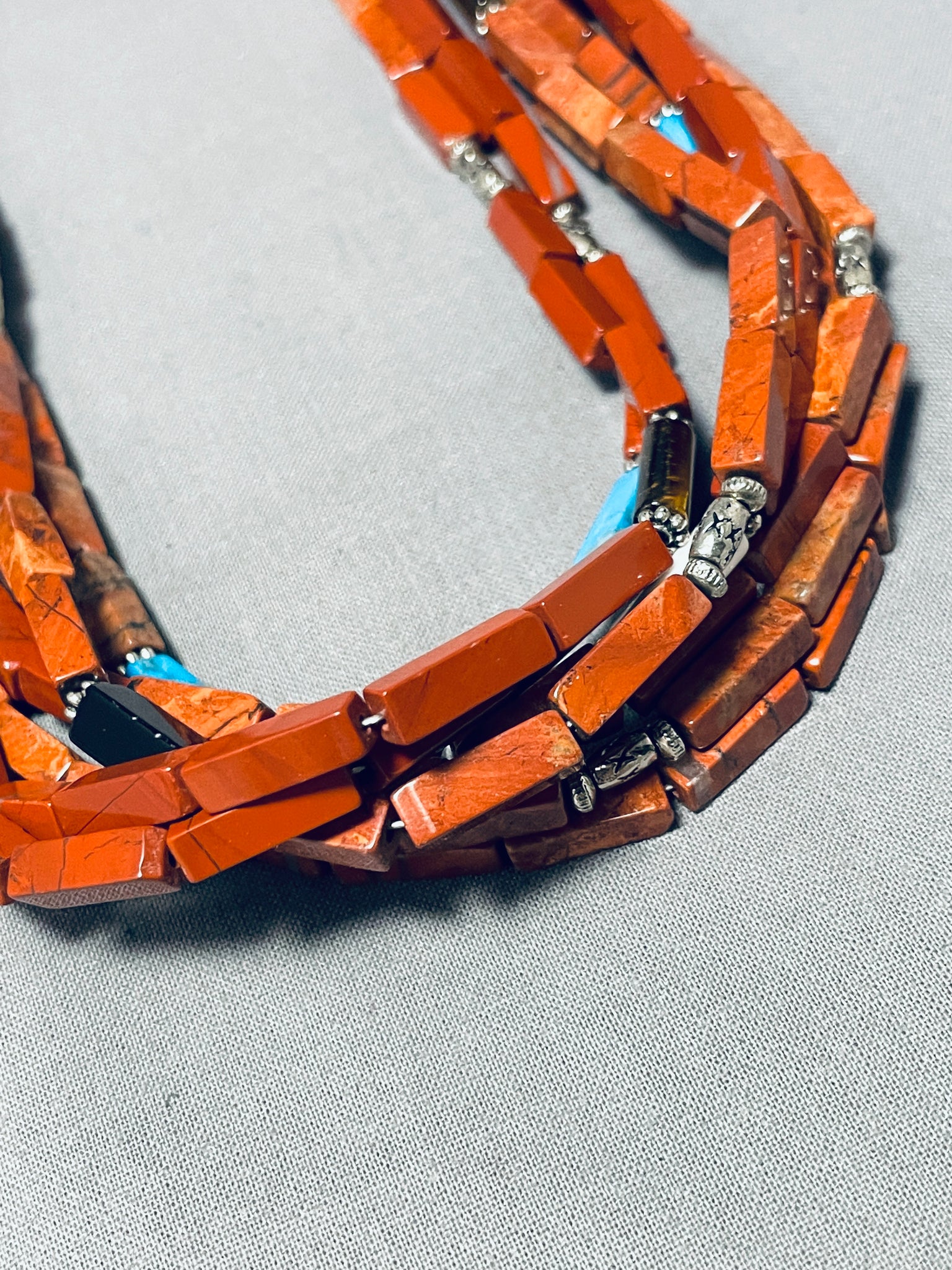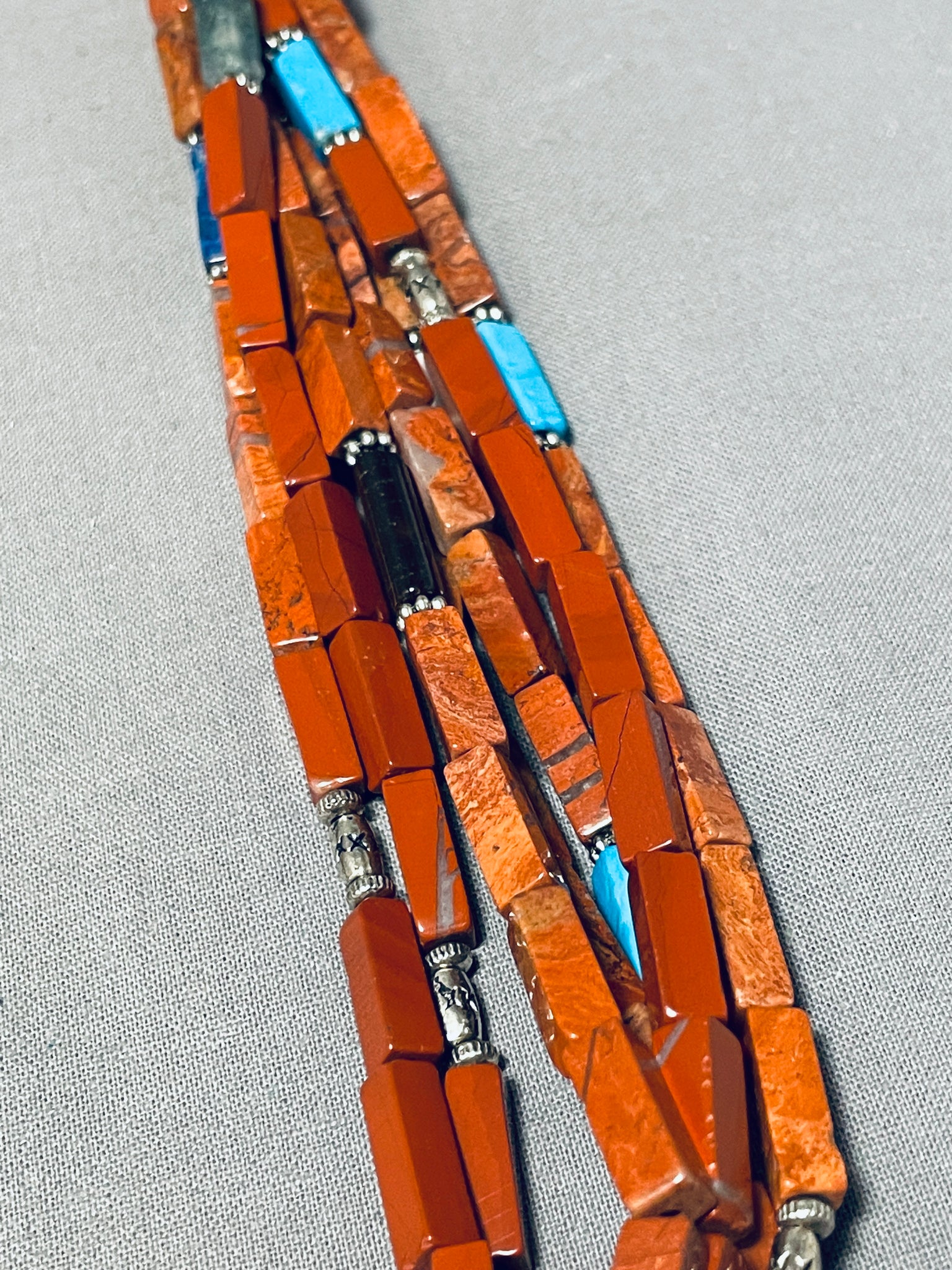 This is a magnificent vintage Navajo beautiful unique multiple colored stone and shell necklace handmade by the very famous artist, Thomas Singer. This necklace contains a wonderful silver tag that is signed with T. Singer. This necklace contains a single strand that runs down into 7 strands. Sperating the single strand from the seven strands are impeccable large handmade silver drum beads that consist of line segments and pueblo patterns. Each silver bead measures around 1" X 5/8". The seven strands consist of beautiful hand cut agate stones with accenting lapis, white stones, tigers eye and turquoise stones. Also situated throughout the stones are marvelous silver beads. The single strand on the necklace consists of wonderful rounded onyx stones, disc shaped lapis stones, turquoise stones, agate and white stones. Situated at the ends of the necklace are silver cones with a traditional silver clasp. Sterling silver. Cir. 1970's+. Signed by Navajo artist, Thomas Singer. The length of the necklace measures around 29". Sturdy 192 grams.