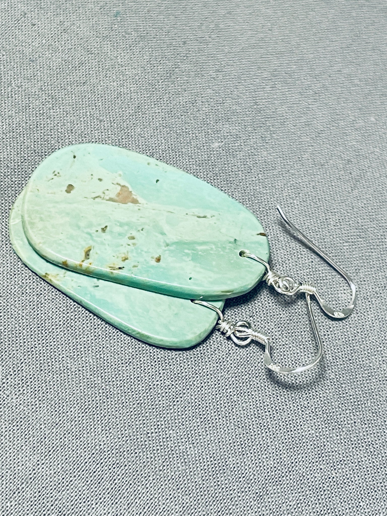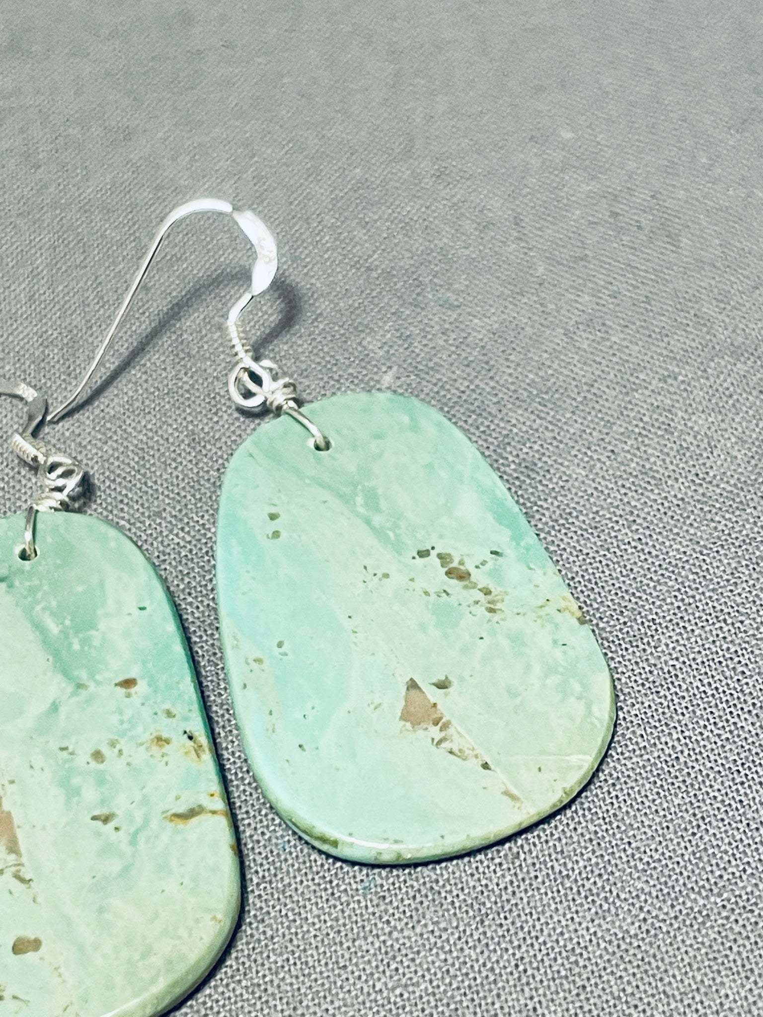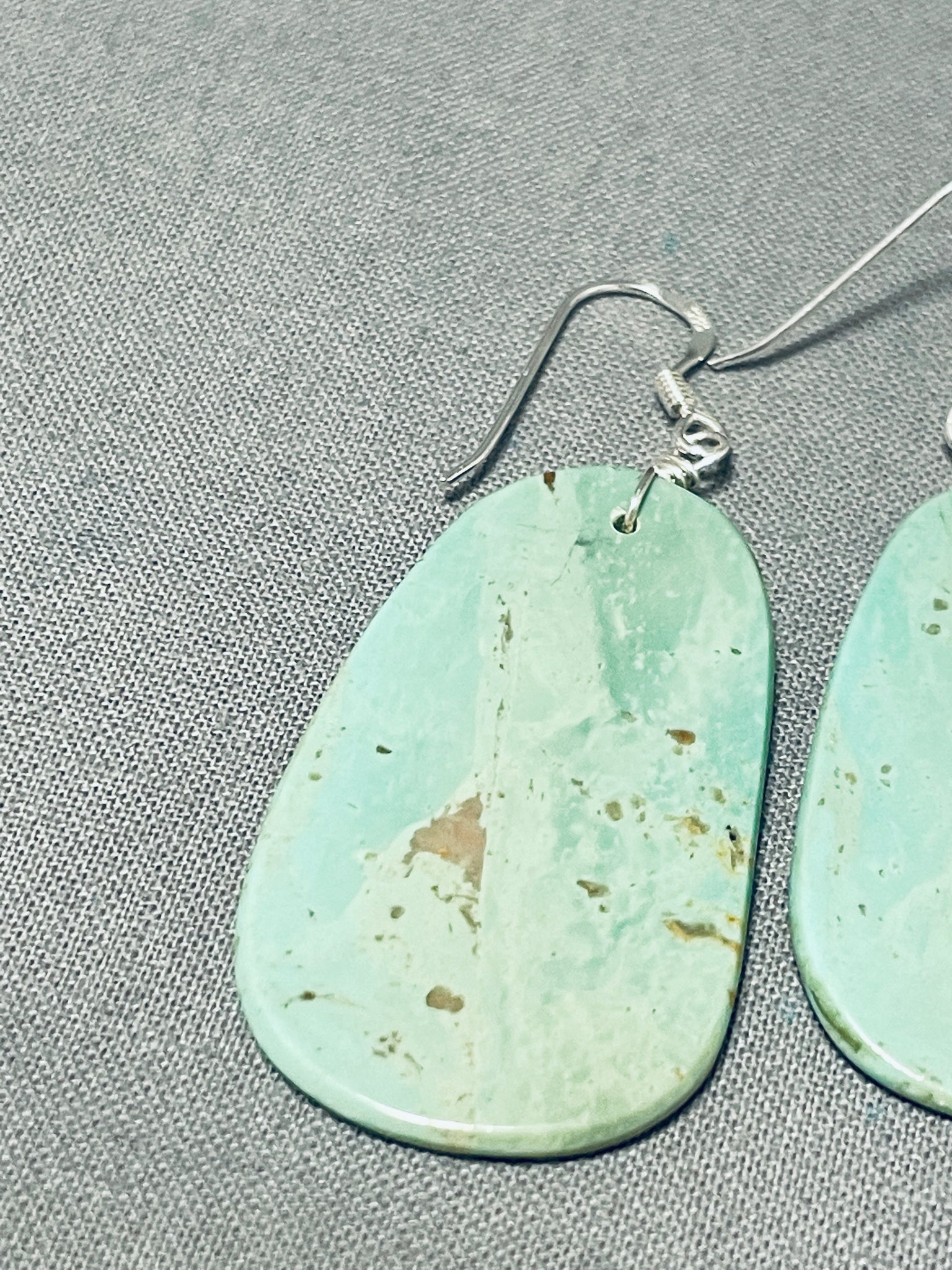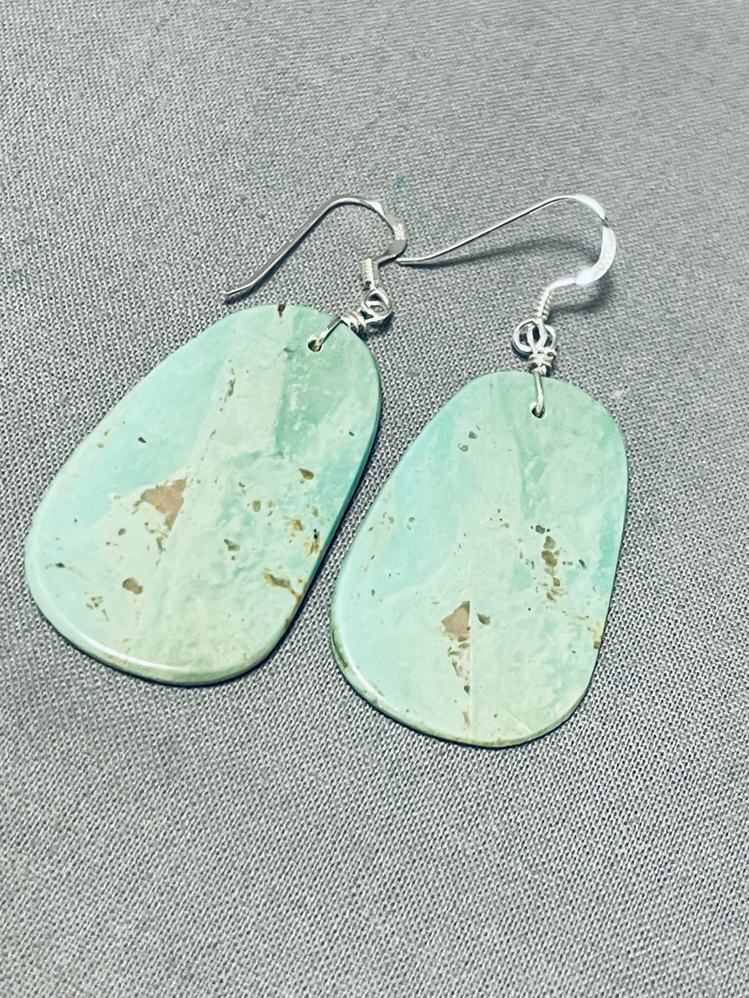 Up for sale is this superlative Santo Domingo pair of earrings. Pure and simple - these pierced wire dangle earrings each boast the most marvelous slab of impressive Royston turquoise! Sterling silver. Each earring measures 2-1/8" long and 7/8" wide. The earrings weigh around 6 grams.