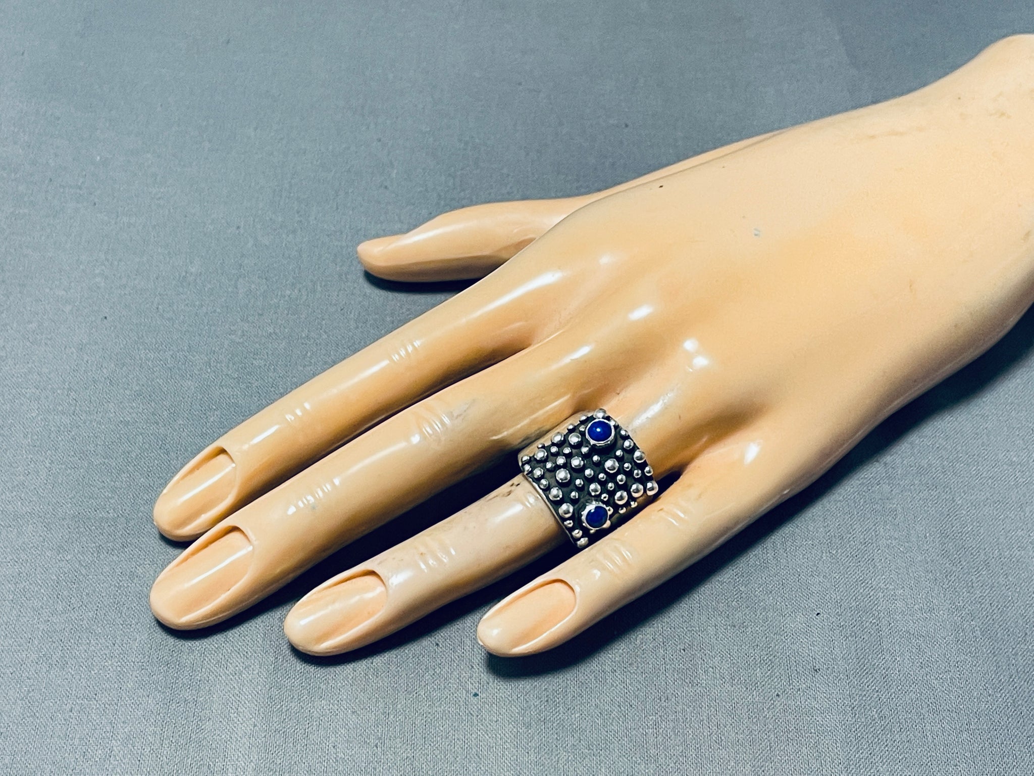 Up for sale is this superior vintage Santo Domingo silver ring. The two 1/8" round lapis stones float peacefully among the silver bubbles of the square face of this incredible ring! The ring face measures around 3/4" x 3/4". Signed by Navajo artist, Raymond Coriz. The ring size is around 9. Sterling silver, marked. Sturdy 10 grams.