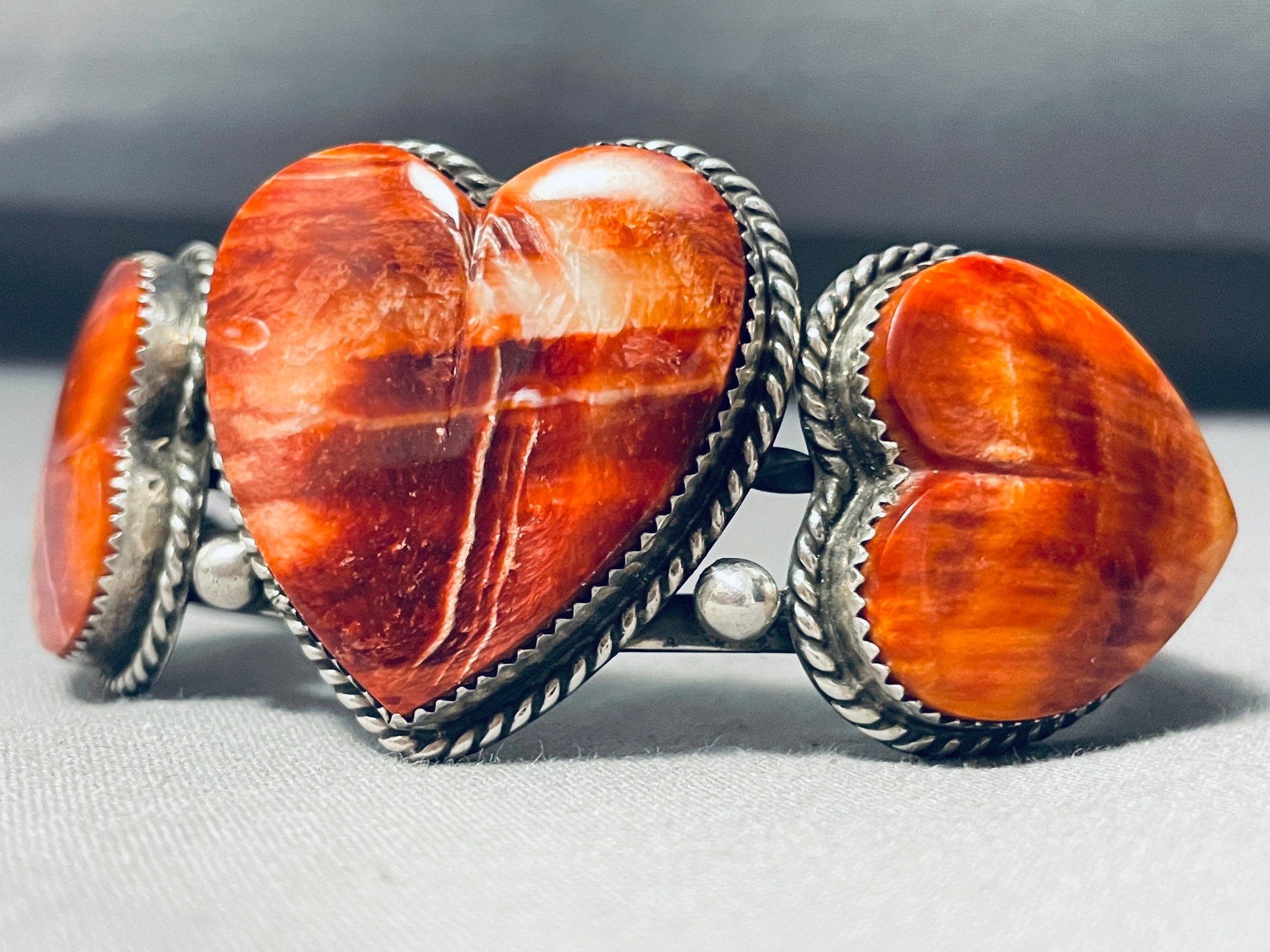 This is a breathtaking Native American large heart carved shell silver bracelet. This phenomenal bracelet contains three outstanding large hand carved heart shaped red spiny oyster shells. Each shell consists of a marvelous silver rope. Situated at both sides of the thick and sturdy triple silver shank cuff are amazing silver raindrops. The center shank is a wonderful thick silver rope. The height at the center of the bracelet measures around 1-1/2" while the width at the center of the triple silver shank cuff measures around 7/8". The center stone measures around 1-1/4" x 1-1/4". Signed by artist, Buffalo Dancer. Sterling silver, marked. The inside end to end measures around 5-1/2" with an additional 1-1/4" gap. Sturdy 65 grams.