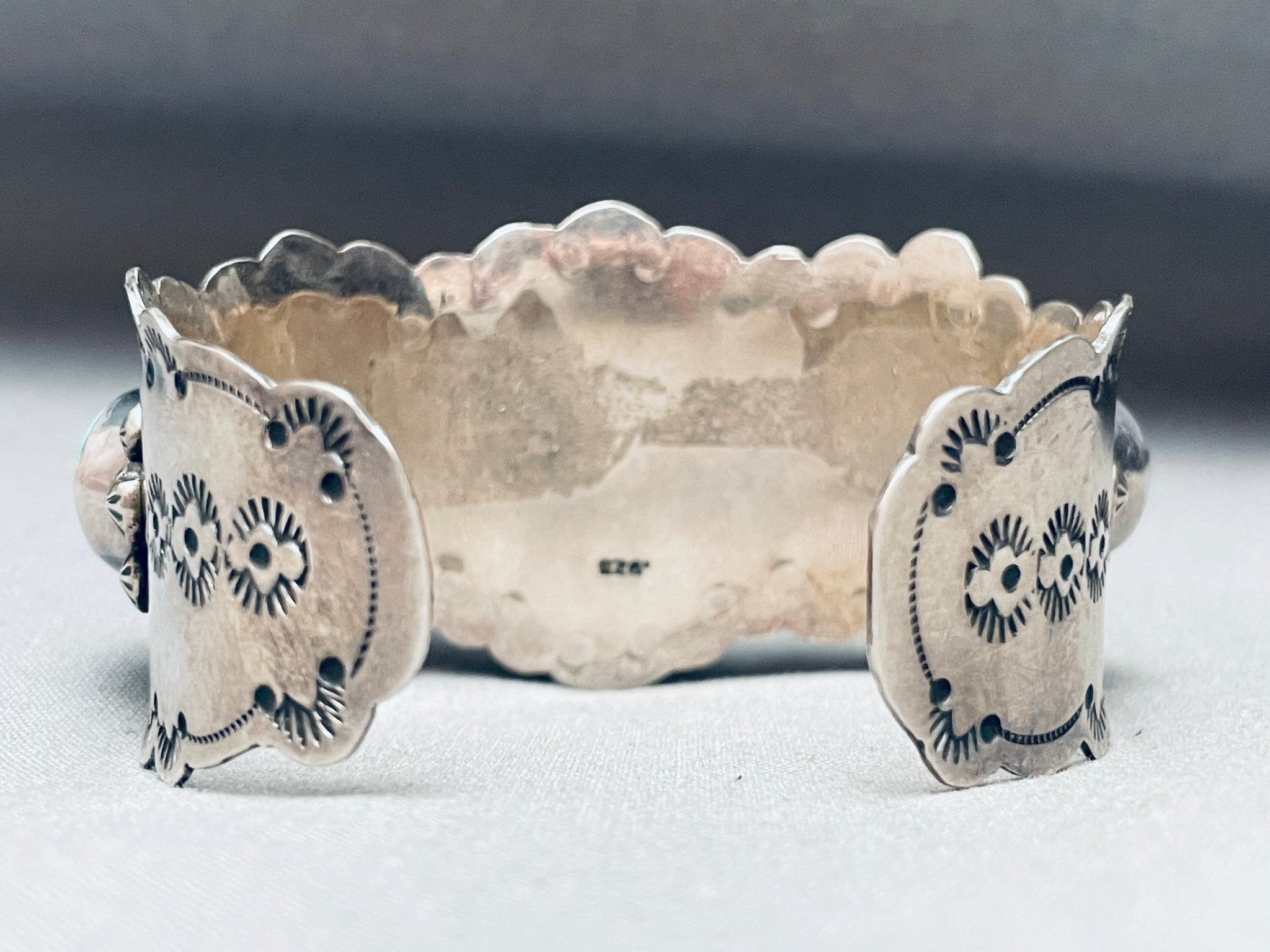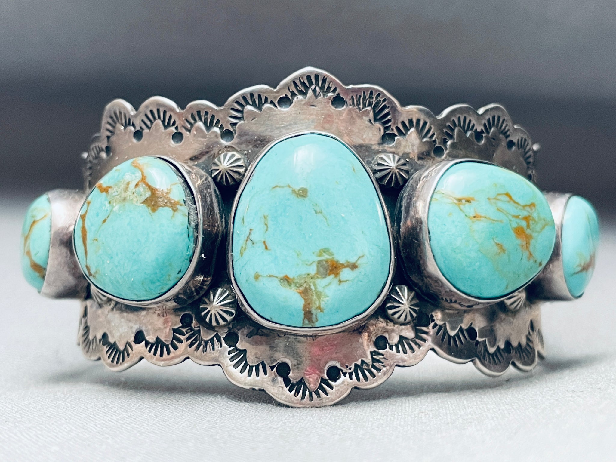 Native American Row Of Chunky Turquoise Vintage Navajo Sterling Silver Stamped Bracelet