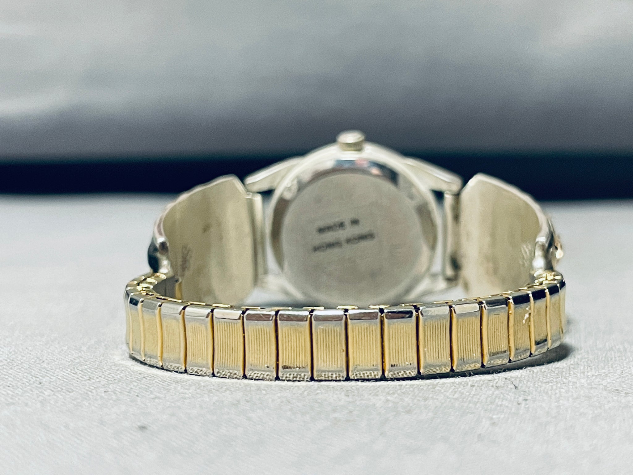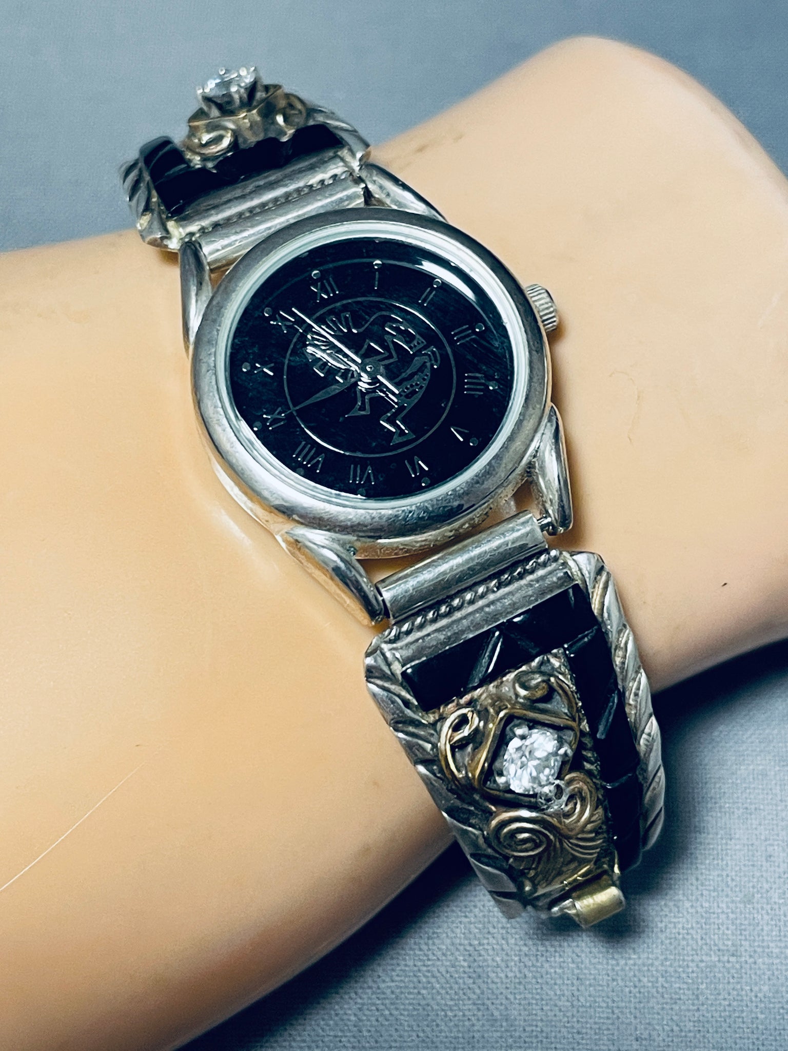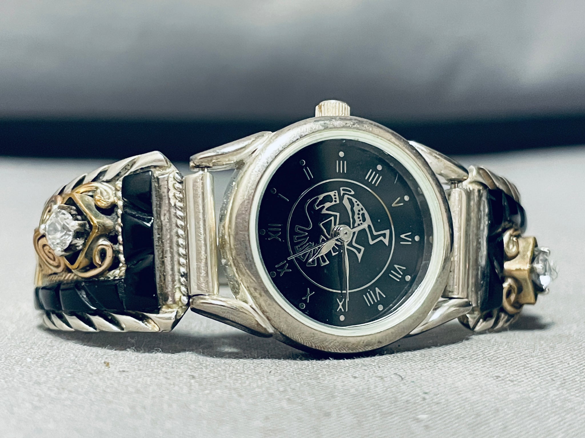 Native American Shay Signed Vintage Navajo Gold Sterling Silver Onyx Watch Bracelet