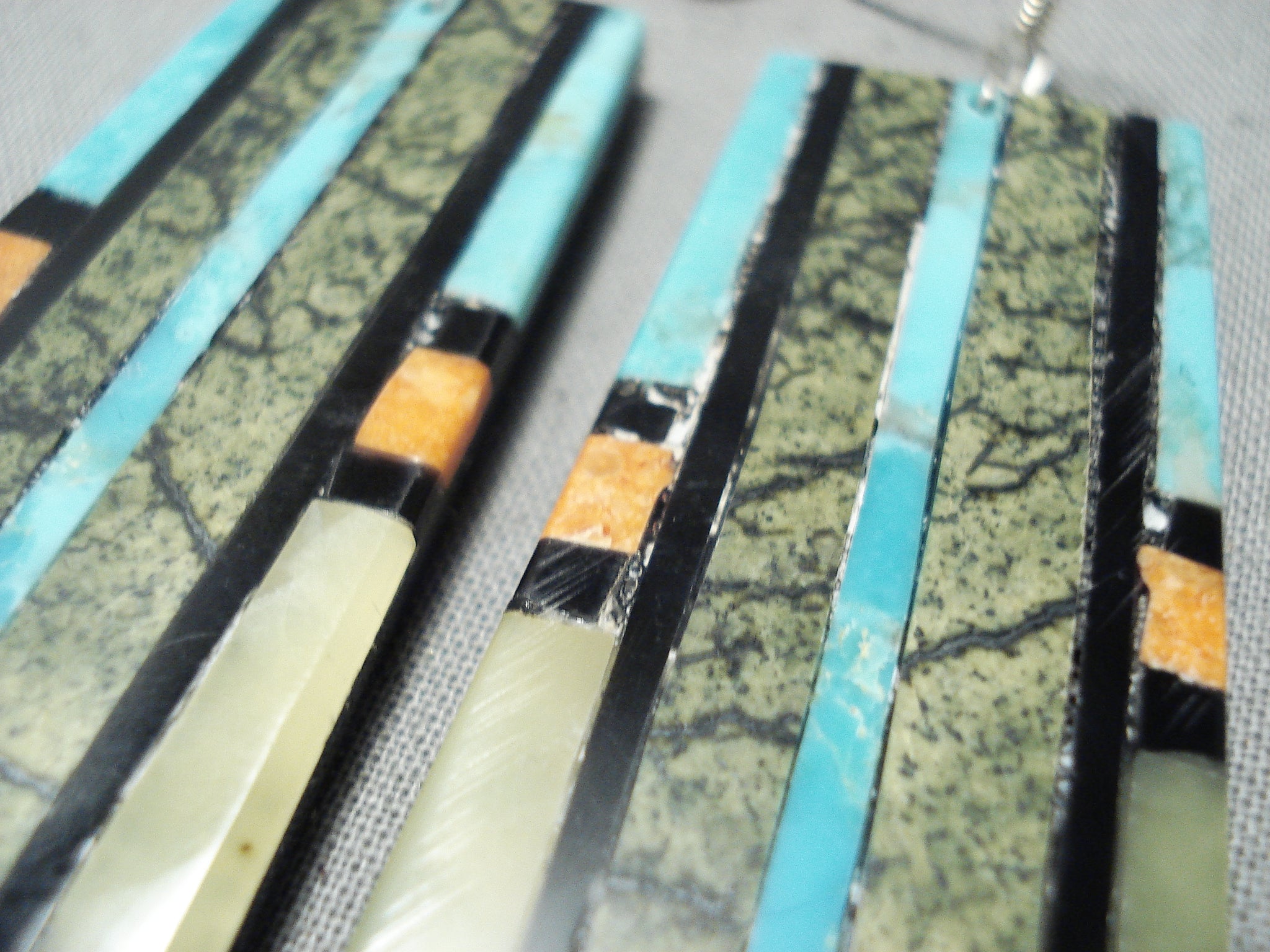 This is a marvelous Santo Domingo pair of earrings. These amazing earrings are large and consist of beautiful inlay. The inlay contains green turquoise, blue turquoise, spiny oyster and green stones. The earrings each measure around 2" X 1" not including the hooks. The earrings weigh around 14 grams.