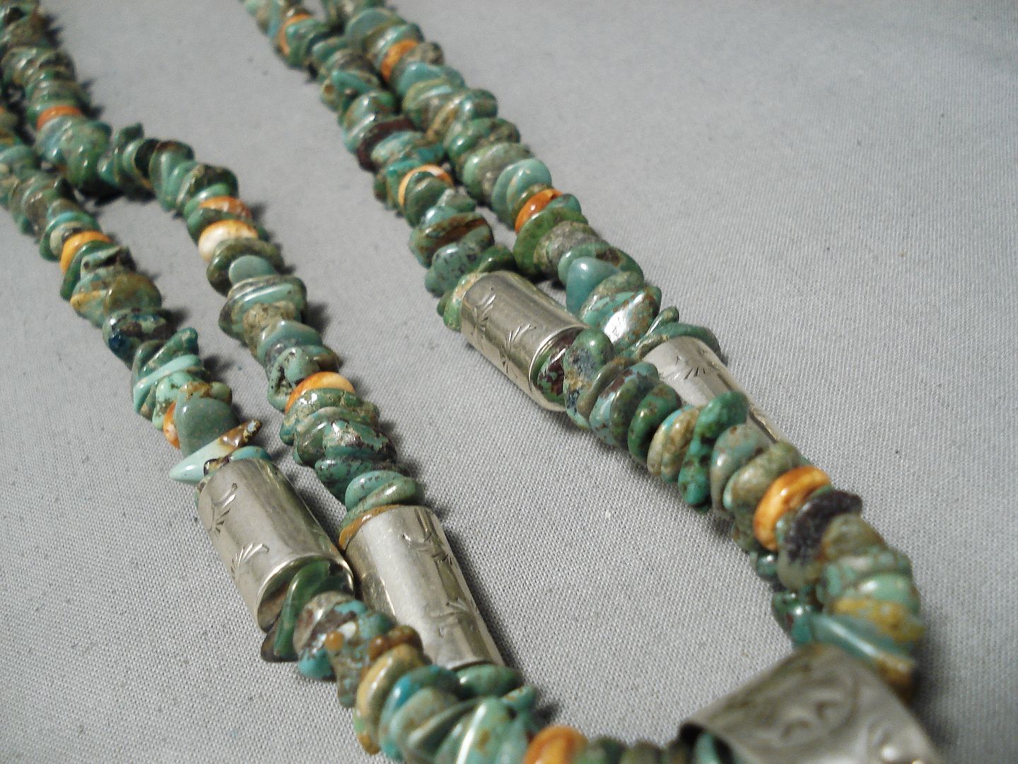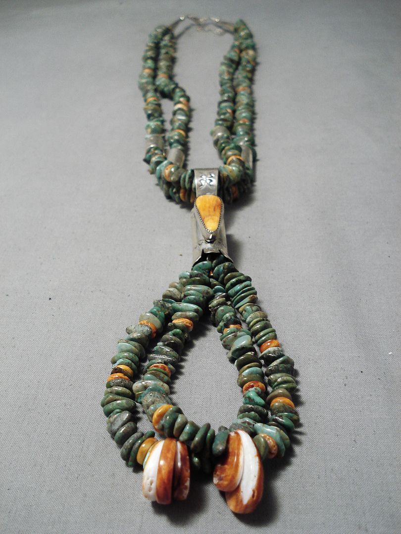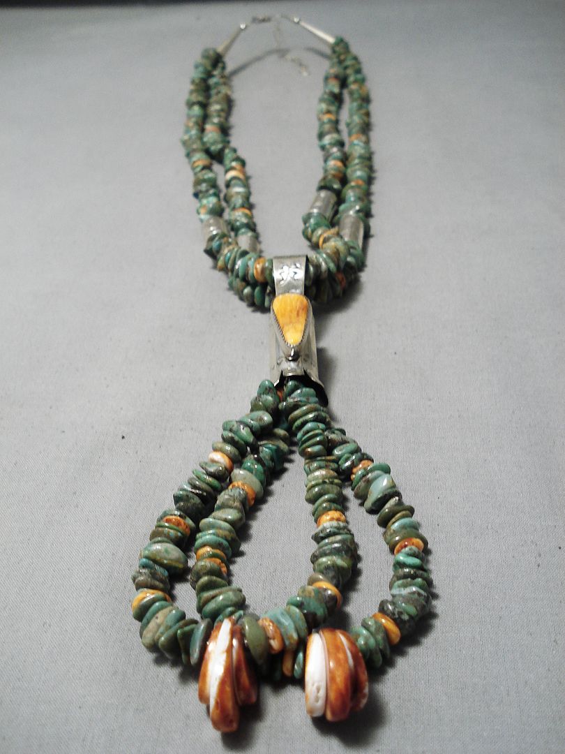 A remarkable vintage Santo Domingo silver necklace. This is a dramatic, lengthy two-strand necklace of mega amounts of Royston turquoise stones – strung side by side, with the occasional bright contrasting orange spiny oyster stone and handstamped silver canister bead. And then taking the necklace to the next level of magnificent is the double strand “jacla” of additional matching stones, attached with the super impressive handstamped bail and blossom that has the large 1” x 3/8” orange spiny oyster stone set front and center! Sterling silver, marked. Santo Domingo artist David Coriz. The length of the necklace measures around 39". Sturdy 200 grams.