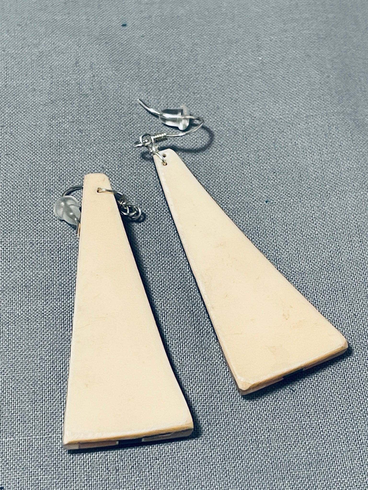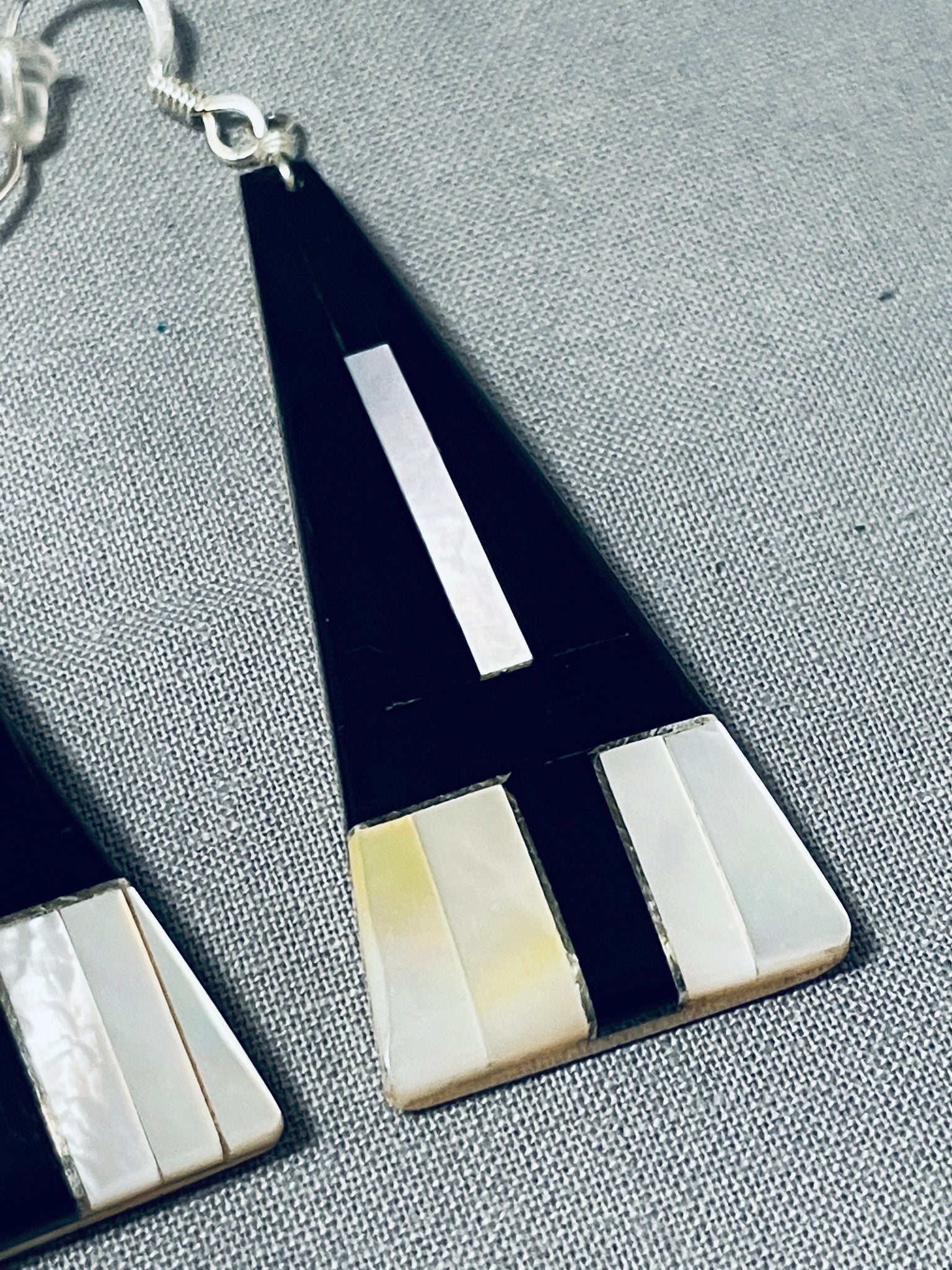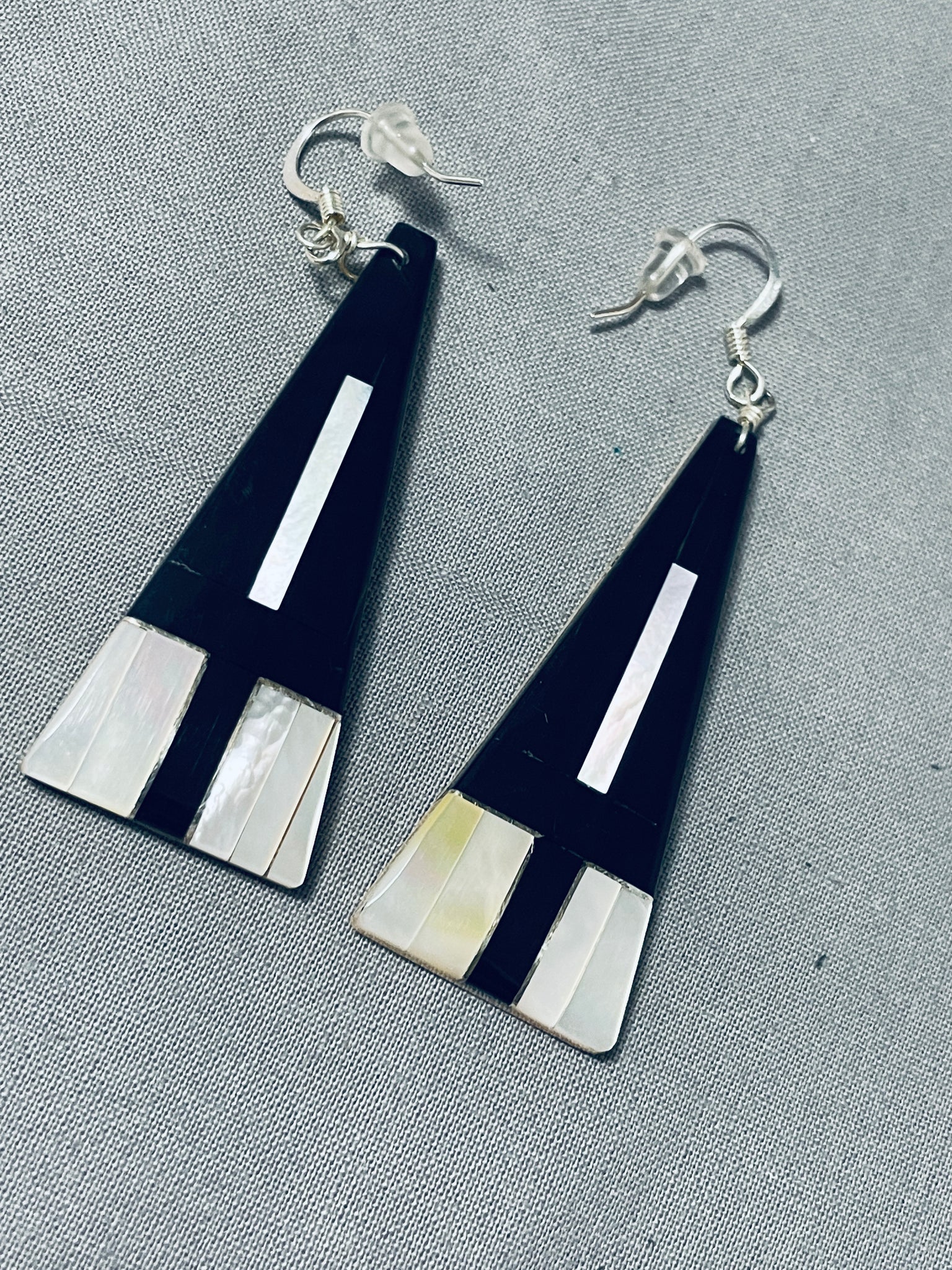 This is an amazing pair of Santo Domingo earrings having large inlay jet and mother of pearl triangles, solid shell on the back and handmade silver hooks for pierced ears! Absolutely Spectacular! Earrings measure about 2-5/8" top to bottom. Sterling silver. The earrings weigh around 13 grams.