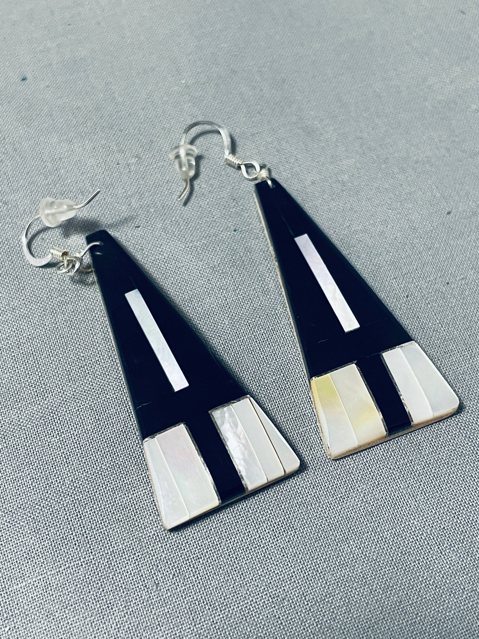 Native American Stunning Vintage Santo Domingo Inlay Jet Mother Of Pearl Large Earrings