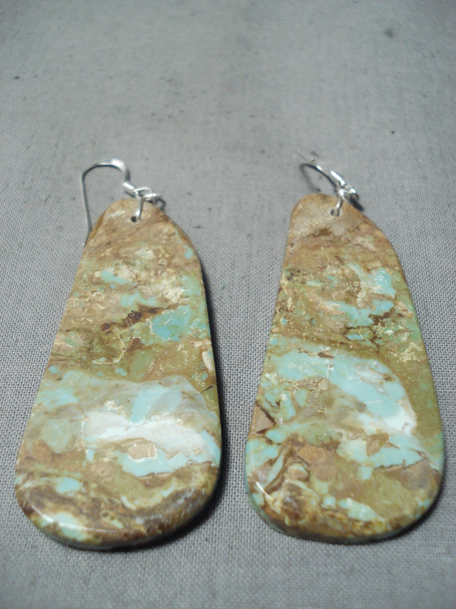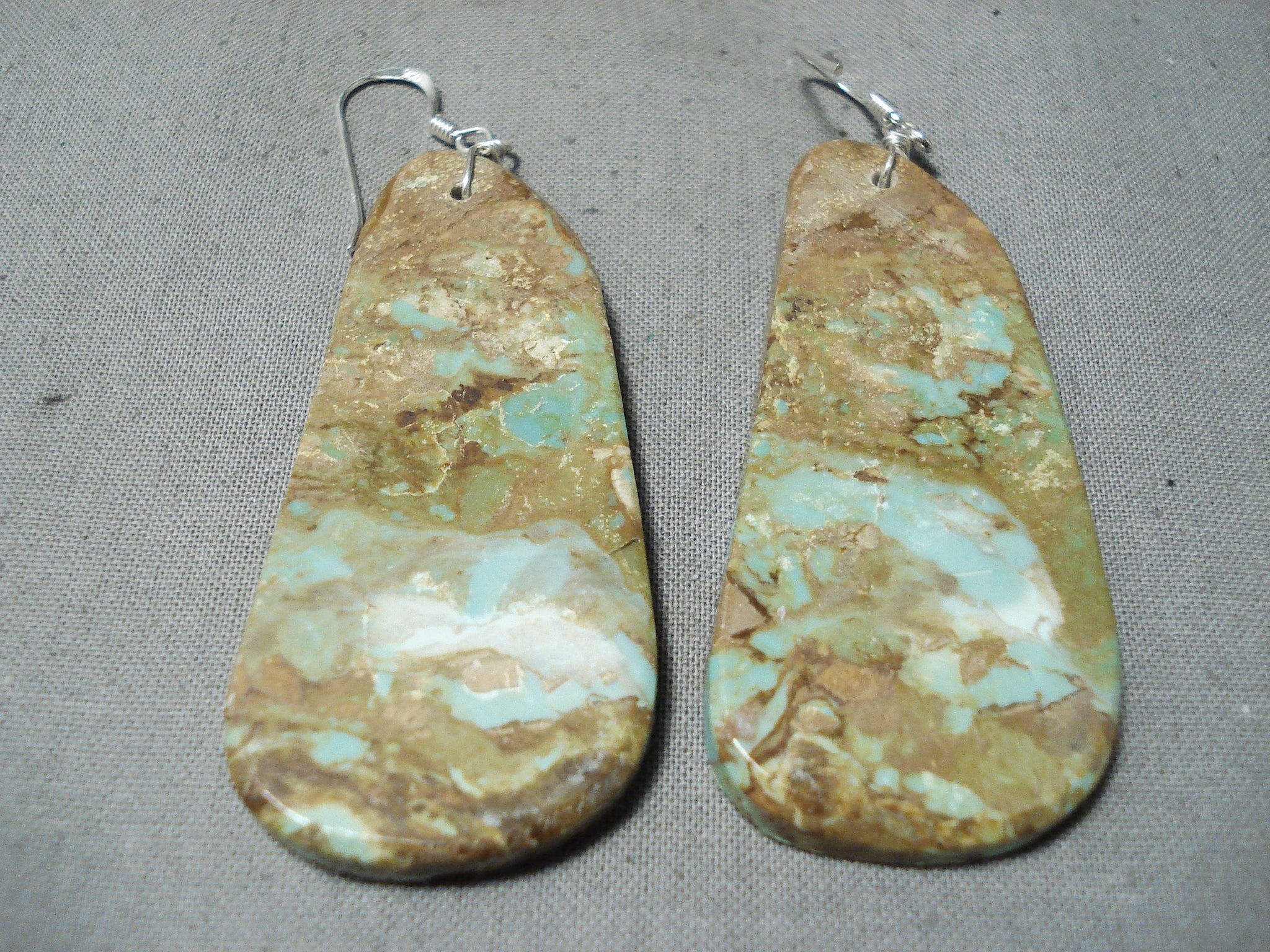 This is an amazing Santo Domingo silver pair of earrings. Each of these astonishing pierced wire dangle earrings is a magnificent thick Royston turquoise slab! They’re over 1/8” thick! An unbelievable pair of earrings! Sterling silver. Each earring measures 2-3/4" long and 1" wide. Cir. 20. The earrings weigh around 20 grams.
