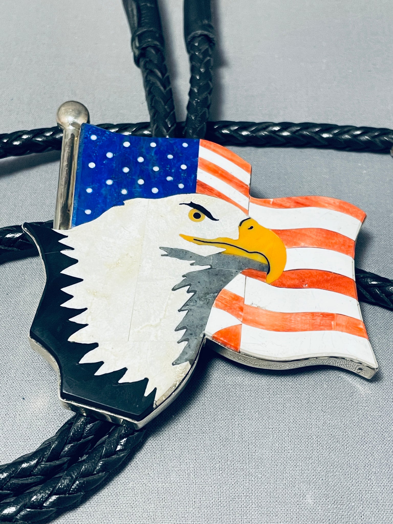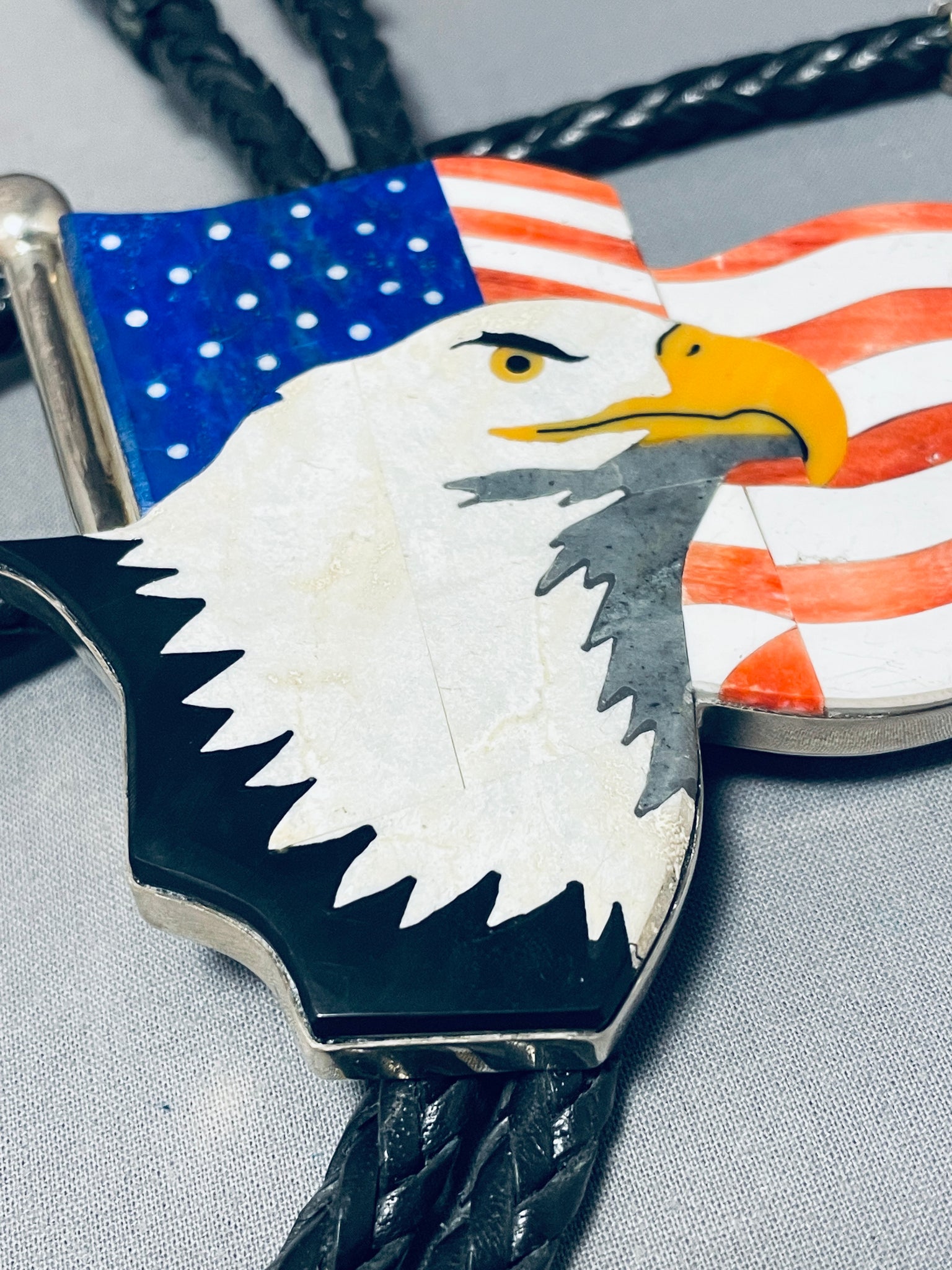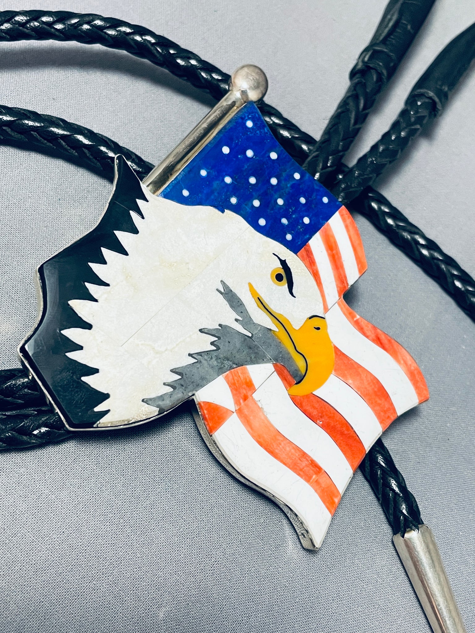 This is the most clear handmade inlay bolo we have collected in terms of how perfect the artist hand cut the stones to make the picture of the eagle.This is a tremendous Native American magnificent inlaid silver bolo tie. This impeccable bolo consists of a mind blowing inlaid American flag with a stunning eagle in front. The inlay is astonishing and so very detailed consisting of spiny oyster, white shell, lapis, mother of pearl, onyx and yellow shell. The detailing of the inlay workmanship is absolutely remarkable. The bolo measures a whopping 3-1/2" X 3-1/4". Resting at the ends of the very thick and sturdy 49" black leather tie are long silver cones with accenting cone arrows at the ends. This bolo tie is absolutely remarkable. Signed by artist, Cal Desson. Sterling silver, marked. Sturdy 142 grams.