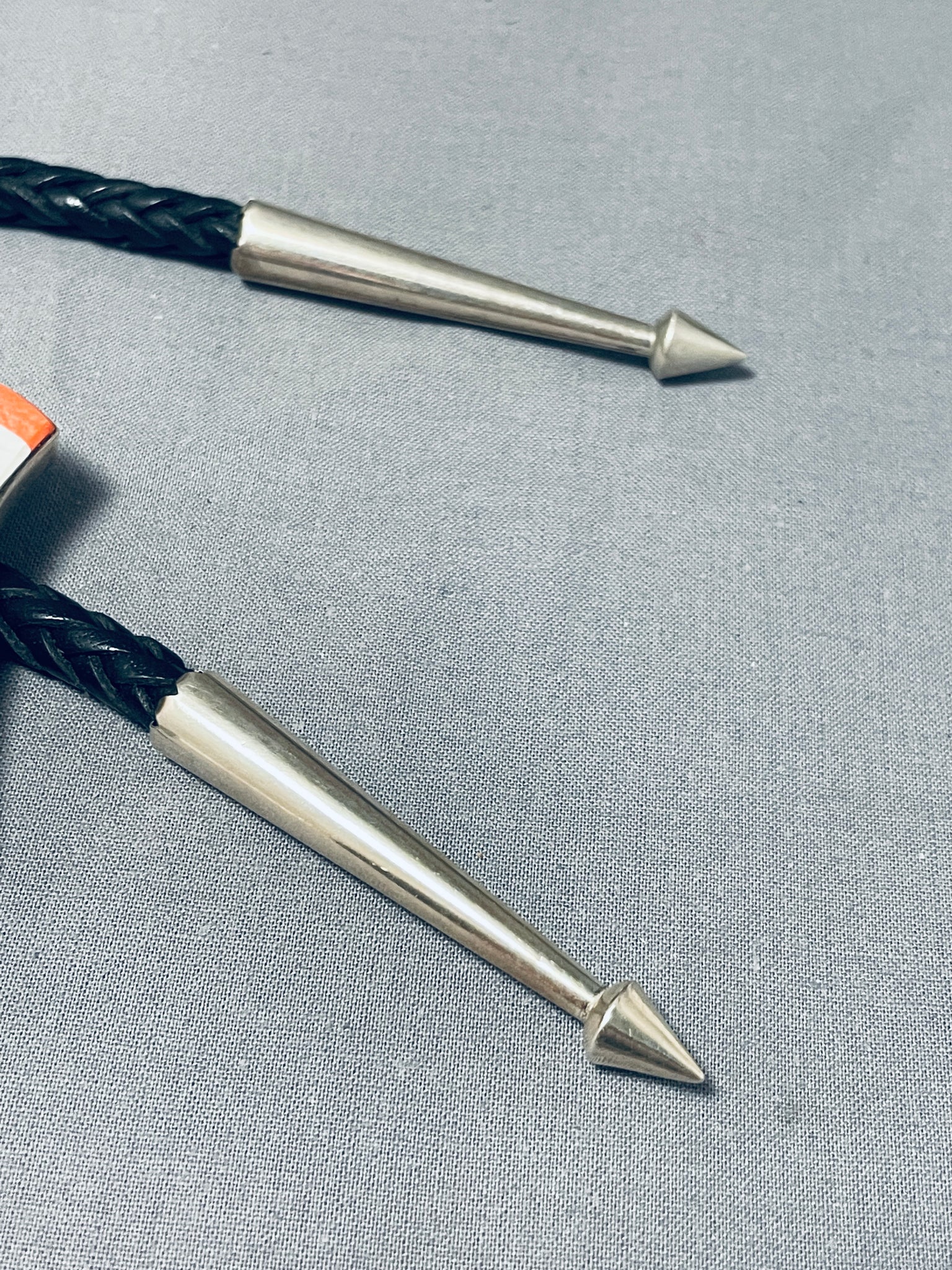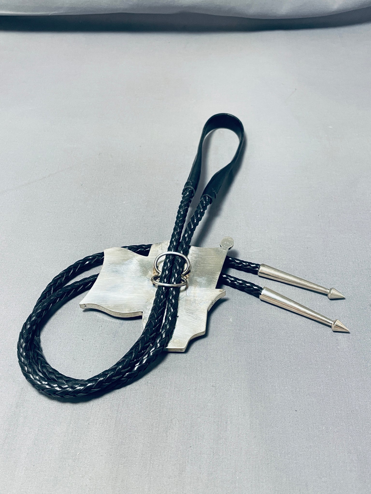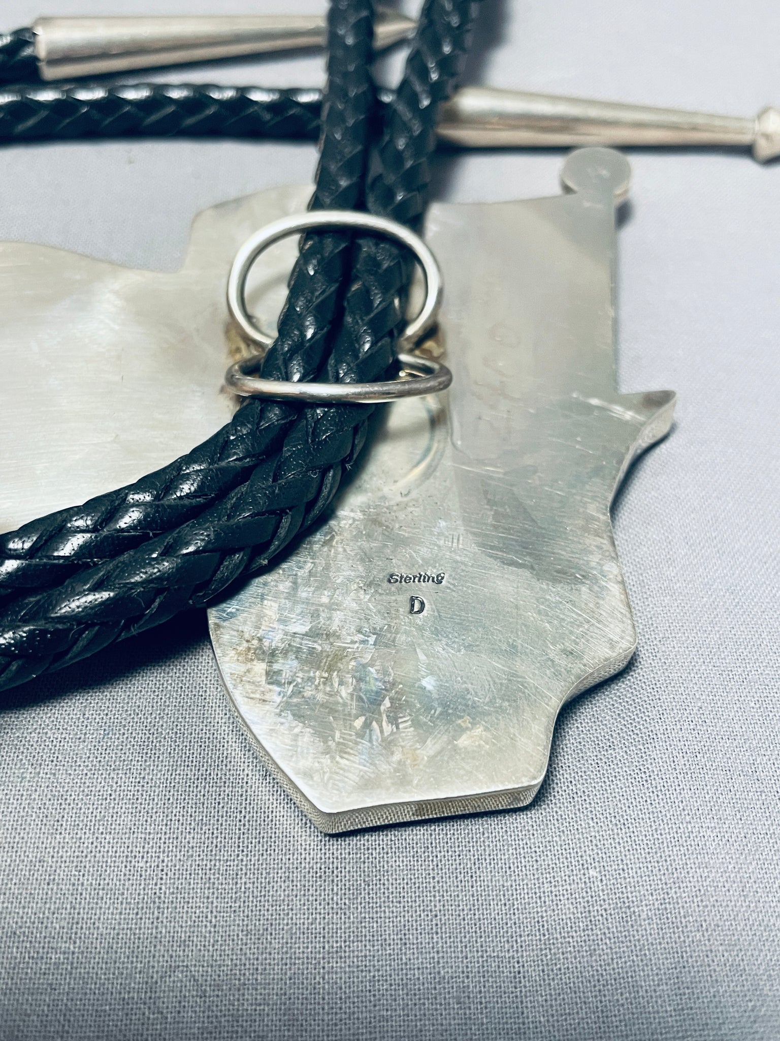 This is the most clear handmade inlay bolo we have collected in terms of how perfect the artist hand cut the stones to make the picture of the eagle.This is a tremendous Native American magnificent inlaid silver bolo tie. This impeccable bolo consists of a mind blowing inlaid American flag with a stunning eagle in front. The inlay is astonishing and so very detailed consisting of spiny oyster, white shell, lapis, mother of pearl, onyx and yellow shell. The detailing of the inlay workmanship is absolutely remarkable. The bolo measures a whopping 3-1/2" X 3-1/4". Resting at the ends of the very thick and sturdy 49" black leather tie are long silver cones with accenting cone arrows at the ends. This bolo tie is absolutely remarkable. Signed by artist, Cal Desson. Sterling silver, marked. Sturdy 142 grams.