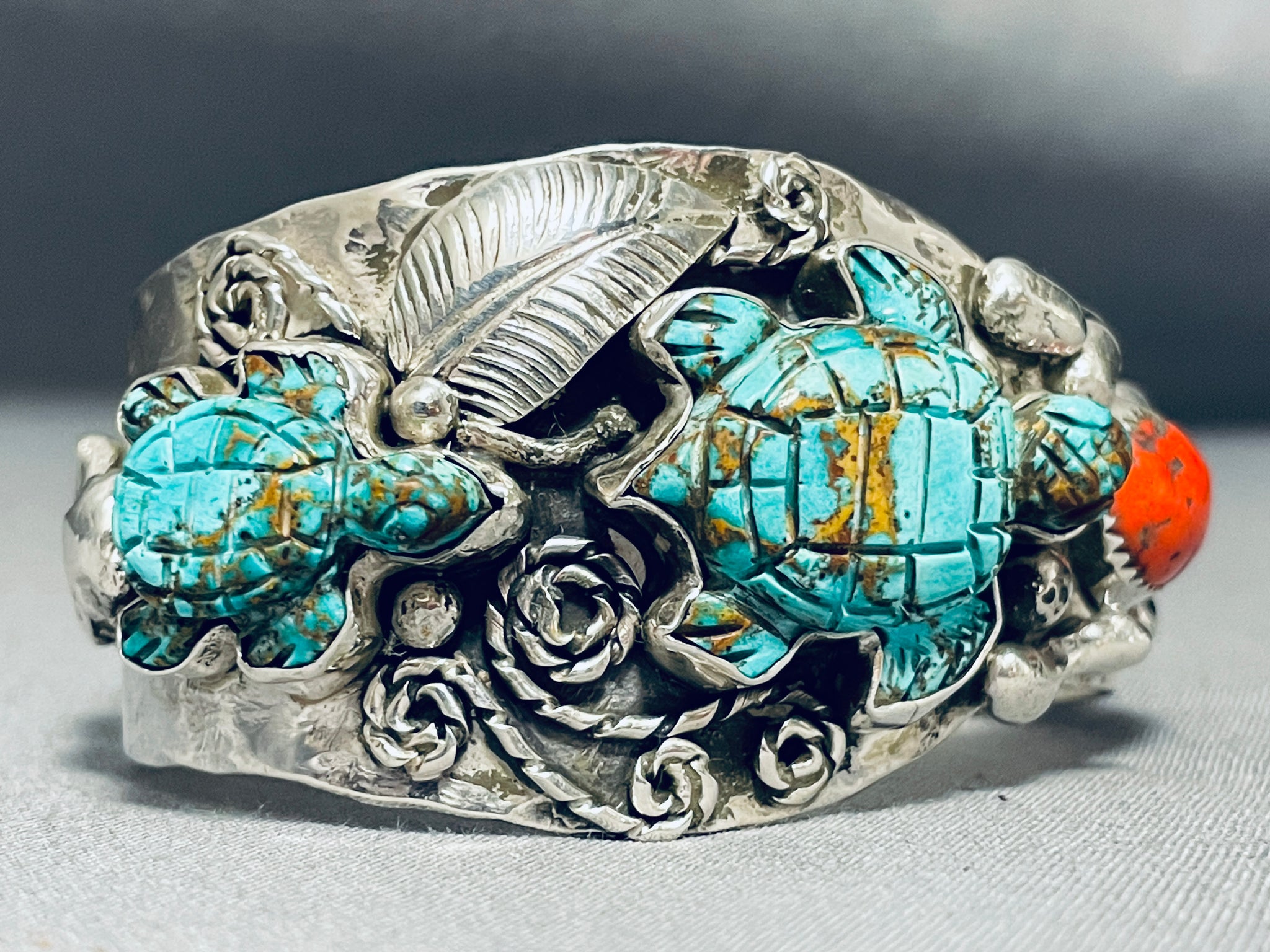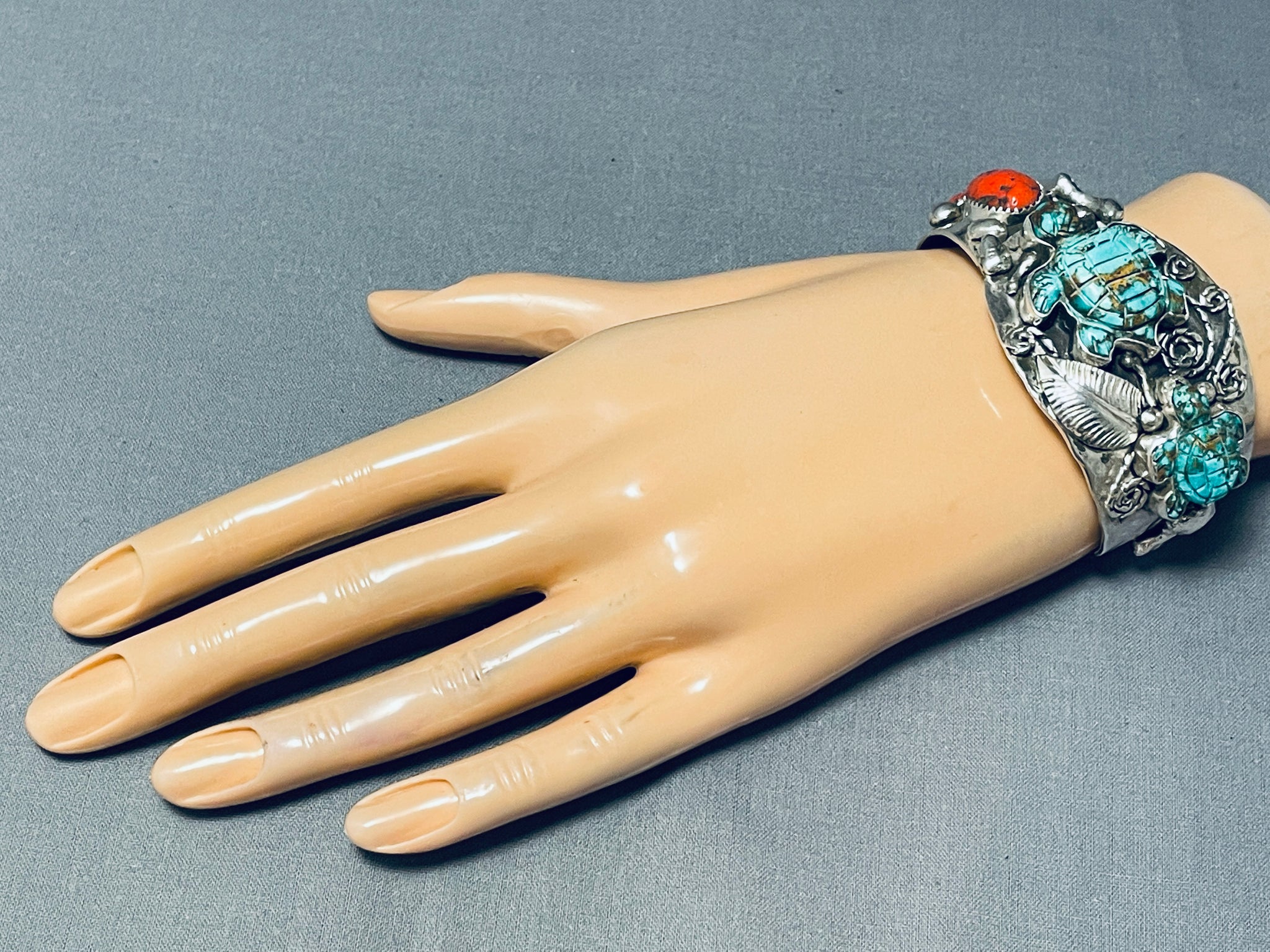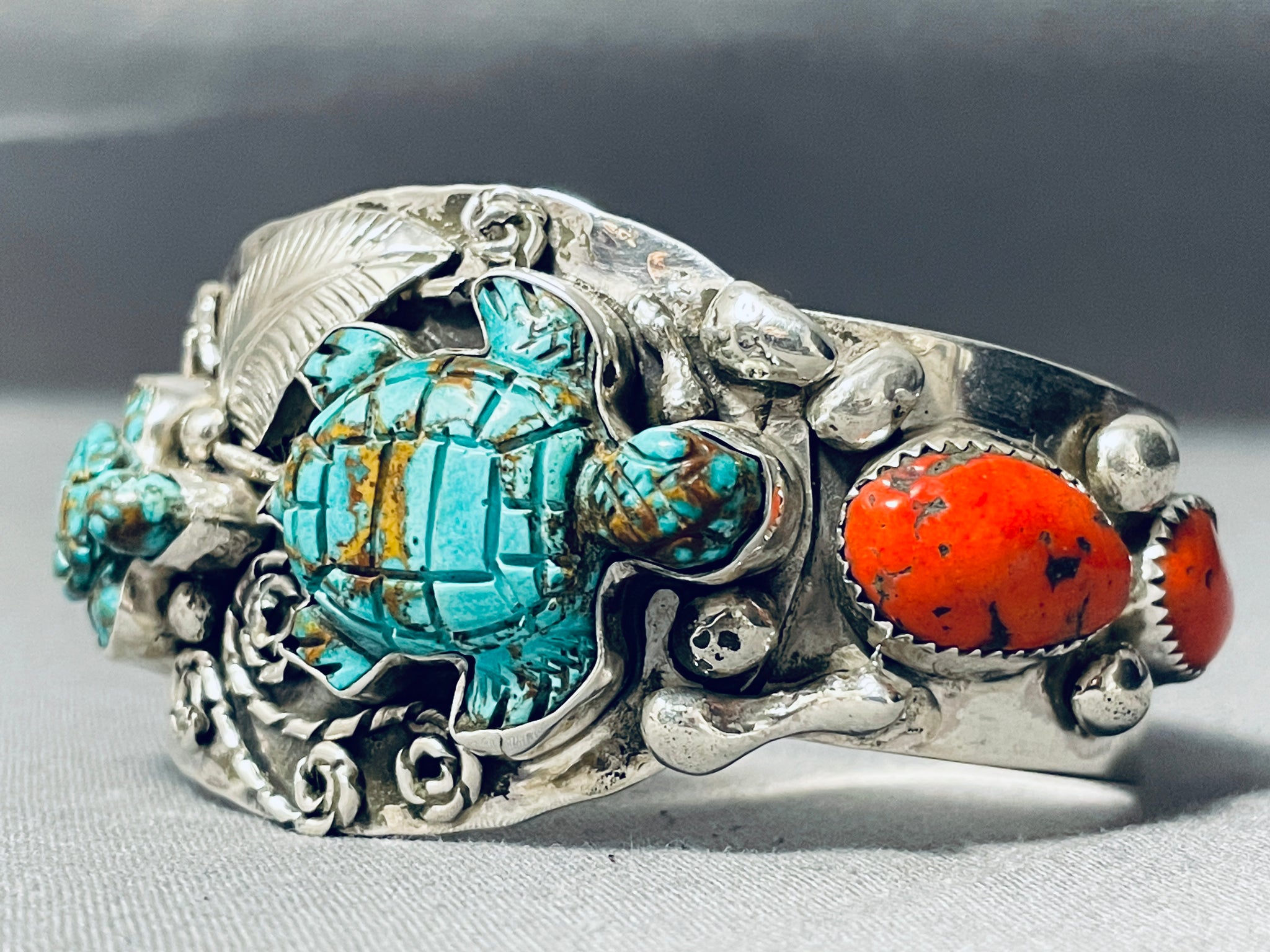 This is a superlative turquoise and coral thick silver bracelet handmade by the famous artist, Francisco Gomez. This remarkable bracelet contains two beautiful hand carved turquoise stones that are carved into turtles. Resting at one end of the cuff are superior large chunky coral stones. The largest turquoise turtle measures around 1-1/4" X 1". Resting throughout the entire bracelet are incredible silver works that consist of hand carved leaves, swirling rope stems, raindrops and chunky silver works. The cuff beautifully waves from one end to the other which is just beautiful. The width of the bracelet measures around 1-3/8". Signed by artist, Francisco Gomez. Sterling silver, marked. Cir. 1970's+. The inside end to end measures around 5-1/4" with an additional 1" gap. Sturdy 62 grams.