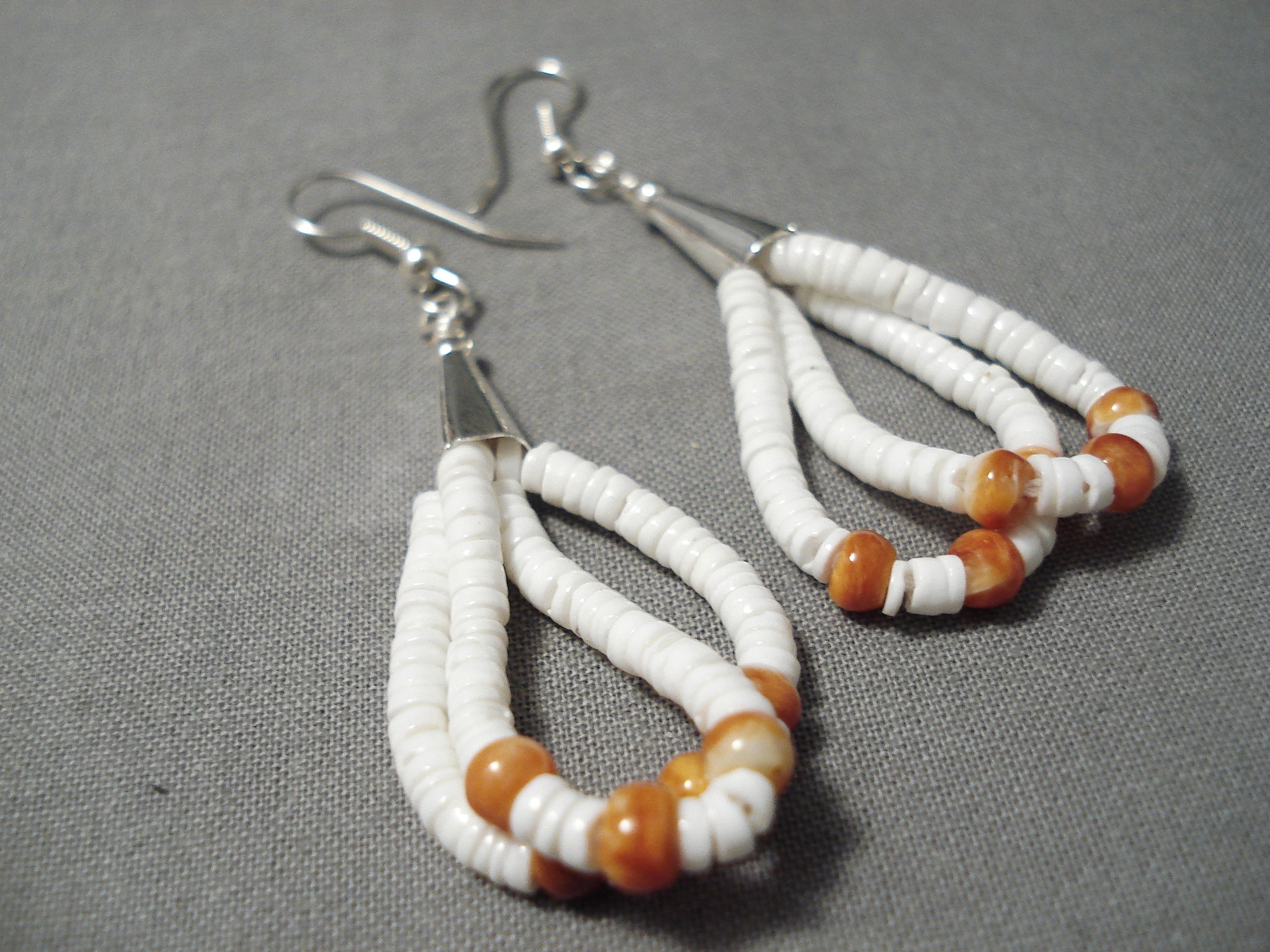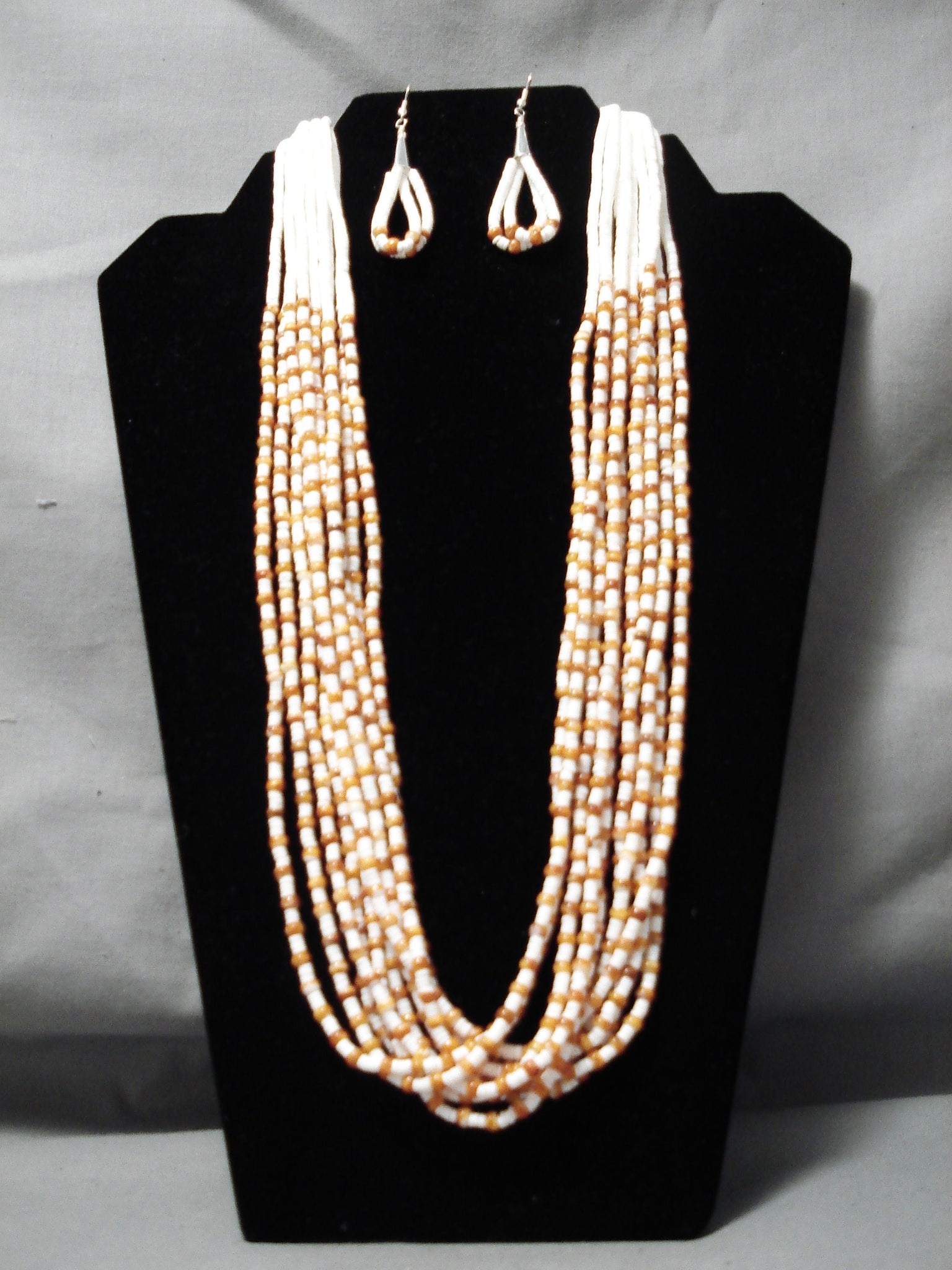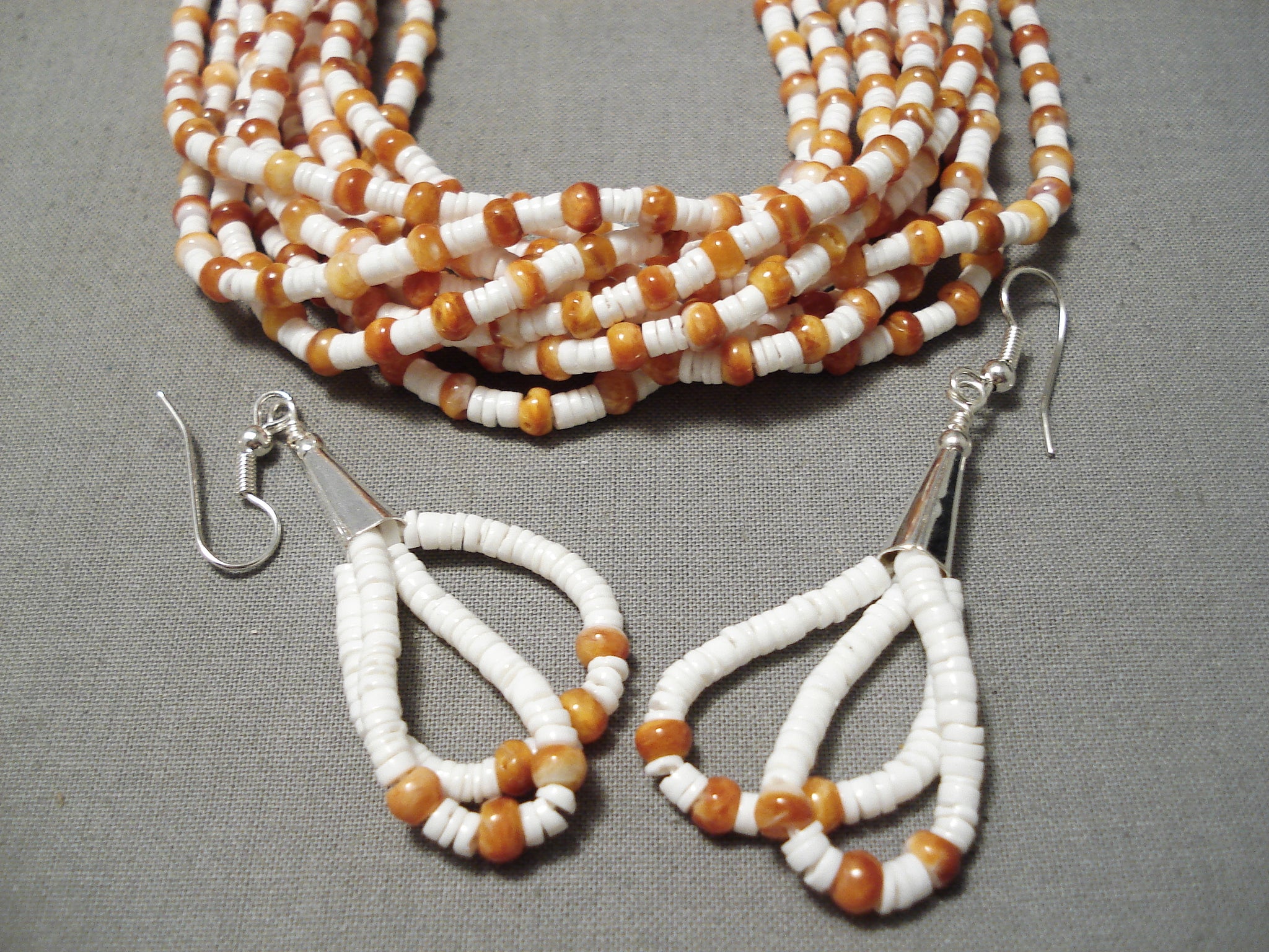 We are proud to offer this tremendous Santo Domingo necklace and earring set. This is a really unique necklace and earring set we have here! The lengthy 10-strand necklace is made up of mega amounts orange spiny oyster stones – separated and accented with white shell heishi as the strands end with additional heishi and then gather with the silver cones to meet the silver clasp that also has additional loops, nicely allowing for some length adjustability. And this incredible necklace comes with a matching pierced wire set of earrings that measure about 2-1/2” x ¾” from top to bottom. Sterling silver. Santo Domingo artist J. Coriz. The length of the necklace measures around 30". Sturdy 124 grams.