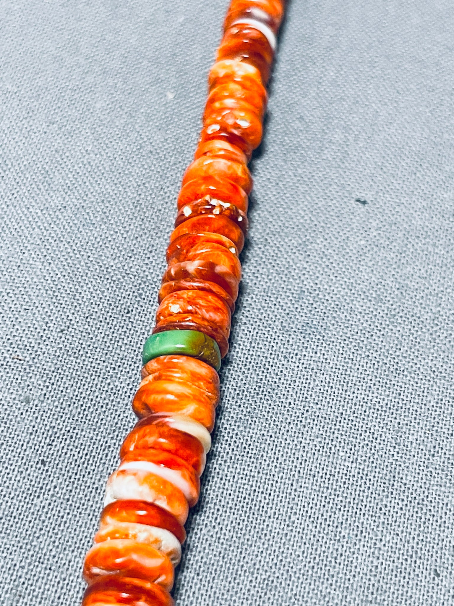 This is a striking Santo Domingo turquoise and shell necklace. This wonderful necklace contains a beautiful single strand of fabulous hand cut graduating disc shaped spiny oyster shells with accenting hand carved disc shaped Royston turquoise stones. The largest shells measure around 3/8" in diameter. Resting at the ends are silver cones with a beautiful silver link chain. Sterling silver. Cir. 1970's+. The length of the necklace measures around 28". Sturdy 37 grams.