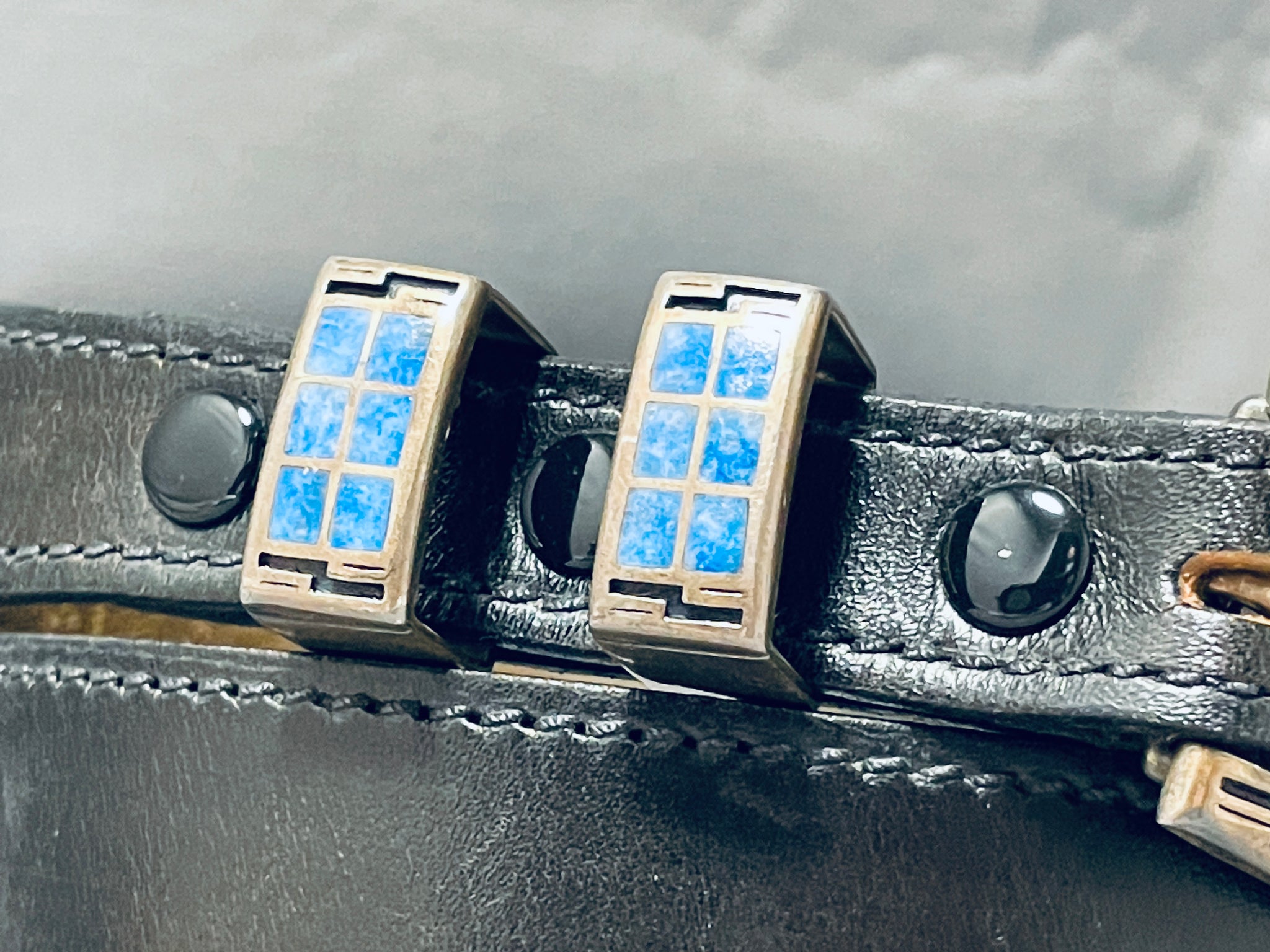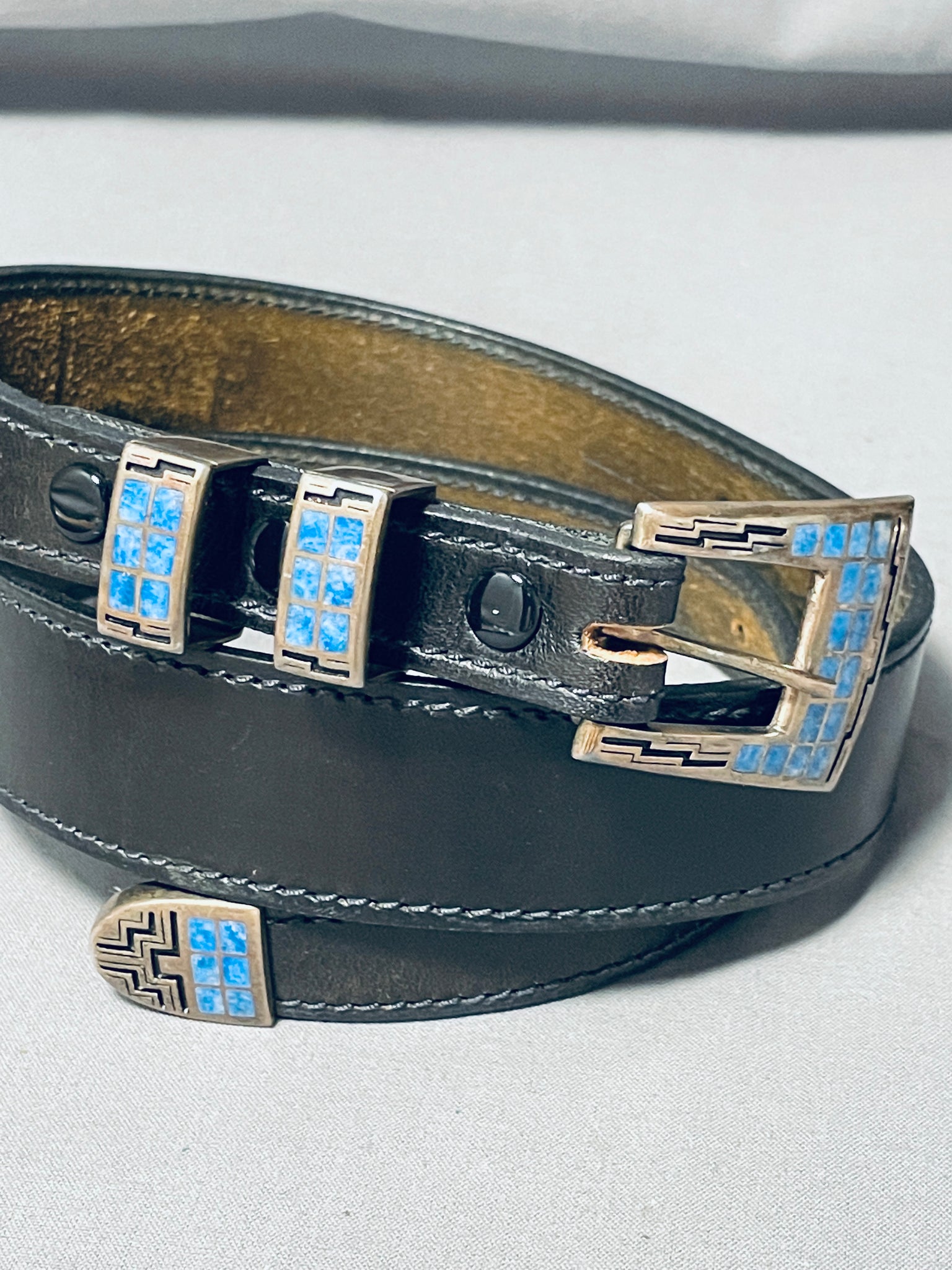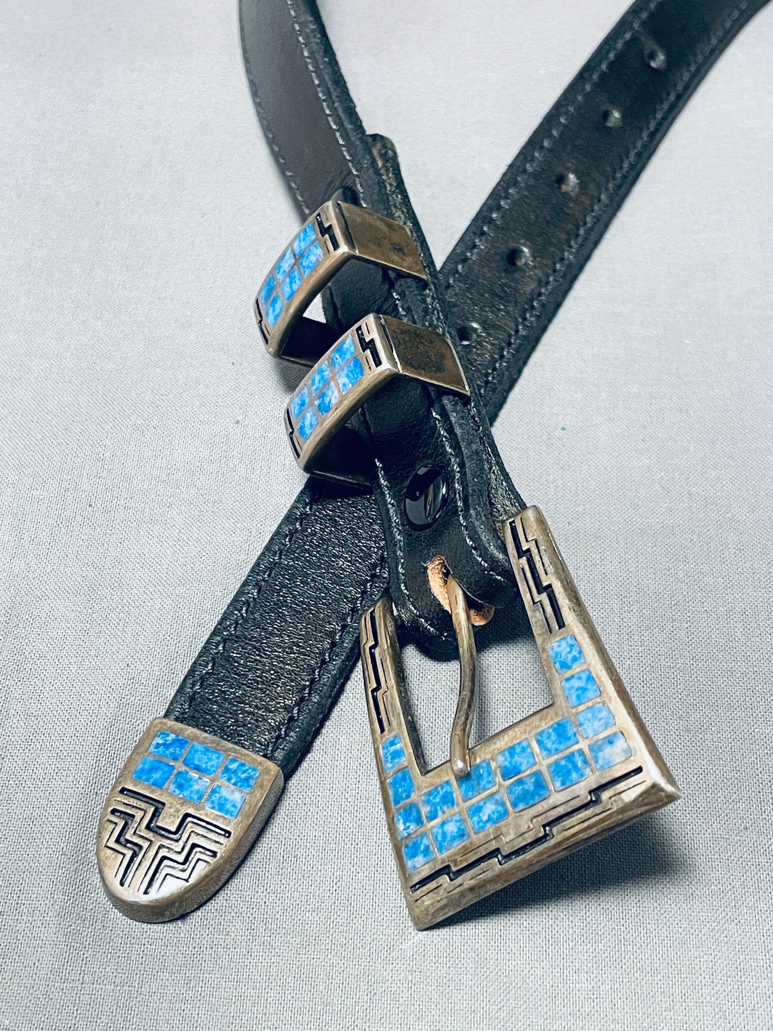 This is an incredible Native American inlaid silver ranger bukle set with an included leather belt. This phenomenal belt includes a beauitful thick and sturdy inlaid silver buckle that consists of inlaid channel lapis stones and accenting geometric patterns. The belt also includes two large thick and sturdy inlaid silver links that laso include more inlaid channel lapis stones with accenting geometric patterns and an end inlaid silver clasp with more lapis stones. The intricacy of the inlaid stones and workmanship is just superior and so precise. The buckle measures around 1-3/4" X 1-1/2", each silver link measures around 7/8" X 3/8" and the clasp measures around 7/8" X 3/4". The belt can fit a waist size of about 26-1/2" to about 33-1/2". Sterling silver, marked. Cir. 1970's+. Sturdy 110 grams.