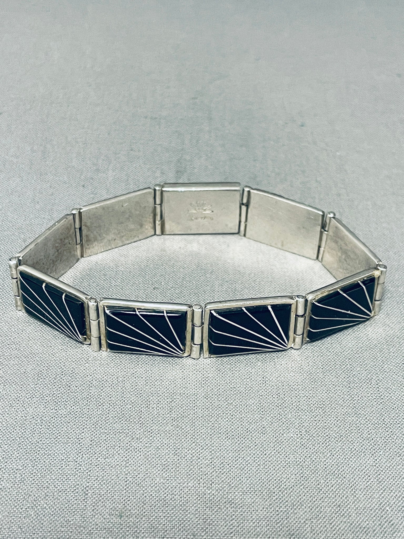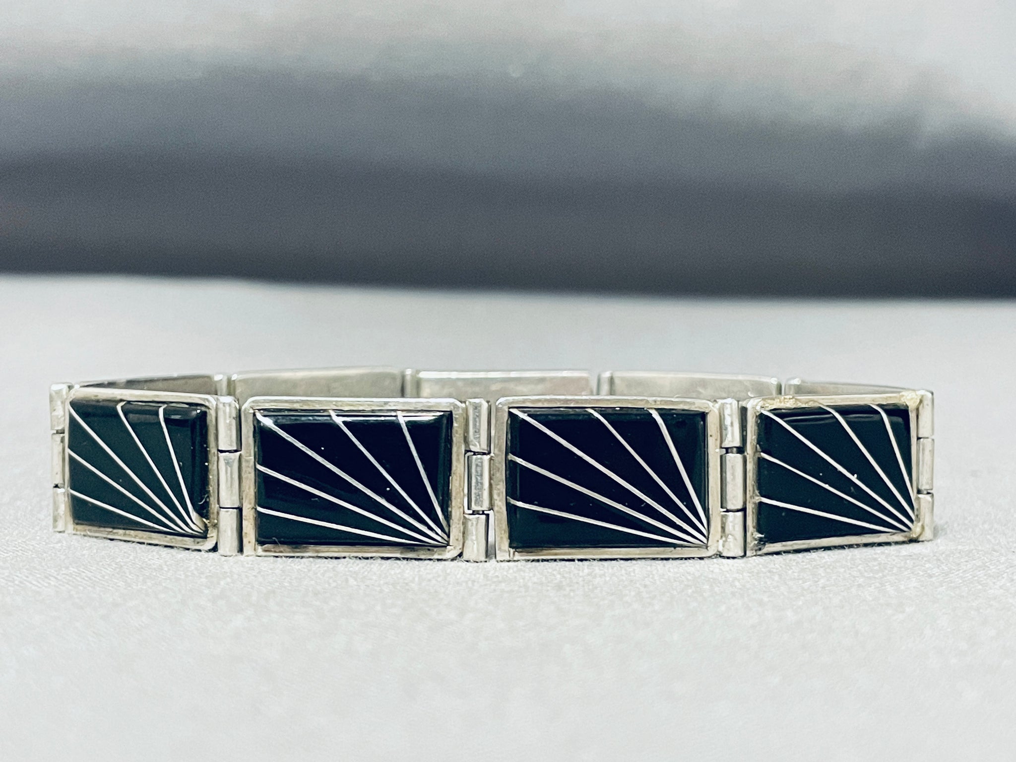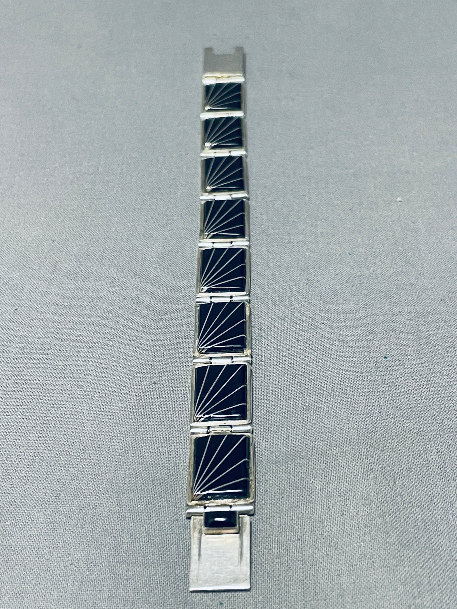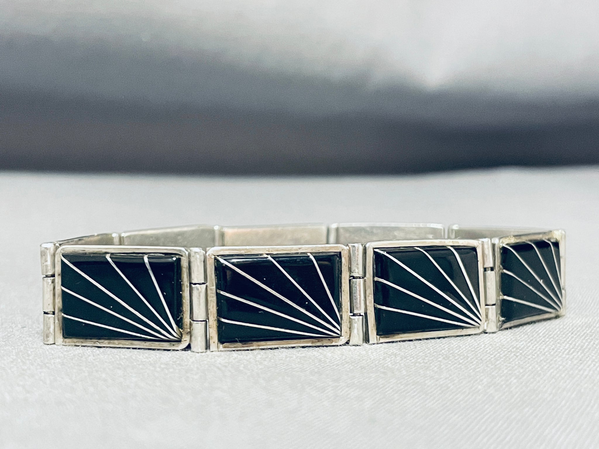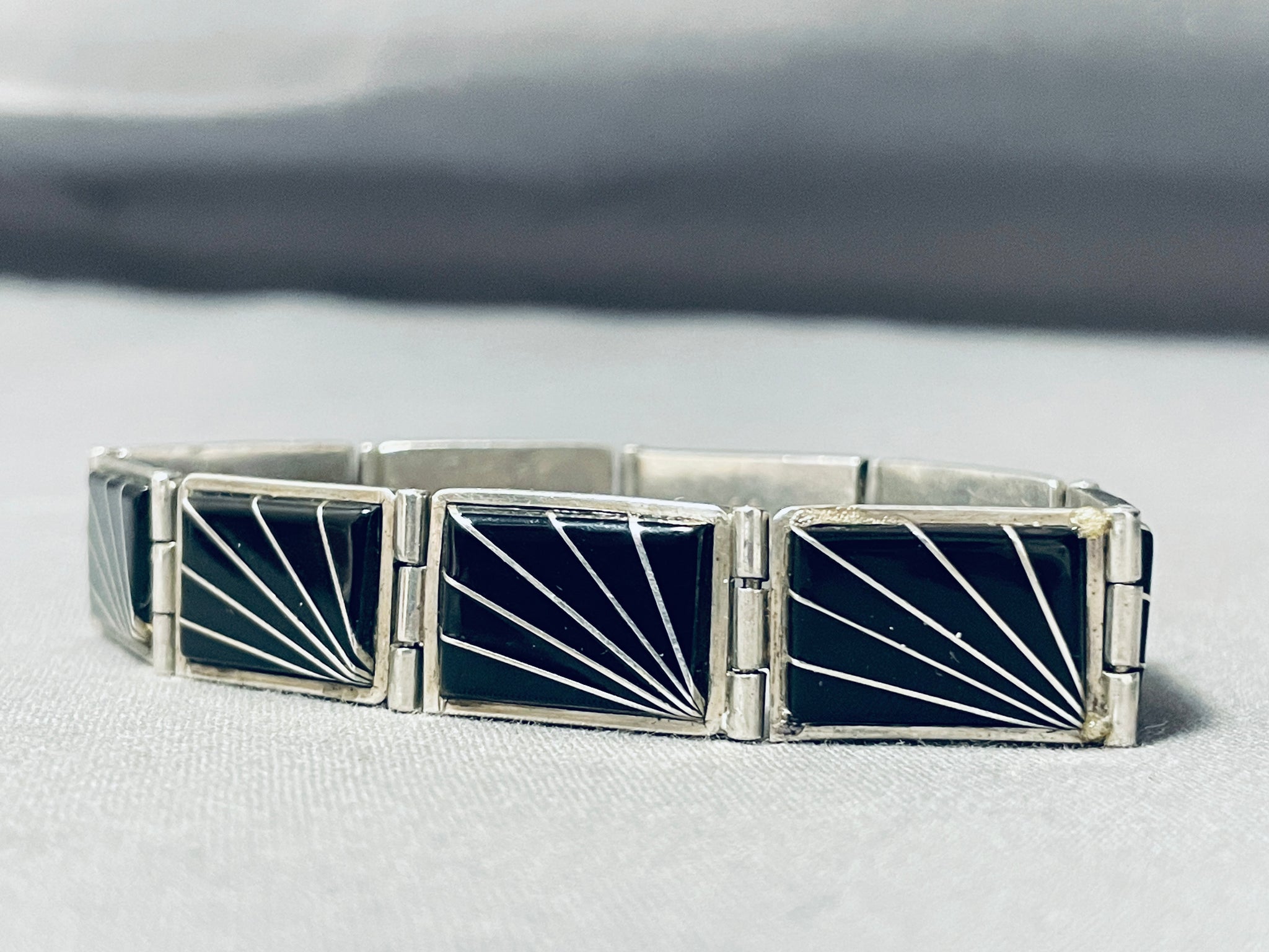 Native American Very Rare Vintage Navajo Onyx Sterling Silver Link Inlay Bracelet