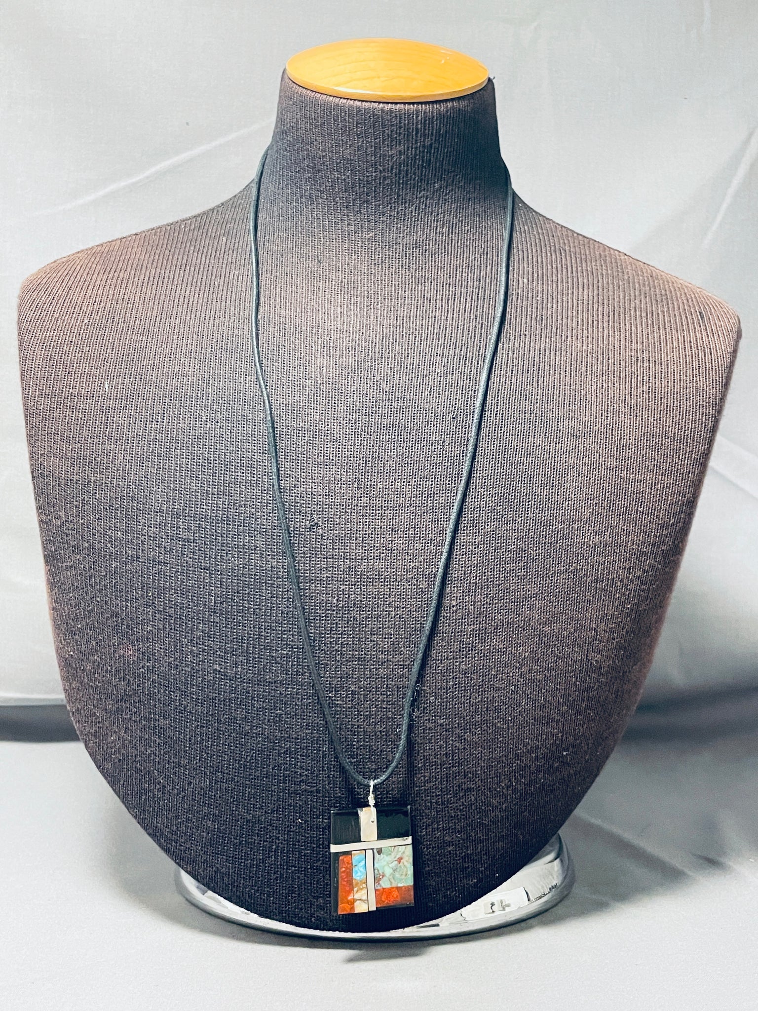 This is a wonderful Santo Domingo necklace. The fantastic rectangular shaped 1-5/8" x 1-1/8" pendant is the marvelous arrangement of colorful inlay stones that include turquoise and coral. It comes with the black leather cord necklace that's got an ingenious double knot situation that allows adjust its length by simply sliding the knots! Sterling silver. The length of the necklace measures around 26". Sturdy 121 grams.