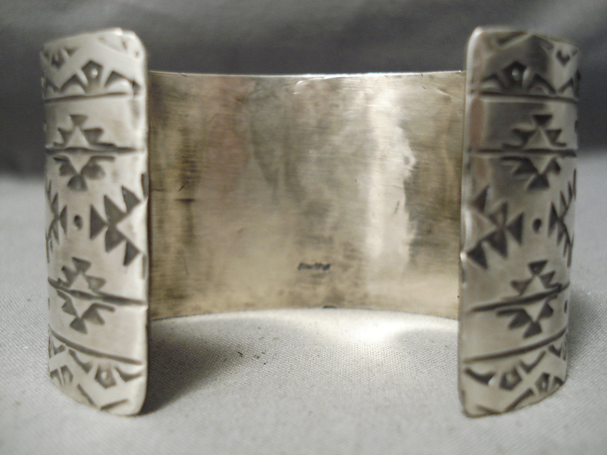 This is a tremendous large single stone silver bracelet. This wonderful piece contains a beautiful center rectangular shaped turquoise stone with spiderweb matrix. Check out the impressive intricacy of the silver works that rest on both ends of the wide and sturdy silver cuff. The silver works include mountains, geoemtric patterns, dotted works and line segments. The center stone measures around 1" x 3/4". The width of the bracelet measures around 1-1/2". Sterling silver, marked . The inside end to end measures around 5-3/4" with an additional 1-1/4" gap. Sturdy 74 grams.