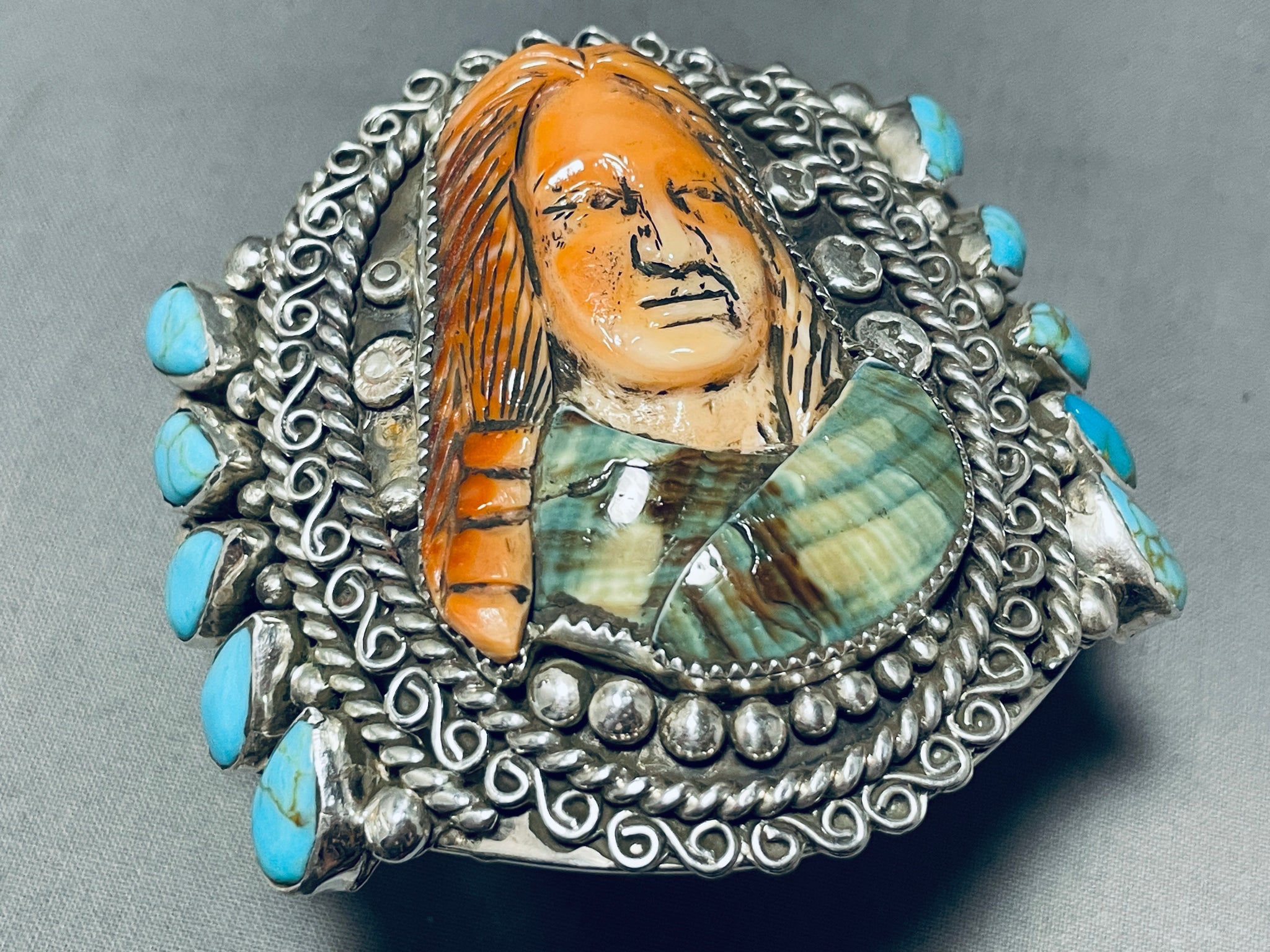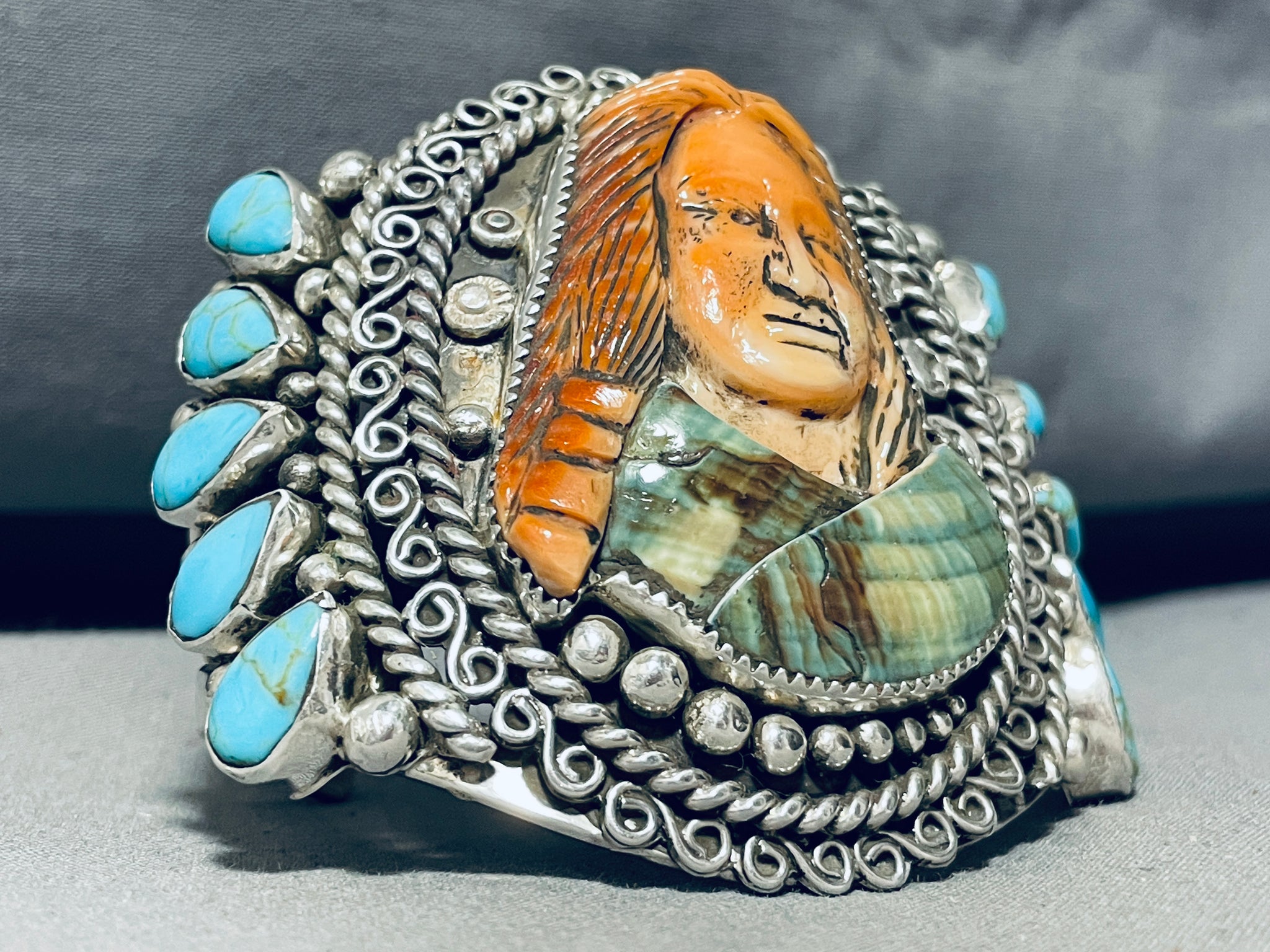 This is a magnificent Southwestern hand carved stone and shell silver bracelet. This impressive bracelet was handmade by the famous artist, Francisco Gomez who is known for his impeccable stone and shell carvings. This bracelet contains a wonderful hand carved Indian woman that consists of orange spiny oyster shell and Royston turquoise. Surrounding the carved Native woman consists of outstanding detailed silver works that include ropes, shells, raindrops and swirling stems. Resting at the sides of the bracelet are large hand carved teardrop shaped Easter Blue turquoise stones, a total of 10 stones. This bracelet contains a marvelous sturdy and thick triple silver shank cuff that graduates in width towards the center. The center hand carved stone and shell Native woman measures around 2" X 1-1/2". The width of the bracelet measures around 2-5/8". Signed by artist, Fran Gomez. Sterling silver, marked. The inside end to end measures around 5-1/2" with an additional 1-1/4" gap. Sturdy 99 grams.